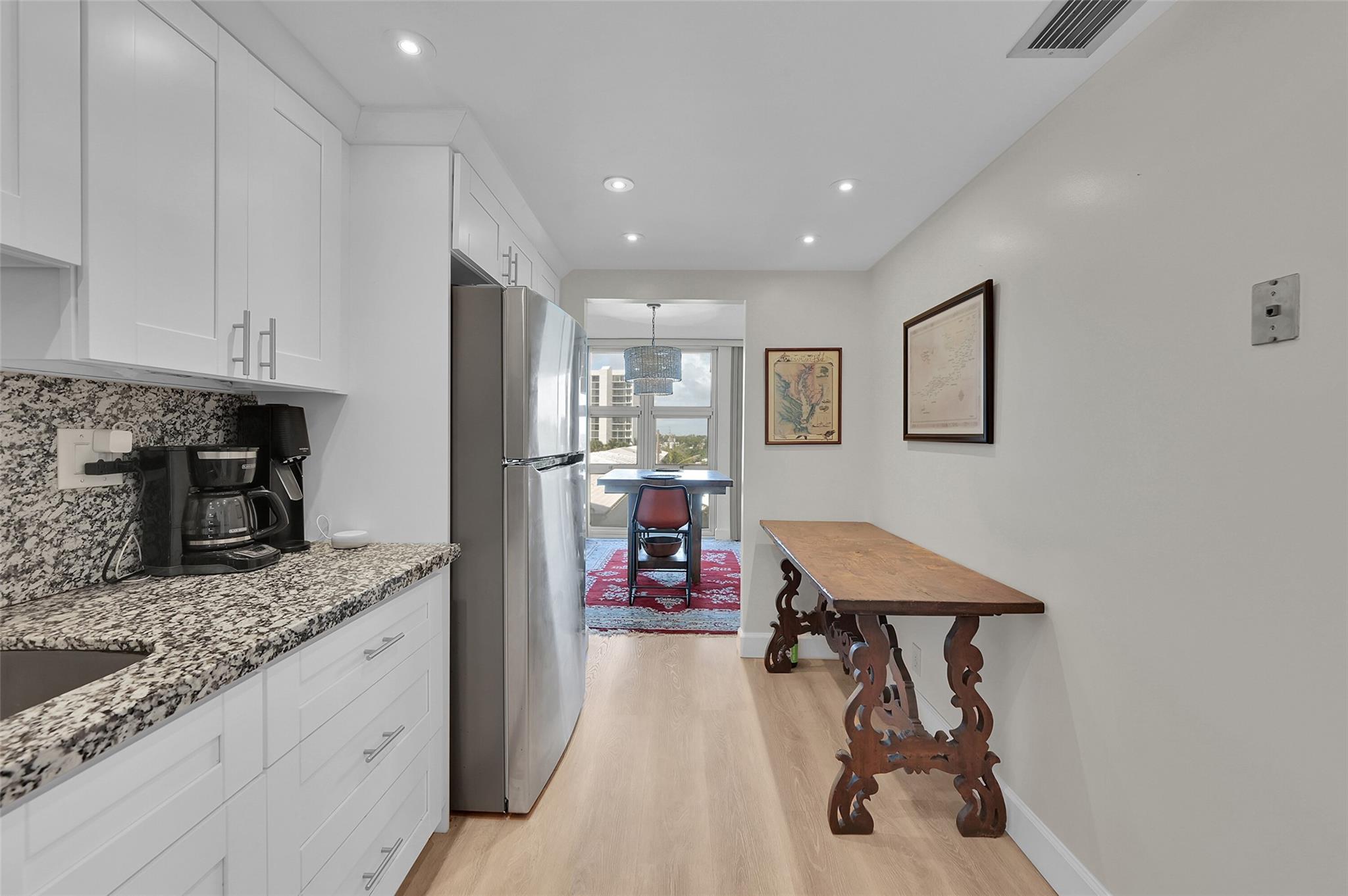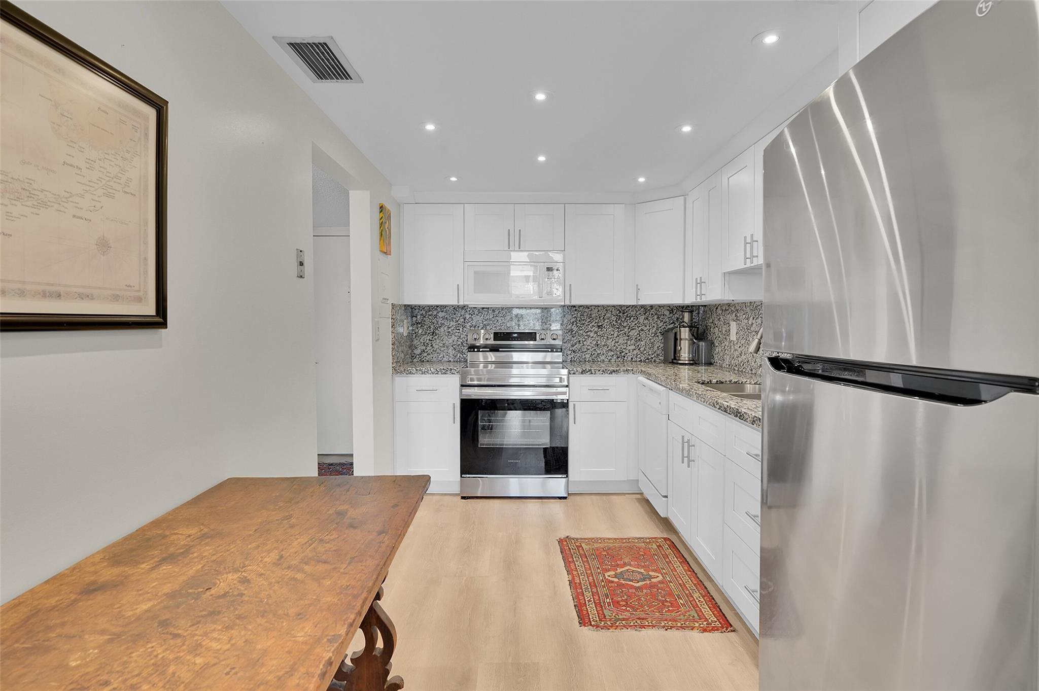 Newly remodeled corner unit with floor to ceiling hurricane impact windows and slider to the balcony. Kitchen has white cabinetry, granite counters and stainless steel refrigerator & stove. Updated bathrooms, new a/c, spacious floor plan, ample closets, separate storage space and 1 covered garage parking space. This fourth floor location is steps to the amenities deck with a heated pool, sun deck and new covered barbecue area. Silver Thatch also offers 24/7 security, tennis, pickleball courts, bocce, fitness center and sauna. Prime location walking distance to the fishing pier, restaurants, shopping and a short drive to boating, golf, and more.