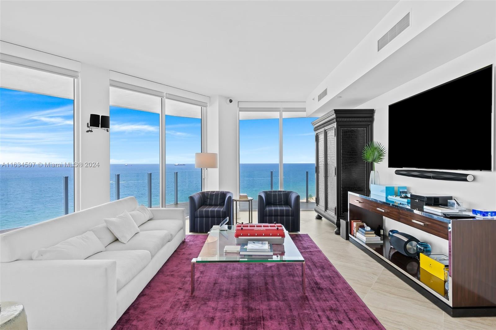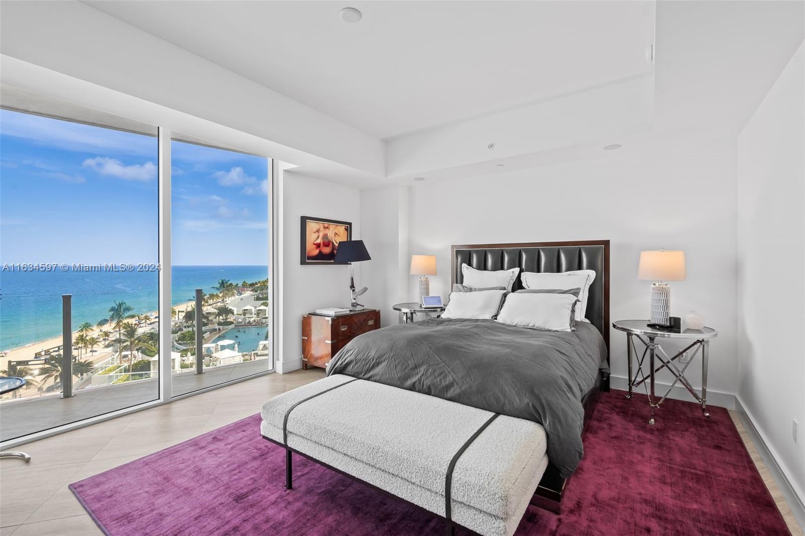 This unique unit offers an unparalleled experience, floating above the ocean with unobstructed, direct views of Fort Lauderdale Beach. Featuring 2 bedrooms and 2.5 bathrooms, you'll be greeted by breathtaking ocean views as soon as you enter. Every room boasts dramatic floor-to-ceiling glass windows, while the open kitchen and living space provide stunning 180-degree ocean views. Explore the wraparound terrace stretching the entire width of this residence, accessing all rooms and living spaces. The kitchen is equipped with custom cabinetry and top-of-the-line appliances, while the double master layout ensures optimal privacy for you and your guests with custom LED-lit closets and elegantly designed marble bathrooms.