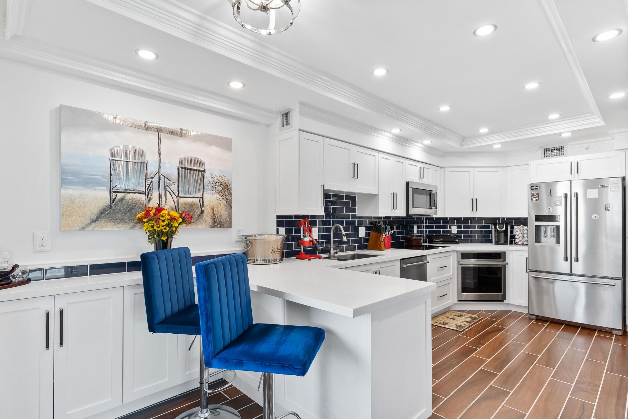 Immaculate oversized 2+2.5 Penthouse with rare see through views in living area of Ocean and Intercostal. Fully remodeled Kitchen including appliances; wainscoting; glazed subway tile; natural wood like porcelain tile flooring; plus comfortable breakfast bar, enhances this one of a kind kitchen. The custom coffered ceilings in living room and dining room, blends retro with elegance. Enjoy your evening views from your penthouse balcony or from every room inside your home. Each bedroom has a private ensuite. Primary ensuite has dual sinks, sinking tub and a private shower. Guests will welcome the custom powder room. Every room showcases one of a kind design. Pickle ball; tennis courts; workout room; community patio; and winding pool are just a few of the amenities. Pride of ownership shows.