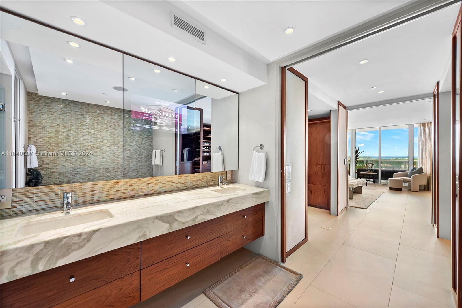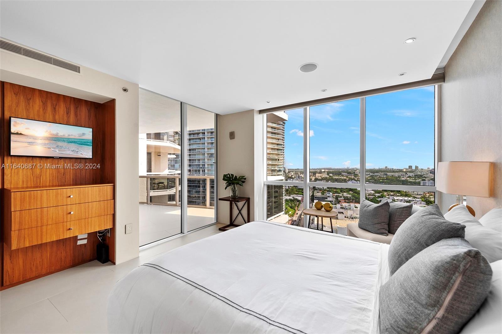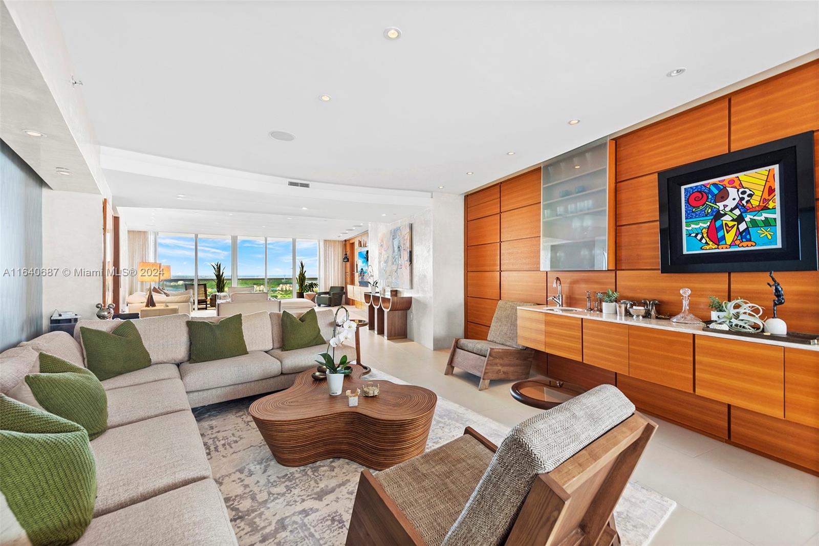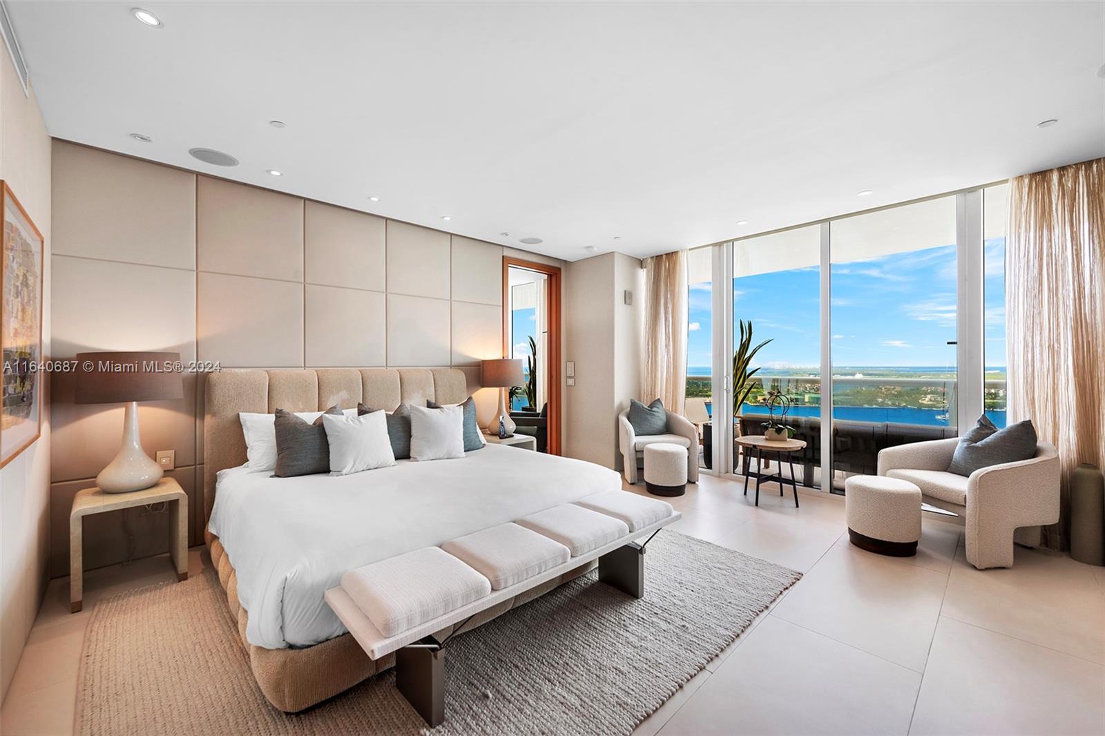 This rarely available 04-line flow-through residence offers stunning sunrise and sunset views, an open floor plan, and in-wall speakers in every room. The living area features intricate millwork and two elegant sitting areas, perfect for entertaining. The master suite includes a rain shower with jets and an in-wall mirror TV in the bathroom. Located in the sought-after South of Fifth neighborhood, this 3,000 sq. ft. home showcases floor-to-ceiling glass windows, Sub-Zero and Miele appliances, and breathtaking views of the ocean, bay, and city. Murano Grande offers luxury amenities, including a full-service pool, lighted tennis court, 24-hour valet, and concierge services, all within walking distance to South Pointe Park and top restaurants.