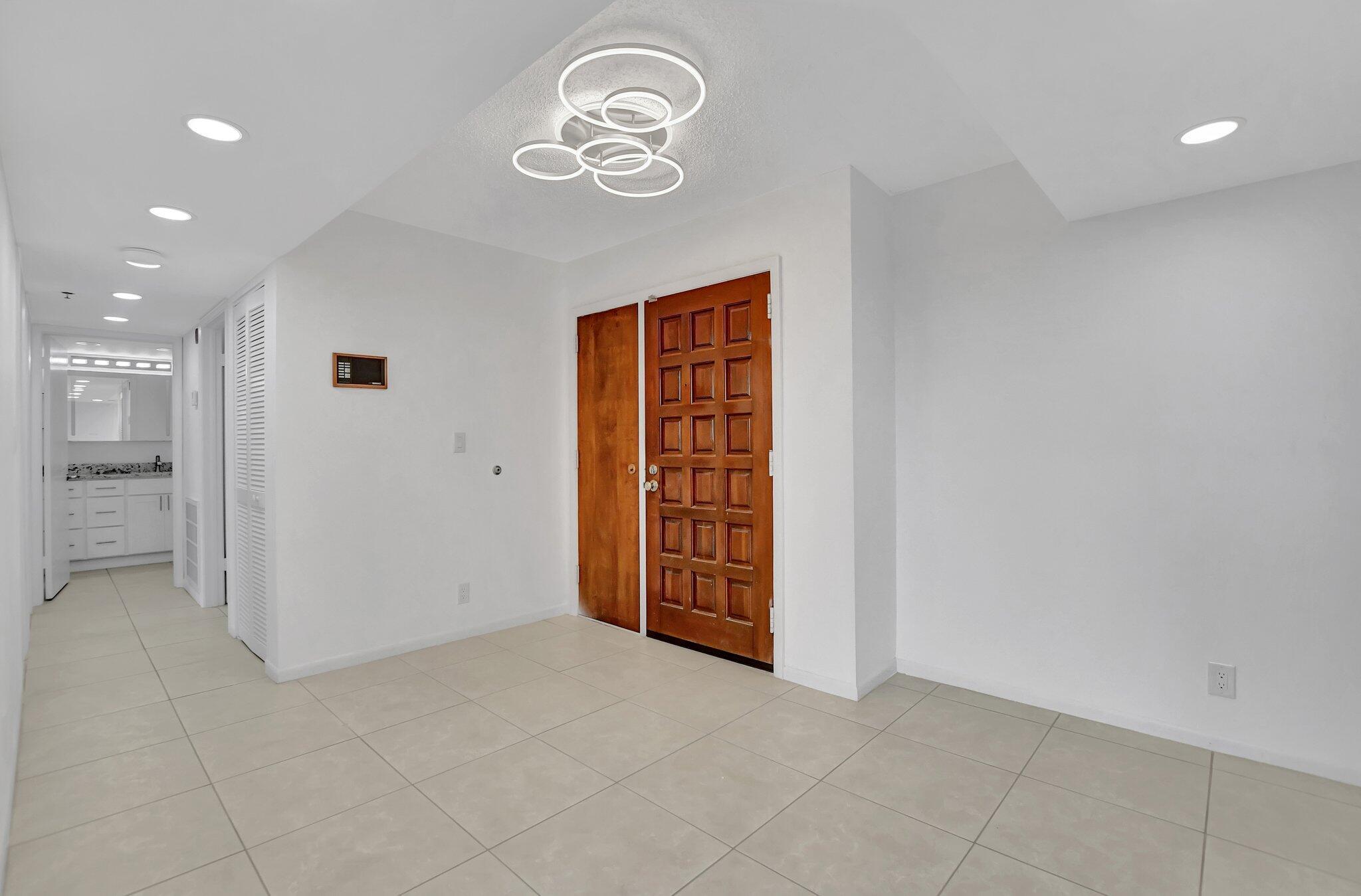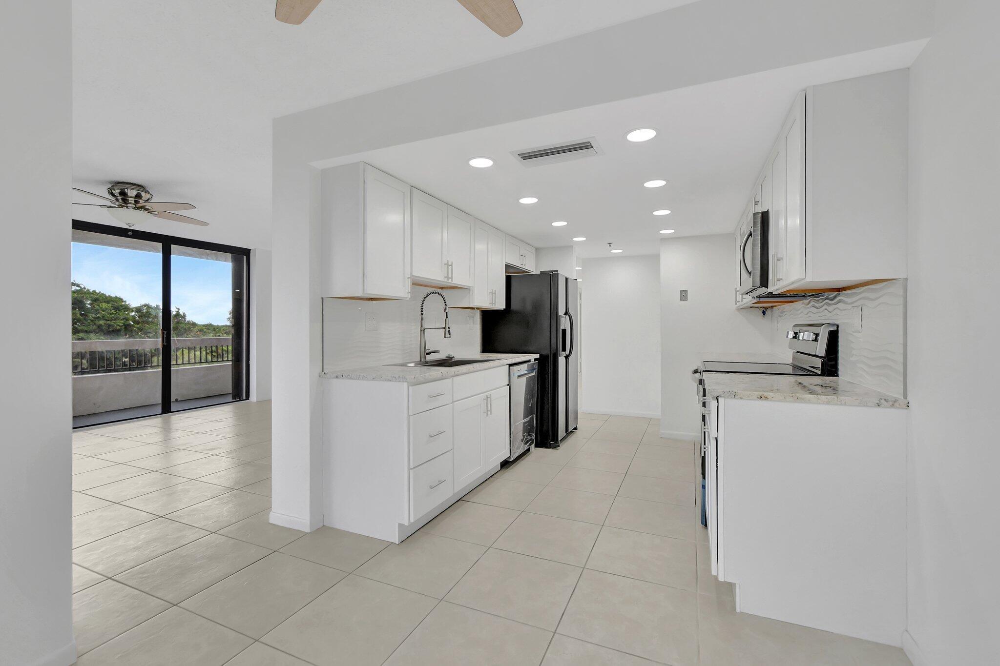 THIS IS THE ONE! Pristine remodeled condo. New never used kitchen, appliances and bathrooms. New lighting and many additional Hi-Hat lighting added. Freshly painted. Brand new Washer and Dryer. Large master bedroom with two closets. Wrap around balcony for whole unit. Two cars allowed per owner. Great pool area. Building just renovated along with new roof. Accordion hurricane shutters.