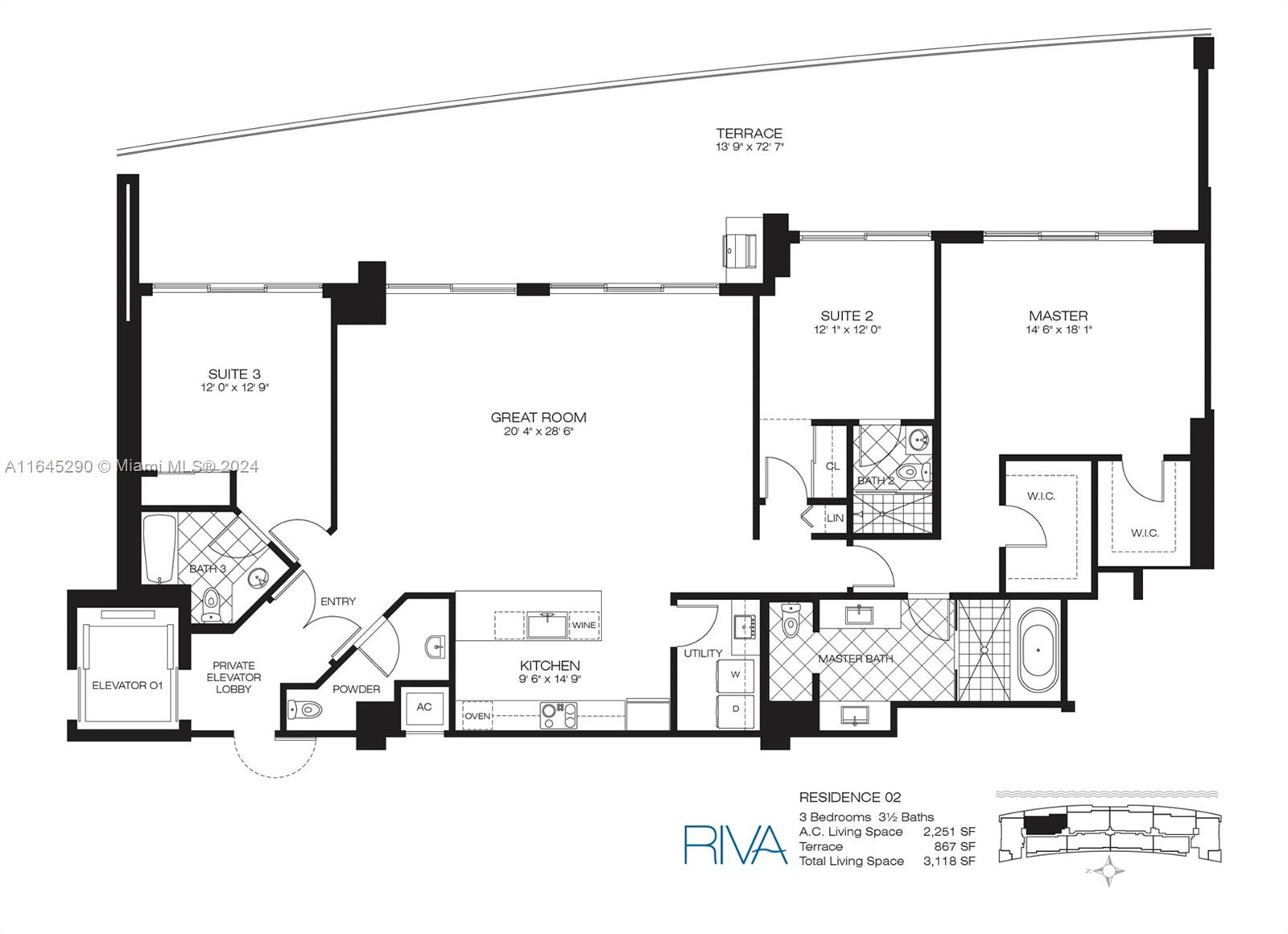 Ultimate Indoor/Outdoor Lifestyle in this Exquisite Waterfront RIVA Residence, Offering Breathtaking Ocean, Intracoastal & Middle River Views from Every Room as well as Your Private Terrace w/BBQ. Most Desirable 02 Plan Features 3 Bedrooms, 3.5 Bathrooms, Custom Upgrades & Stylish Lighting. Chef's Kitchen Equipped w/Wolf Gas Cooktop, Sub-Zero Fridge & Wine Cooler. Spacious Primary Suite Boasts a Custom Walk-In Closet. Private Elevator Entry, Laundry Room, 2 Parking Spaces, 2 Lockers. 40,000 SF of Amenities: Heated Pool, 7,000 SF Gym, Yoga, SPA w/Sauna, Steam & Massage Rooms, Resident's Lounge, Sunset Deck w/Jacuzzi, Cucina, 3 Suites for Guests, 24/7 Front Desk, Valet, 2 Dog Walks & 400' of Waterfront. Centrally Located, 1 mile from the Beach, Shopping & Las Olas Blvd. Boat Slips Available.