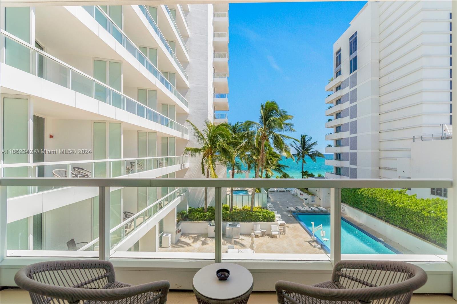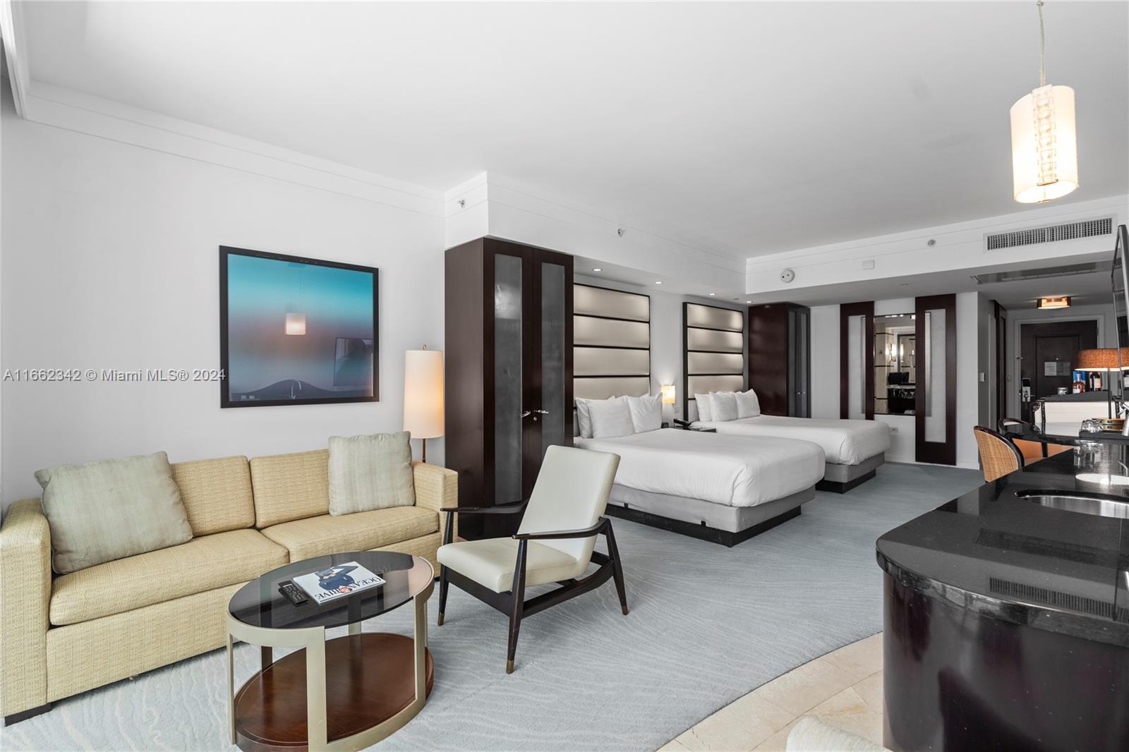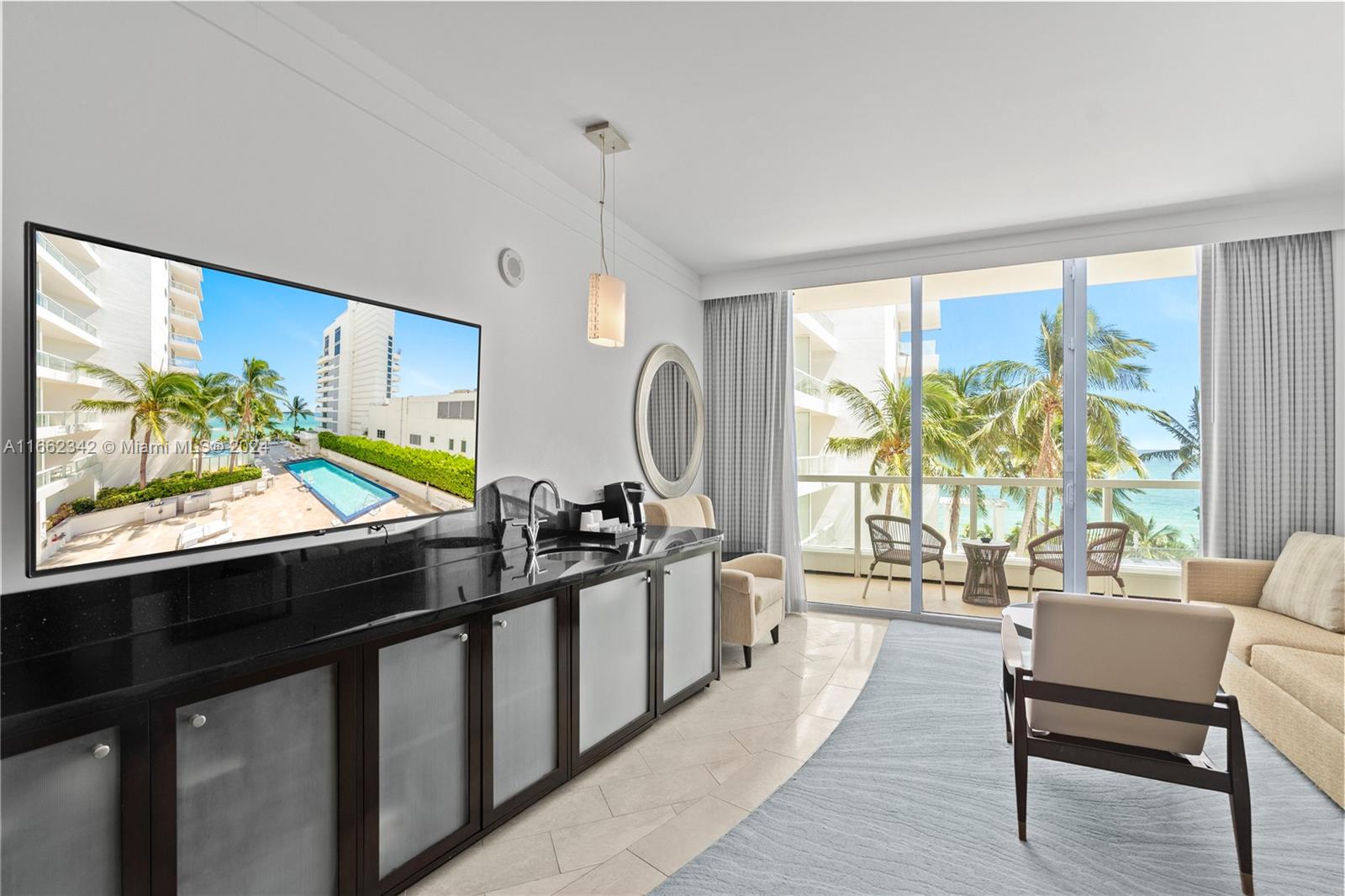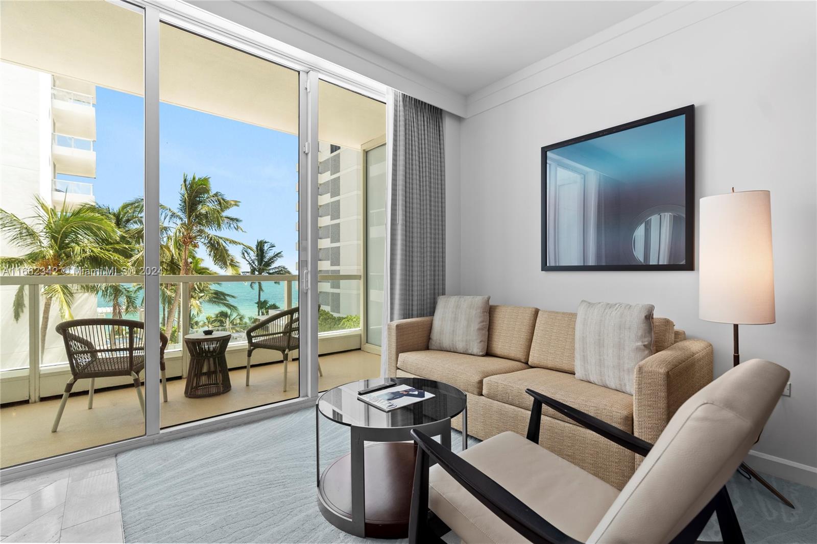 Stunning Fontainebleau III Jr Suite with unobstructed direct ocean and pool views. This unique apartment comes furnished, turnkey with 2 queen beds and a sleeper sofa; sleeps 6 people. Option to enroll in hotel rental program & receive income while away! Enjoy full service, vacation-style living! (Door in unit connects to the #720 unit next door that is also available for sale.) The Fontainebleau resort offers award-winning restaurants, LIV night club, Lapis spa & state-of-the-art fitness center, bakery, shops, full-service salon and more. Maintenance fees include all utilities: AC, internet, cable, local calls, electricity, valet + daily free breakfast in owner's lounge.