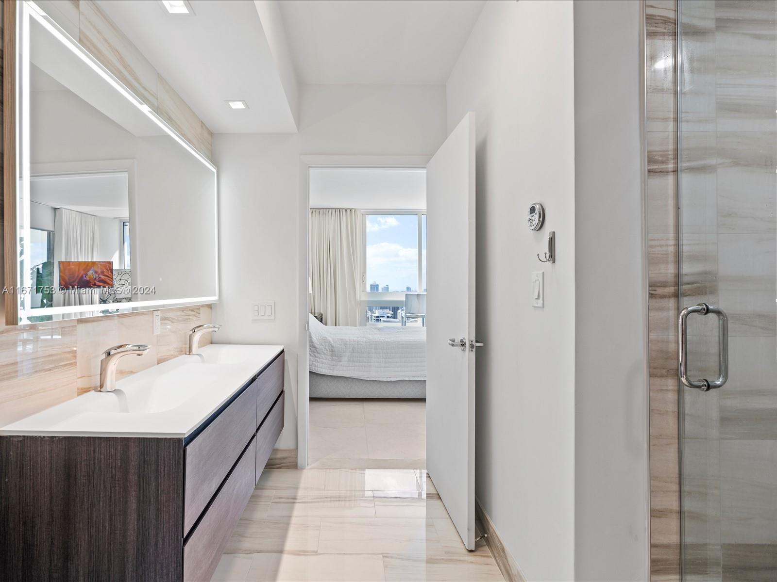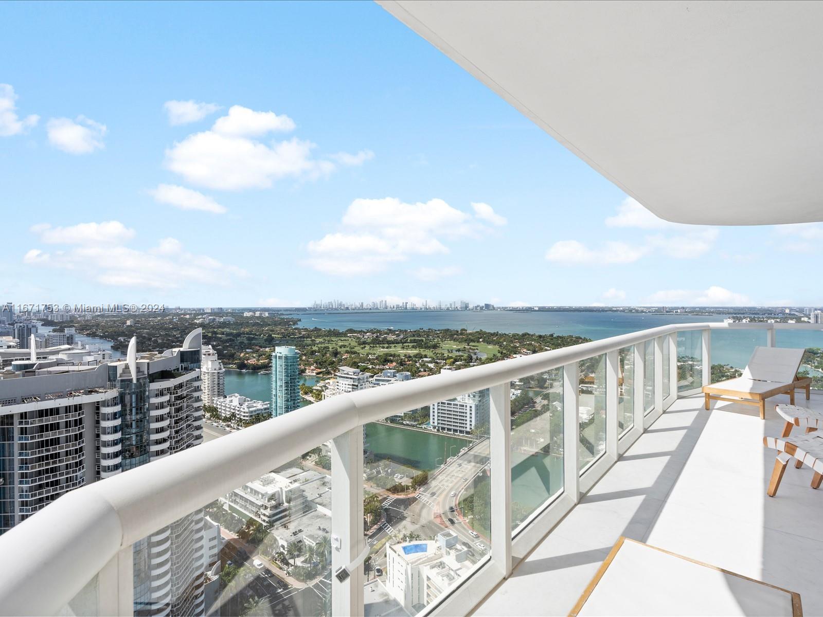 Magnificent views of the ocean, intracoastal and Downtown Miami. Astonishing sunrises, amazing sunsets! Endless views as far as the eye can see characterize this exclusive oceanfront unit. Featuring white marble floors throughout, high end furnishings and a gorgeous private wrap around balcony with glass railings, floor to ceiling windows and sliding glass doors. The luxurious primary suite, highlighting the tastefully just renovated bathroom, is separated from the living area by a solid glass wall. There are exquisite white silk curtains which, when closed, provides ultimate privacy. When open, beautiful panoramic views of the Atlantic Ocean and intracoastal can be enjoyed upon waking or while relaxing in bed.