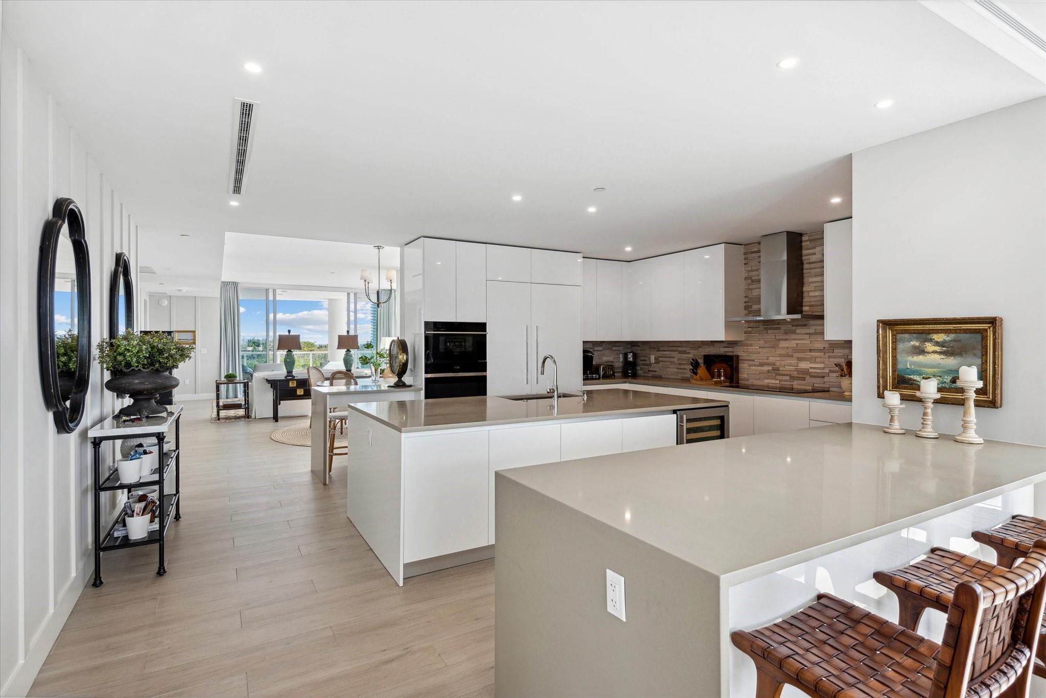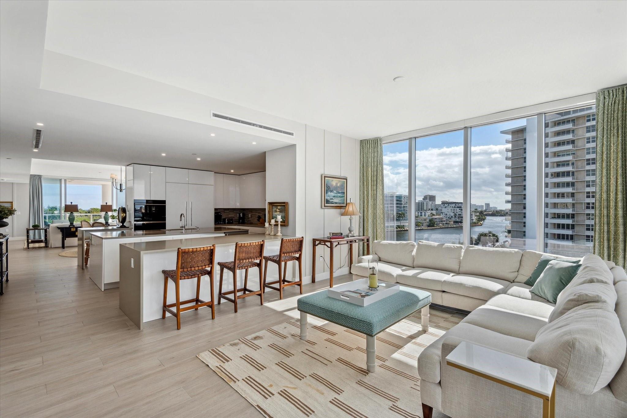 Located directly on the Intracoastal Waterway, Aquablu consists of 35 luxury residences. This flow-through SE corner unit offers sweeping views of the water/historic Bonnet House/City skyline from the impressive balconies. Private double door foyer entry opens to a great room with 10' ceilings & glass walls, highlighting the views & bathing the space in natural light. Professionally designed touches abound in the open-concept living/ dining spaces. The chef's kitchen boasts high-end appliances with a massive island, walk-in pantry, & immense counter space. Wake up to amazing sunrises from the Primary suite, which overlooks the water with a spa bath & 2 large walk-in closets. 2 additional en-suite bedrooms & two assigned covered parking spaces are located near beaches, shopping, & dining.