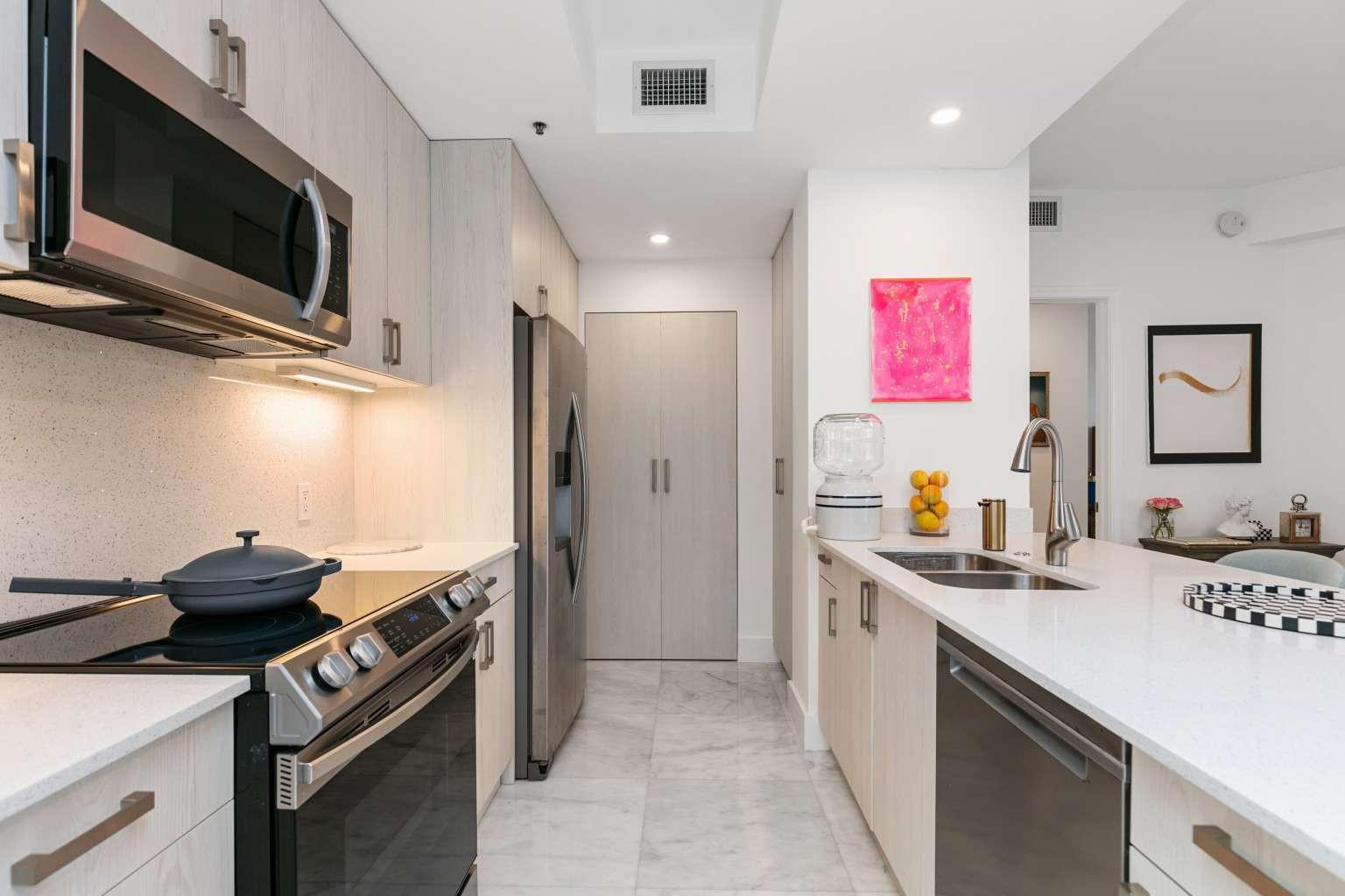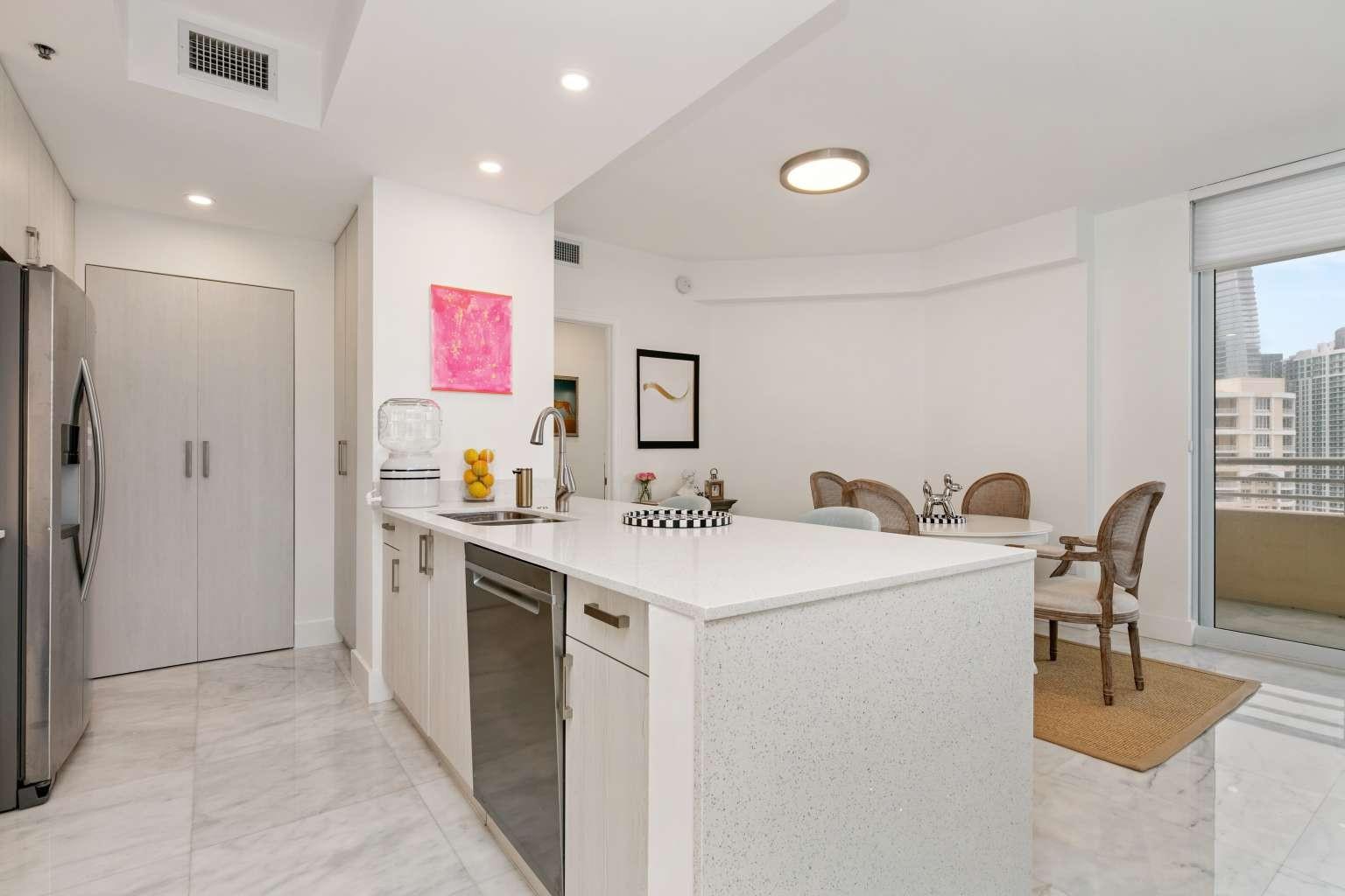 Prime location, beautifully renovated, and priced to sell! This spacious 1-bedroom, 1.5-bath condo (959 sq ft) is move-in ready and located in the luxury community of Brickell Key. Enjoy breathtaking views of Biscayne Bay, the Port of Miami, the Miami River, and the vibrant city skyline. Recent renovations include elegant marble flooring and countertops, custom cabinetry in the kitchen and bathrooms, modern lighting, and updated air conditioning. The resort-style building offers extensive amenities: tennis courts, gym, basketball and squash courts, pool, jacuzzi, BBQ areas, an events room for gatherings, and more. Pet-friendly and an absolute must-see!