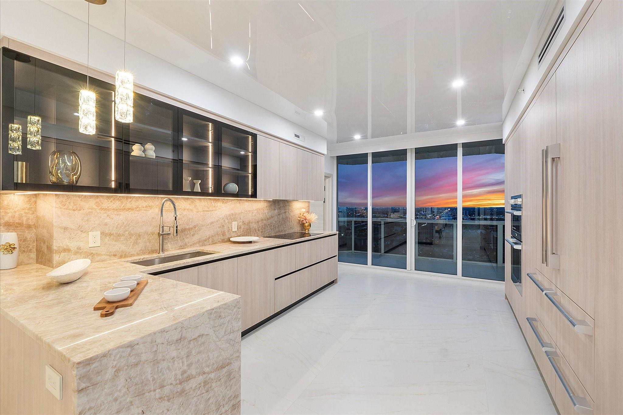 High Floor BRAND NEW Direct Ocean Fully Furnished Custom 3 Bedroom /3.5 Bath Home with ItalKraft cabinetry throughout: Open Flow Through with stretch ceilings. Custom Kitchen with Taj Mahal Slab countertops, 48" inch fridge w/4 freezer drawers, 36" induction range, steam oven, more. 4'x4' porcelain slab flooring inside and out. Primary Suite features large custom closet, New Bathroom featuring porcelain slab walls and custom vanities. 2nd & 3rd Suite features similar features. Extra powder room for guests. 2 balconies for sunrise & sunset, private elevators, glass front doors. L'Hermitage offers over 10 acres of Oceanfront/Beachfront property with tennis, fitness, fenced complex, attended beach, pool deck cafe, spas, saunas, steam rooms, massage rooms, amazing walkability & pet friendly.