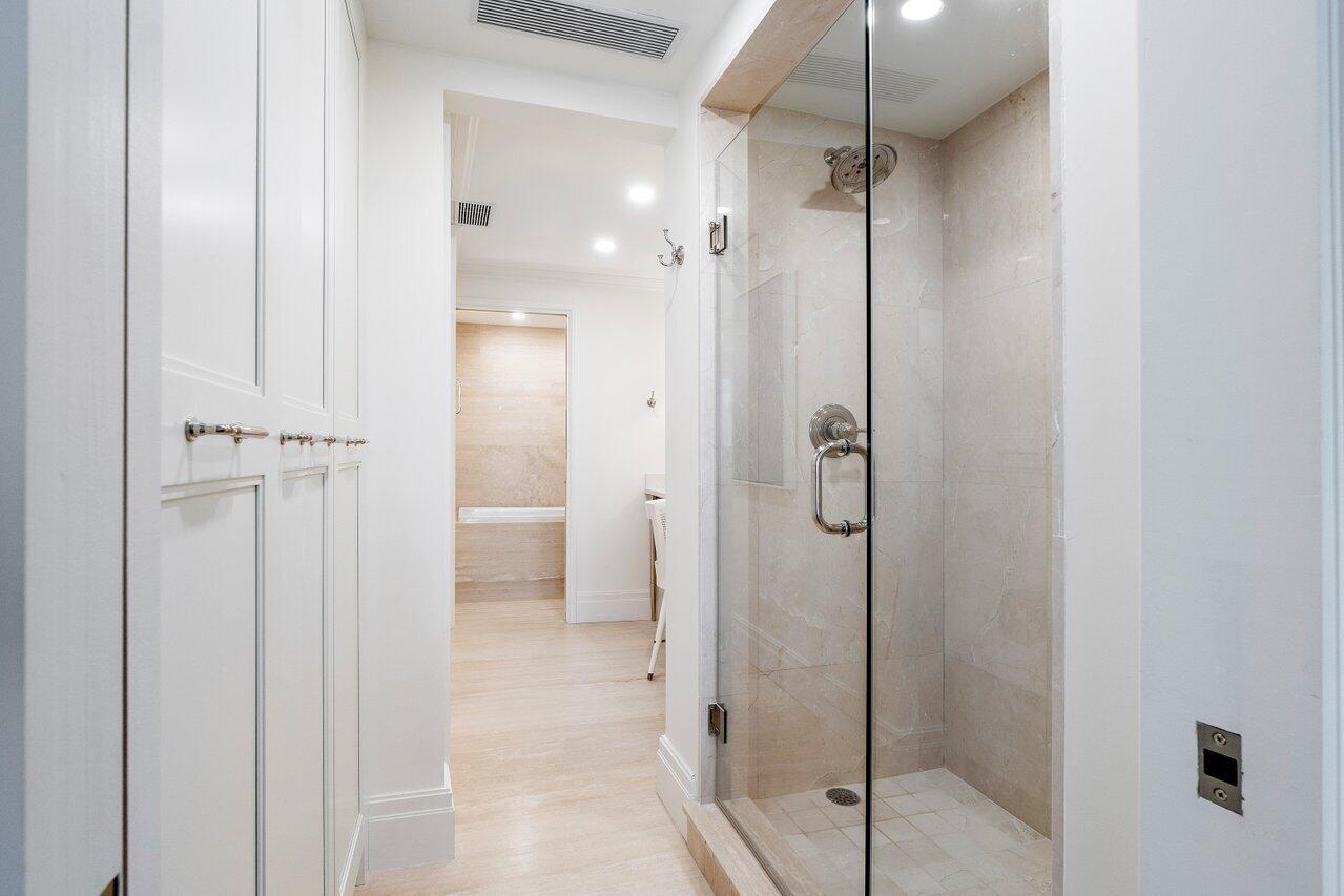 Expertly renovated by award-winning designer James Michael Howard, this high-end, generously proportioned, 1-bedroom, 1.5-bathroom condo sits gracefully on the 6th floor, boasting expansive, breezy panoramic vistas of the city within one of Palm Beach's most sought-after full-service residential buildings, Sun & Surf, making it an ideal choice. The modern interiors showcase exquisite craftsmanship, featuring custom millwork gracing every corner, elegant limestone and white oak floors throughout and linear diffused AC. A herringbone porcelain tile backsplash adds a touch of sophistication to the quartzite kitchen and is equipped with high-end appliances, perfect for culinary enthusiasts. Both bathrooms are adorned with luxurious terrazzo countertops, while the primary bathroom includes
