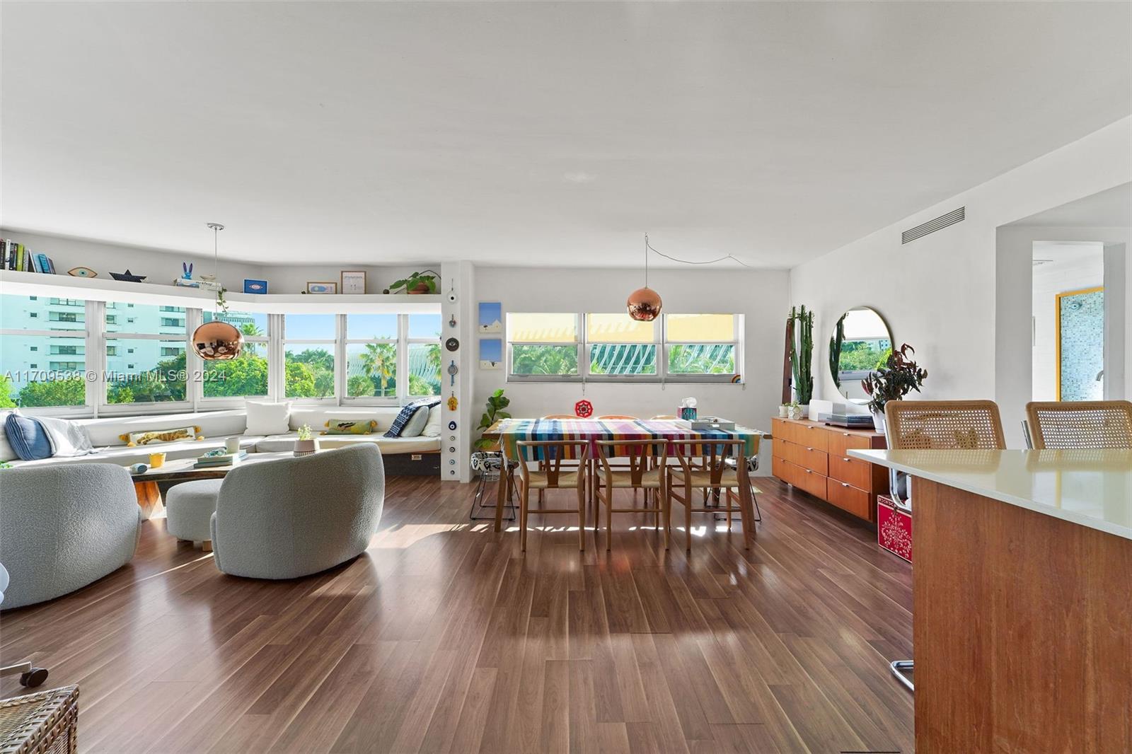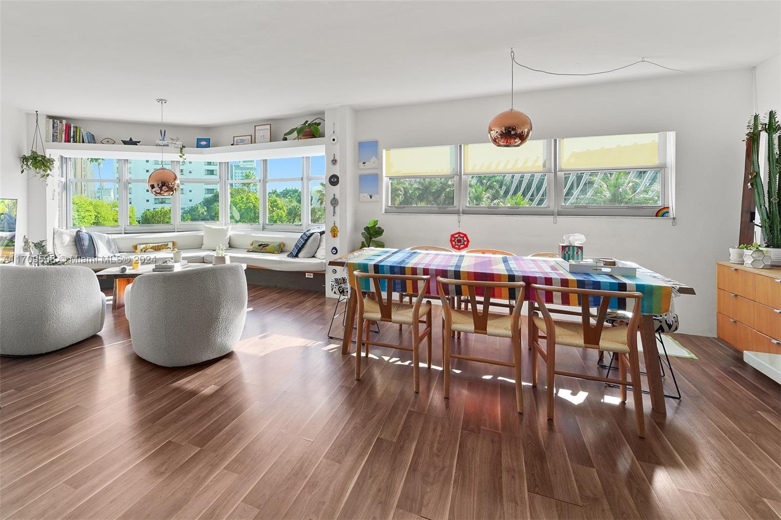 Short-term rentals to be permitted! Sun-kissed, south-facing modern condo steps from the beach, bathed in sunlight all day. Renovated in 2015 with clean modern lines, built-in couches along a wall of windows, a dining area for ten, galley kitchen w/ bar seating, and large pantry. Bedroom features custom walnut, teak, and birch cabinetry, a queen-size Murphy bed, & a walk-in closet with adjustable shelving and locking mirrored wardrobe. Whisper-quiet hurricane-impact windows installed in 2023. Unit includes dedicated parking. Octagon Tower, a classic mid-century building, offers a 24-hr doorman, outdoor pool, small gym, and a welcoming vibe. In the Hotel Zoning District, 30-day rentals are currently permitted, with lucrative nightly rentals once compliant. Special Assmnt in place 178/mth