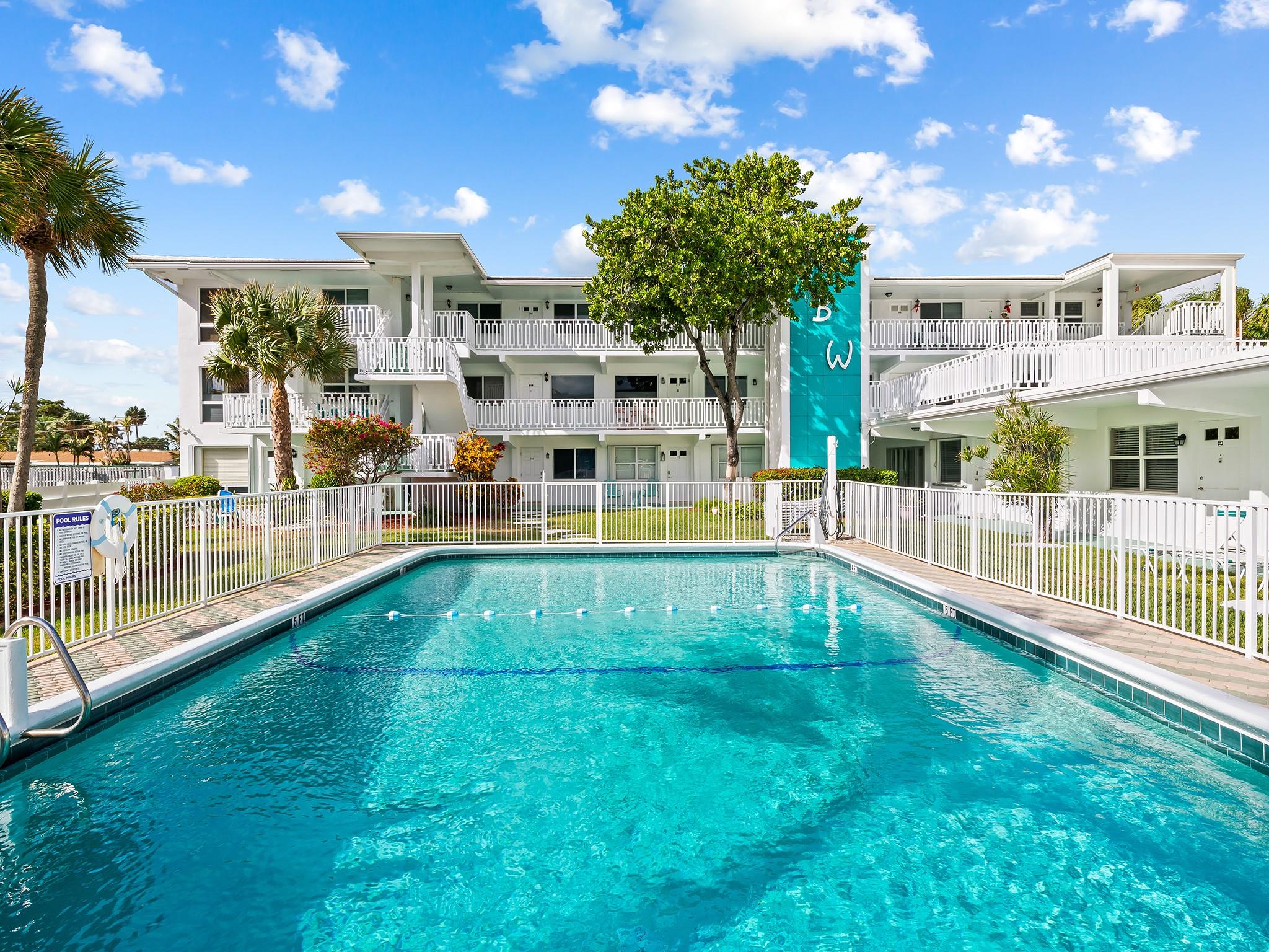 Rarely available in Jade Beach Villas West! Perfect opportunity to own your dream beach destination! Located directly across Ocean Boulevard (A1A) with deeded beach access! Extremely well-maintained and managed classic mid-century low-rise building! Only 17 units on premises overlooking breathtaking patio and pool area. 1 Bedroom/1 Bath Corner unit with open floor plan and a peek-a-boo view of the Ocean! Amazing natural light in unit! Impact windows and doors/ remodeled bathroom with oversized shower. One parking spot with unit and plenty of guest parking! Heated pool, BBQ area, club room with kitchen facilities, bike storage, and laundry facilities! Available to rent up to 12 times a year with a minimum 30 day stay! All required state inspections and required reserves are all in place!