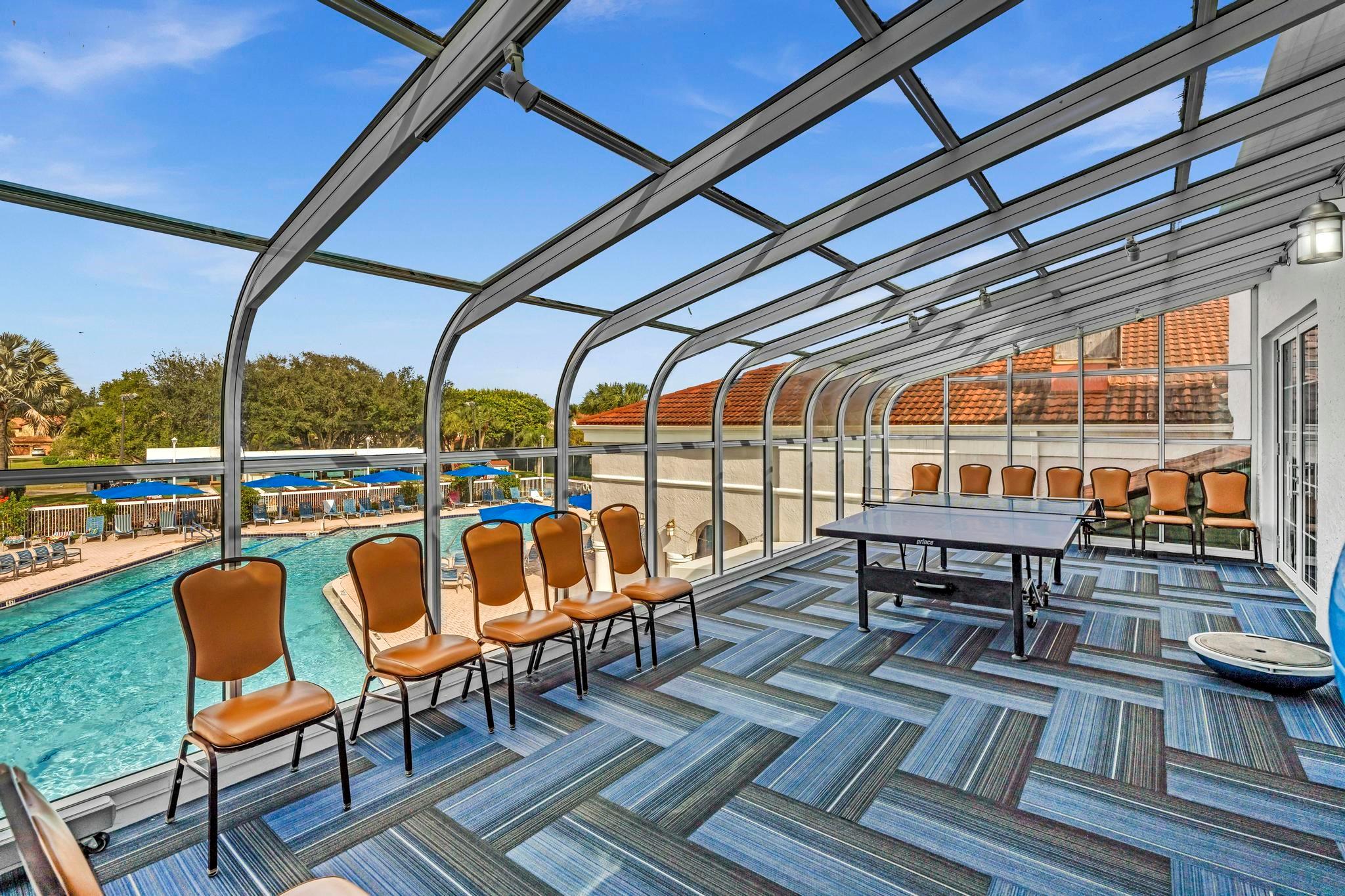 Welcome to this charming 2-bedroom, 2-bathroom second-floor unit, featuring a newer AC (2021), The home boasts stylish porcelain tiles, vinyl flooring in the bedrooms, and fresh paint with updated lighting and fans. Enjoy the convenience of an in-unit newer washer and dryer. Step outside to your private balcony, complete with newer screens and shutters, perfect for relaxation. Modern beautiful accent wall in the living room adding even more charm to this gorgeous property. Residents can take advantage of resort-style amenities, including a large pool, jacuzzi, and stunning views from a fully-equipped gym. This unit is perfect for those seeking comfort and convenience in a vibrant community! HOA fees paid quarterly.