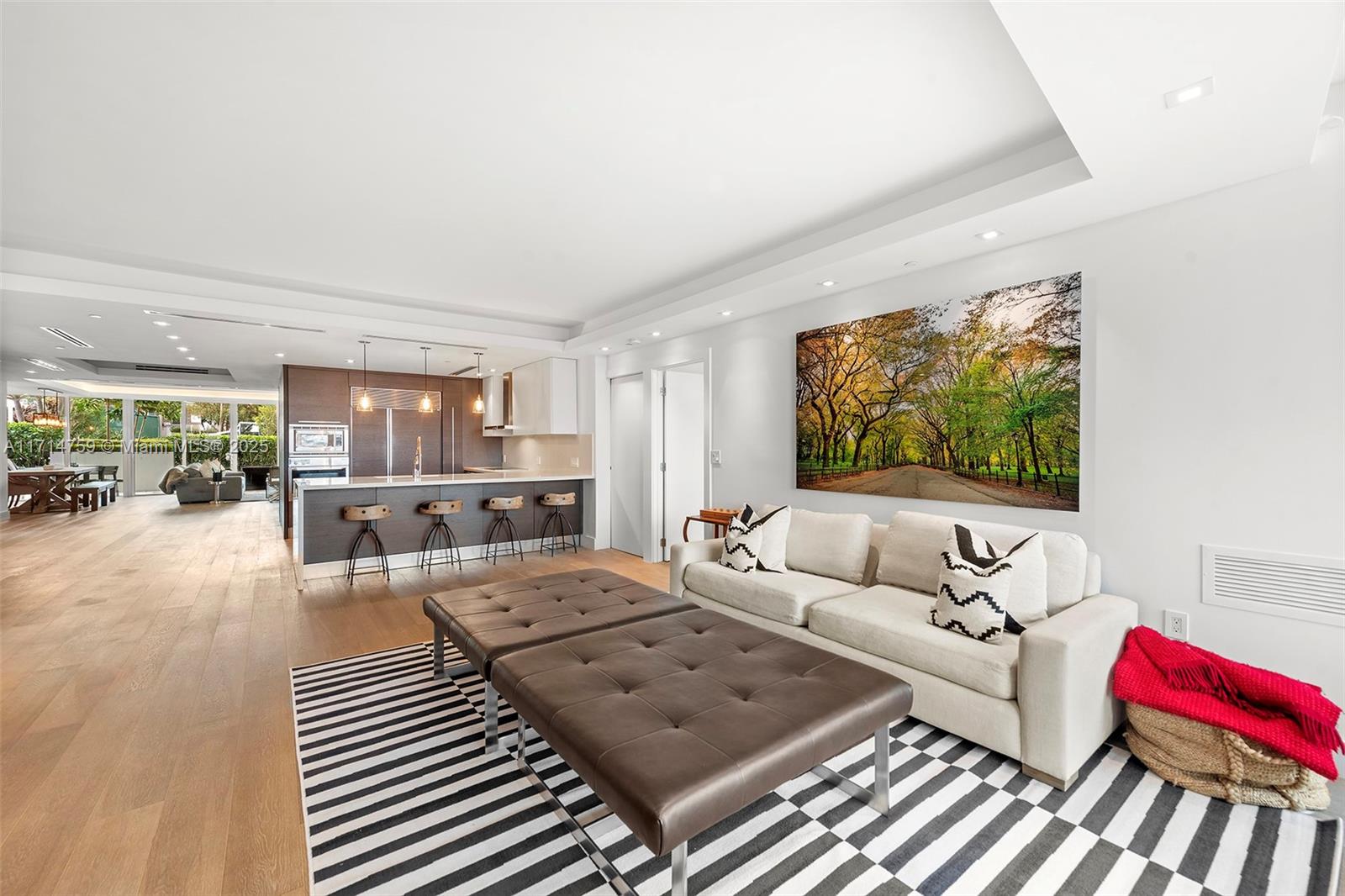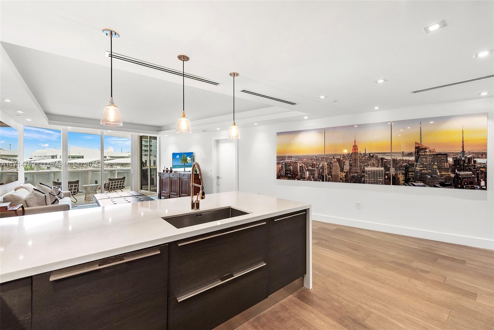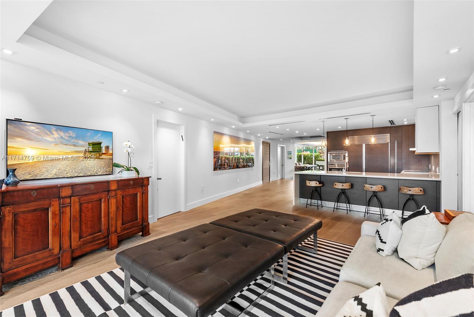 One of a kind unit on the lanai level, providing unmatched family and entertaining space both indoors and out. Created by combining two smaller units into a large 3/3/1 with the Primary Bedroom/Bath and Formal Living & Dining Area at one end, separated by a large open kitchen with informal dining, and ample space for entertaining & art display plus two separated, en-suite Bedrooms and Family area on the other. Walk out of the oversized Terrace to the private Restaurant, Tennis Court, and Pool deck overlooking the Bay. It feels like living in a large house with the benefit of luxury amenities.