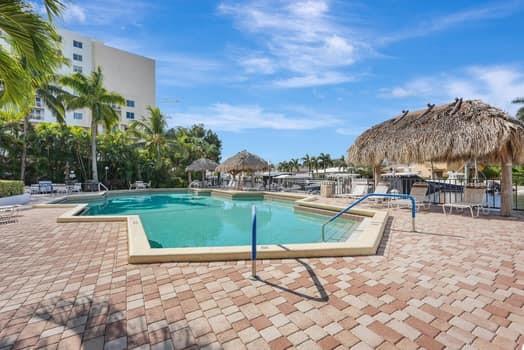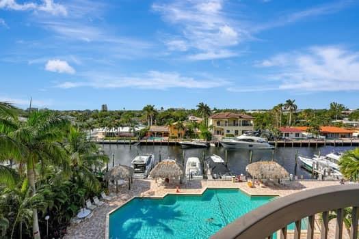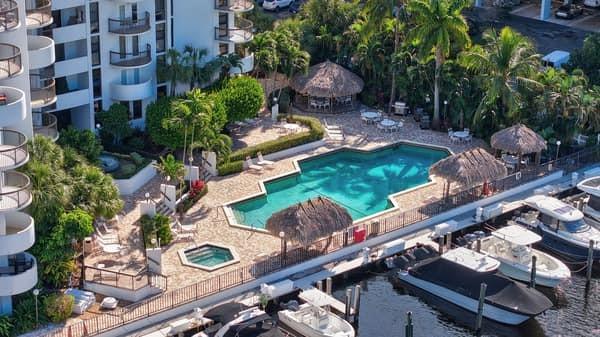 HUGE PRICE REDUCTION!!PRICED TO SELL!!!Spacious, light and bright corner unit with balmy breezes from your TWO balconies, one wraps around and one is off bedrooms both with views of the waterway, sparkling pool and spa, boats moored at the private marina, tiki hut and BBQ area. When available, marina has dockage for boats less than 30' offering deep water ocean access. Meticulously maintained complex is close to all of the ocean area Pompano Beach restaurants, shops and Pier. Enjoy your resort style pool, BBQ area, fitness room, saunas, game room, bike storage, bike/jogging path, business center and community room and full kitchen for entertaining. Deeded beach access across the street allows you to enjoy the surf, sand and sun at your leisure. Sq. ft. includes two balconies.