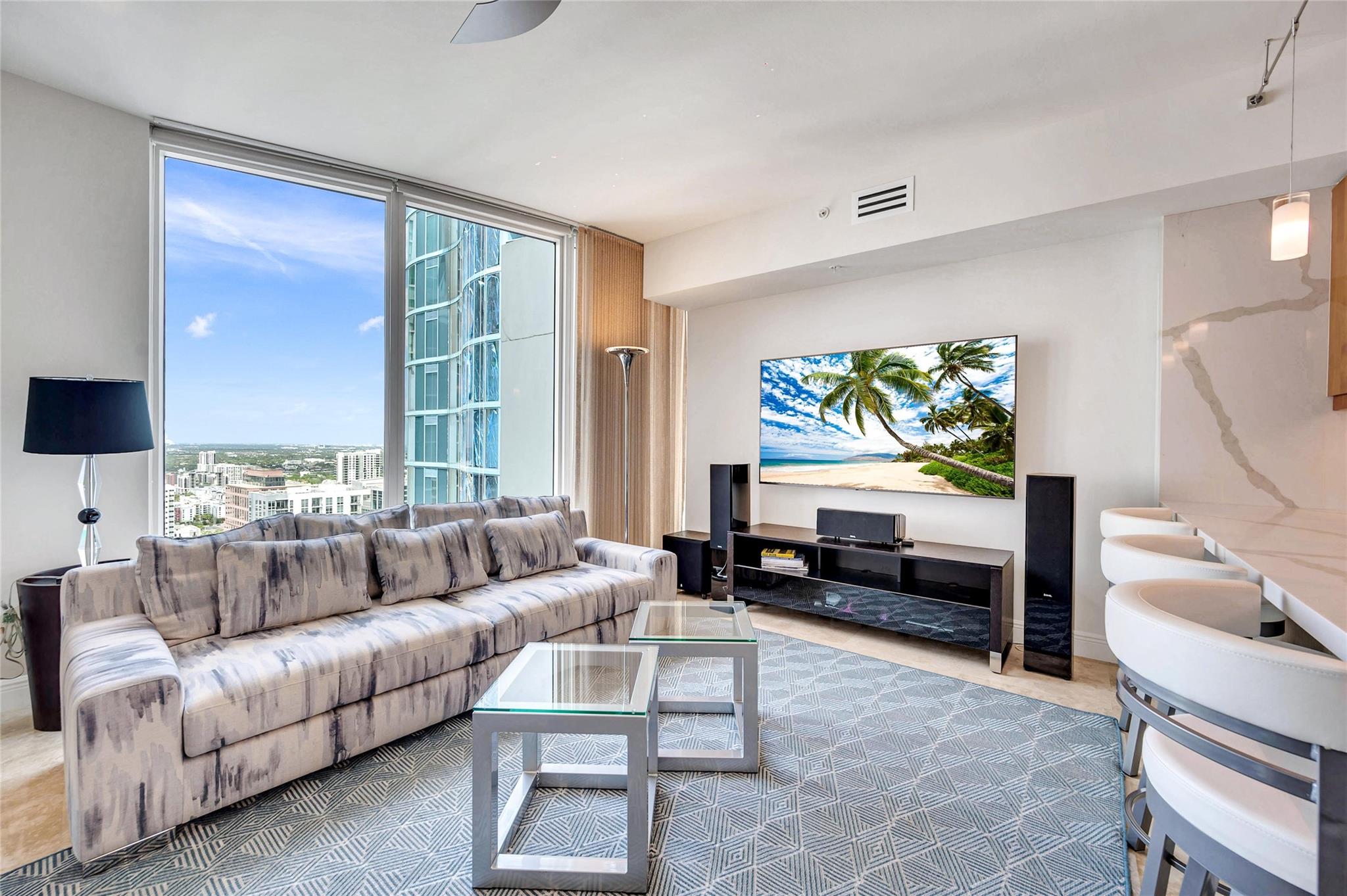 Beautifully FURNISHED modified 5th Ave model w/ 3 bed, 3.5 bath, family room & office/den. Floor-to-ceiling windows illuminate the sprawling floor plan w/North and South balconies. Recent improvements include- fresh paint, polished Travertine floors, 2 Bosch air systems(2022), new vanities, all south windows tinted, upgraded sound system, custom metal/glass doors in private elevator vestibule. Situated in the heart of Las Olas' walkable lifestyle, easy access to the city's cultural, dining, shopping, entertainment scene. Building has undergone dramatic enhancements with contemporary design for modern luxury living. High-end amenities, state-of-the-art fitness center, a resort pool, concierge. - Assessments paid, fully reserved. Offered at $689 a SF FURNISHED