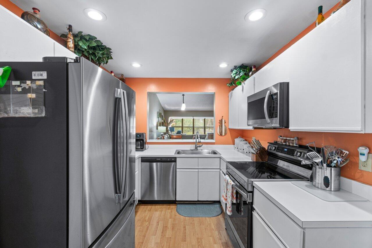 Welcome to Boca Delray Country Club, an active gated community no initiation fee, featuring an executive Par-60, 18-hole golf course set on 160 acres. This inviting three-bedroom end unit is filled with natural light and showcases vaulted ceilings, a versatile triple-split floor plan, and abundant storage throughout. The spacious primary suite offers a walk-in closet, dual sinks, and a step-in shower. The kitchen is equipped with newer appliances, a double-door pantry, an eat-in area, and generous counter space.Designed for entertaining, the open living area includes a bonus den, while two private balconies extend your living space--one screened-in with serene golf and water views, surrounded by lush greenery.