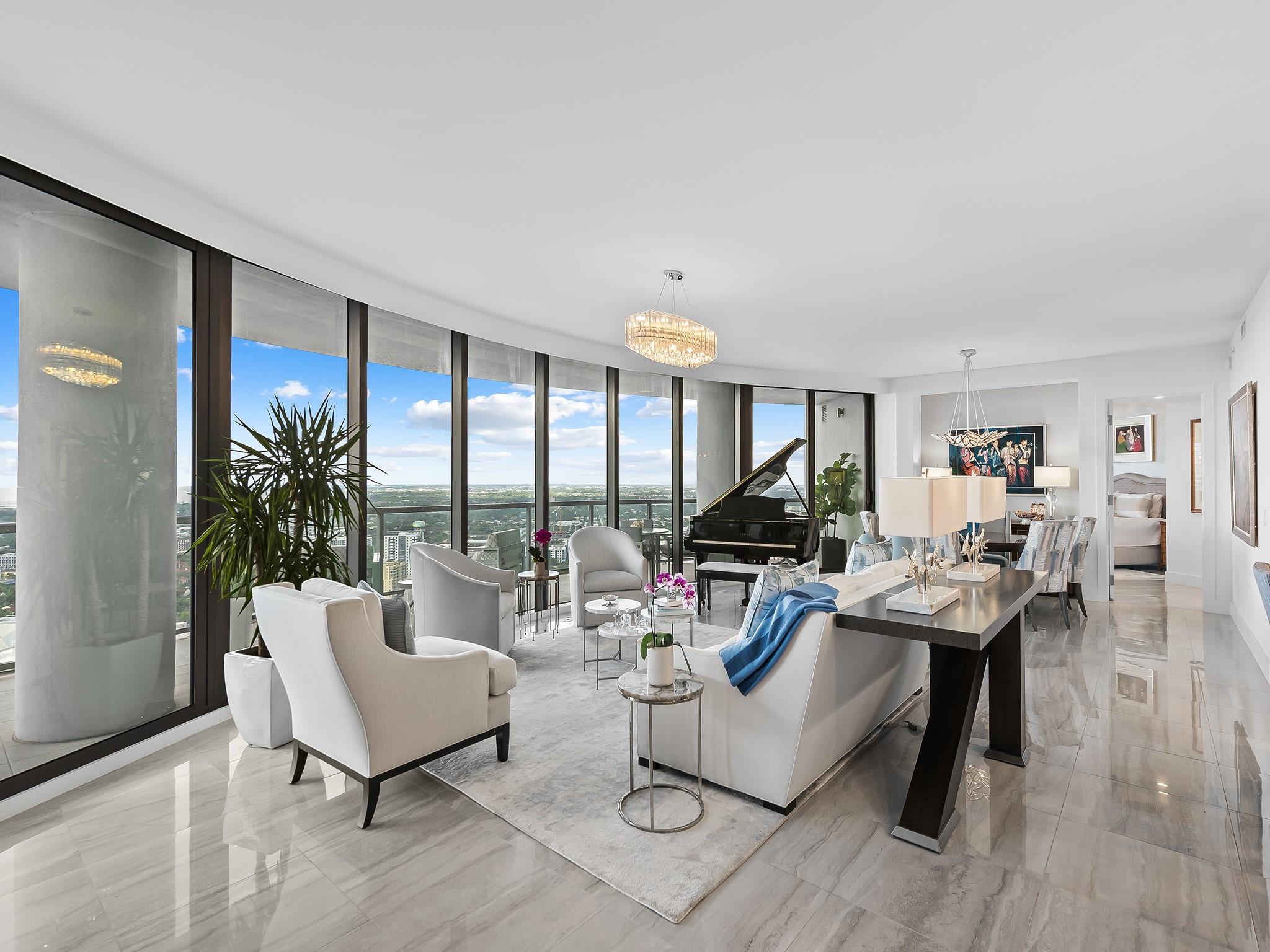 Experience the pinnacle of luxury in this breathtaking 41st-floor residence at 100 Las Olas, acclaimed as "Best Building" by FTL Magazine. This exquisitely appointed 3-bed+den, 3.5-bath condo offers an expansive open layout, ft custom Italian Nolte cabinetry, quartz countertops, and top-tier Jenn-Air appliances. Revel in sweeping panoramic views of the river, city, and ocean from over 600 sqft of private wraparound terrace. High-end finishes include motorized shades, porcelain floors, custom built-ins, and a bespoke office. Indulge in resort-style amenities: rooftop pool with cabanas, fitness center, concierge, and 24-hour security. Includes 2 parking spaces, a storage unit, and is steps from dining, shopping, and entertainment on Las Olas Blvd. Unit is unfurnished. SqFt from floor plans.