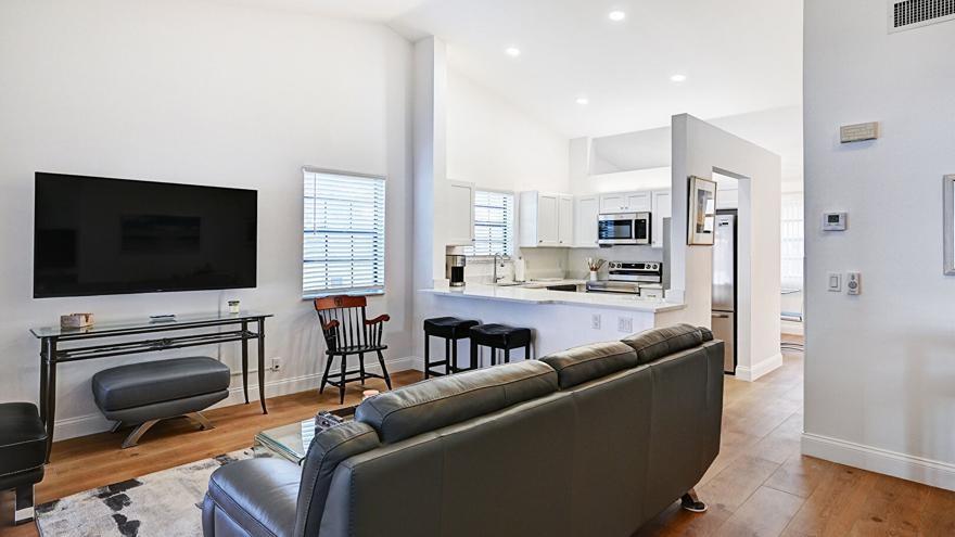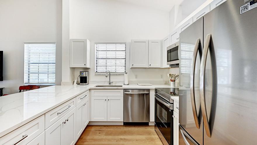Welcome to your dream home in the highly sought-after community of Independence Bay! This beautifully upgraded second floor corner unit offers 2 spacious bedrooms, 2 bathrooms and soaring vaulted ceilings that enhance the open and airy feel. The newly upgraded high-end kitchen is a chefs delight, featuring brand new stainless steel appliances, white shaker cabinetry and an elegant quartz countertop! This unit features brand new tile flooring, is freshly painted, popcorn ceilings removed and stunning lake views/ sunsets from your privately screened patio, living room and master bedroom. Amenities included: pickleball, tennis, 5 heated pools, a game room, updated fitness center and is just minutes from the beach, shopping, restaurants and more!