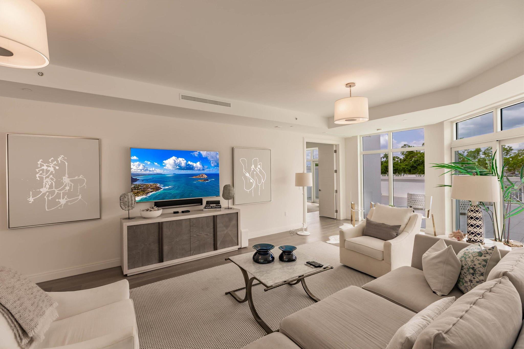 Step into a world of refined coastal luxury in this exceptional 3-bedroom, 3.5-bathroom residence, located on the second floor of an exclusive boutique building completed in 2016. With over 3,500 sq ft of impeccably designed interior space and an expansive 4,000+ sq ft wraparound terrace, this home redefines indoor-outdoor living with sweeping views of the Intracoastal and Atlantic Ocean. A private elevator opens directly into your residence, where clean architectural lines, curated finishes, and sun-drenched interiors set the tone. Two gracious primary suites offer spa-inspired baths and custom wardrobes, while the open-concept living and dining spaces are framed by floor-to-ceiling glass and seamless access to the terrace.