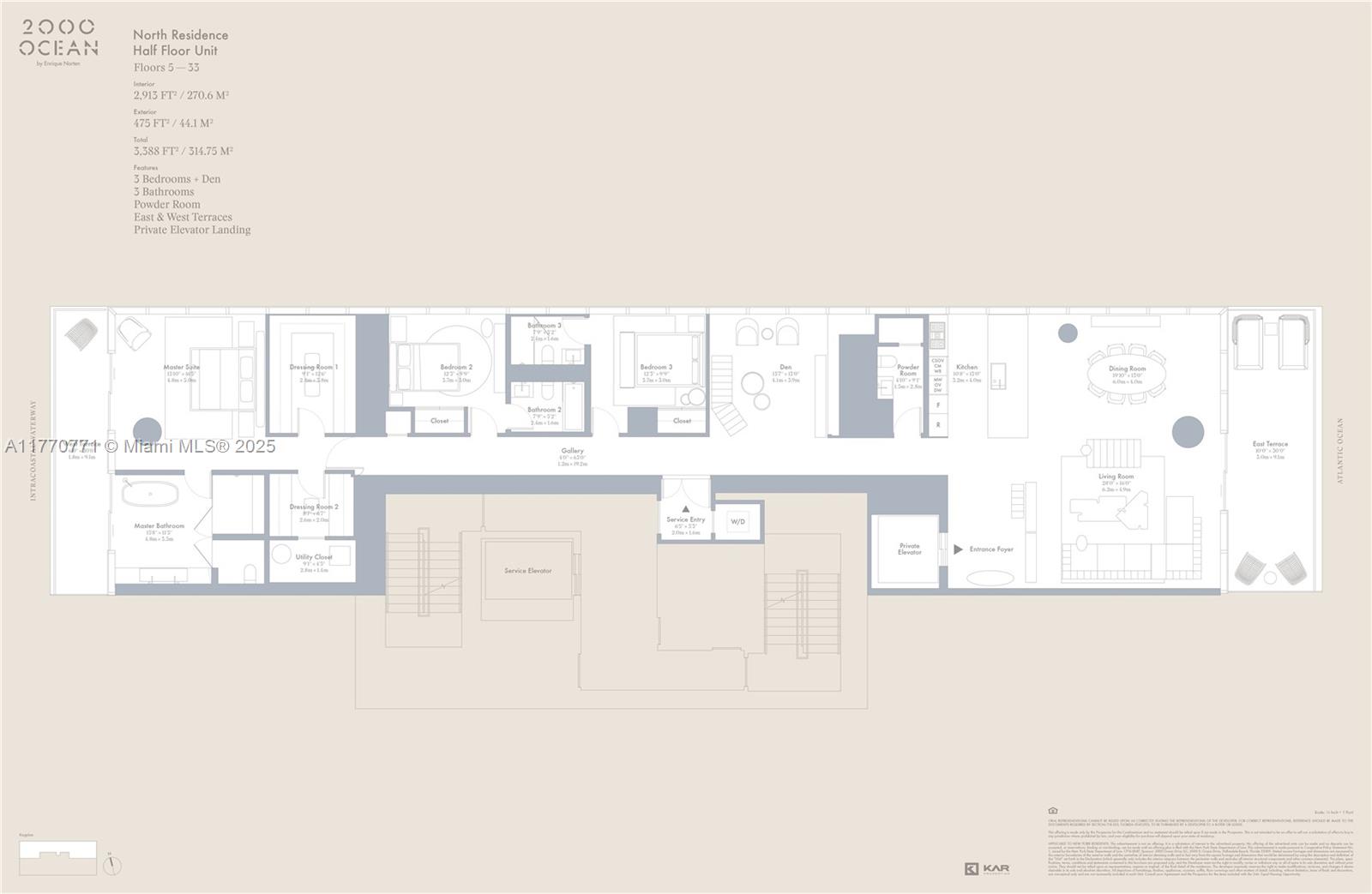 Nestled just north of Golden Beach, Residence 28A at 2000 Ocean is the best deal in this 38-story building — a high-floor unit with 270° of unobstructed views of the Atlantic Ocean, Intracoastal and pristine beaches. This sophisticated half-floor corner home features 3 bedrooms + den (convertible to 4th bedroom), 3.5 baths, 10-ft ceilings, private elevator landings and expansive east/west terraces. Amenities include sunrise & sunset pools, Spa Pavilion with yoga room, sauna, atmospheric shower & treatment room, state-of-the-art fitness center, owner’s lounge with catering kitchen & Assouline library, plus landscaped gardens with a dog walk area.