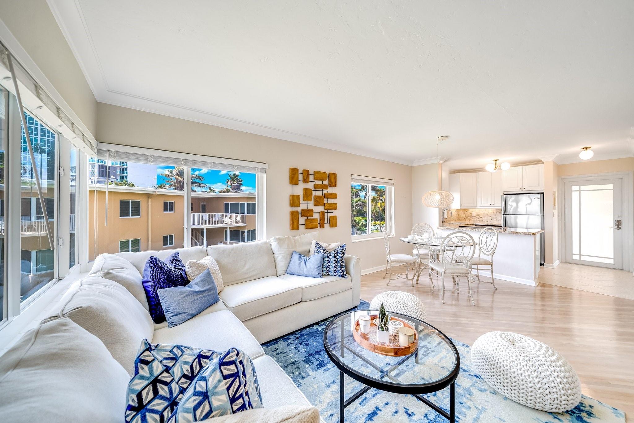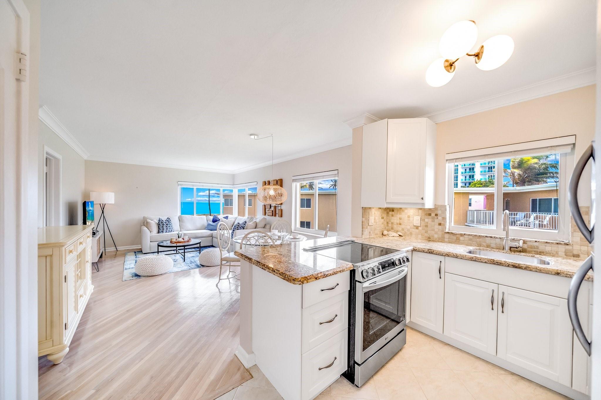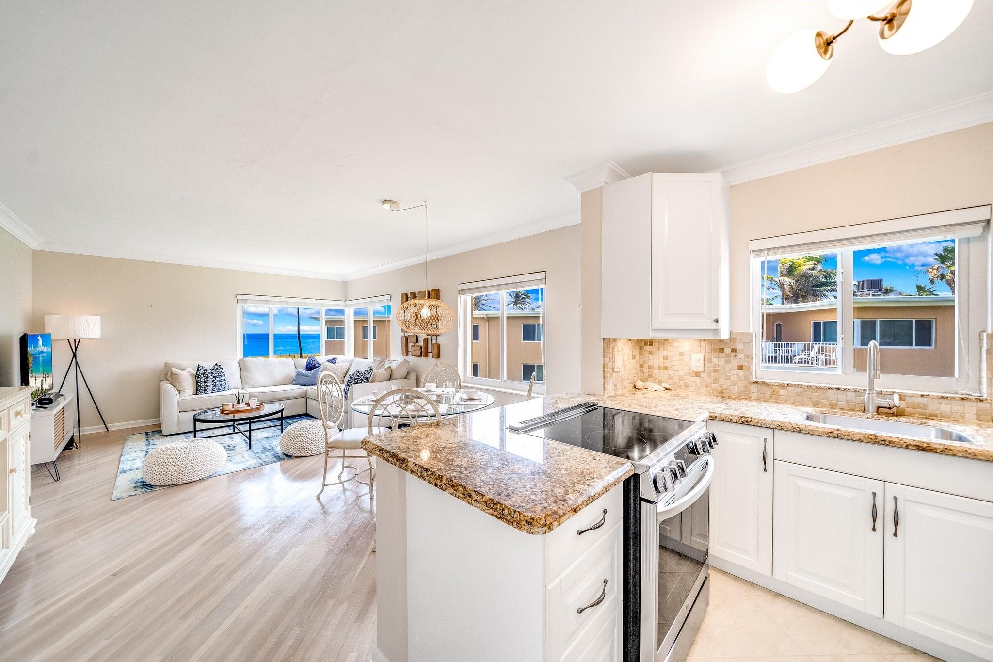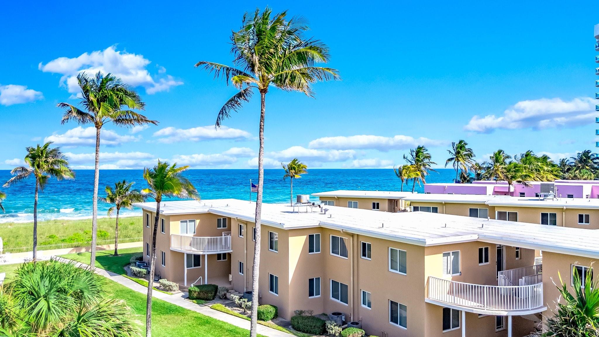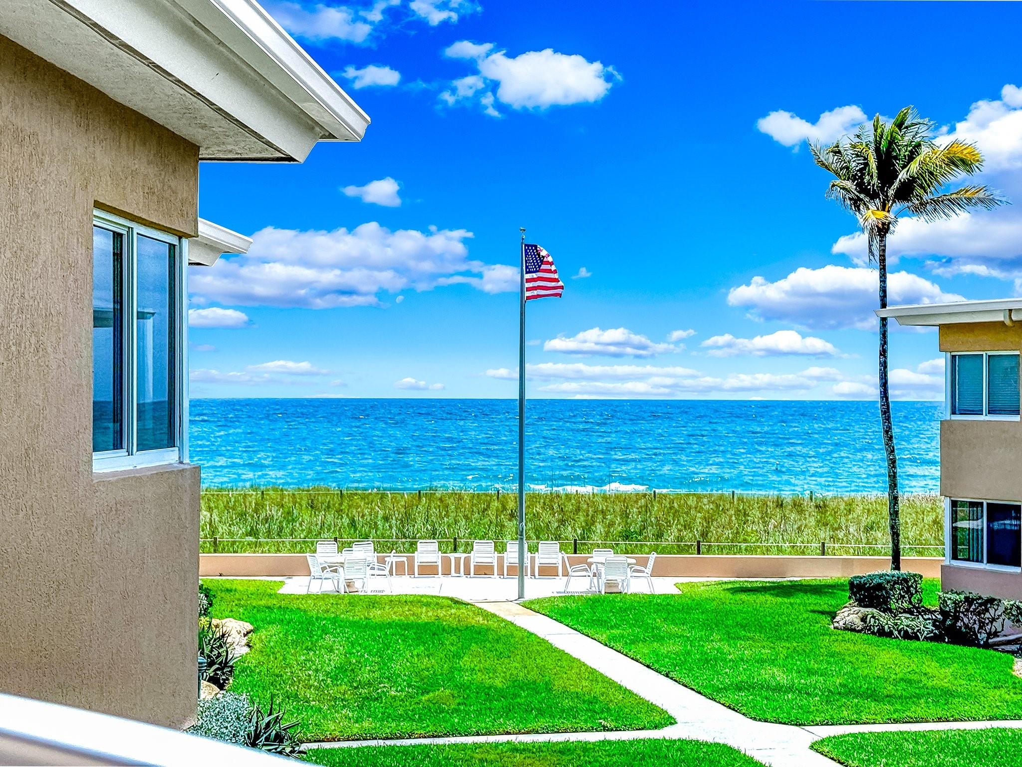 This serene oceanfront 2/2 corner unit has windows on all 4 sides which lets in incredible natural light. Both bedrooms have bathroom entry from bedroom. Substantially renovated open kitchen with views of the ocean, tankless water heater, 2023 Roof. Enjoy the ocean breeze on your patio, steps to the beach. Amenities include: community kitchen, grill, heated pool, on-site laundry facility, secure individual storage unit and 1 assigned parking space. Association fee covers water and monthly pest control. Association allows washer/dryer inside the unit. $1M renovation - New roof, concrete restoration and exterior building renovations have been completed, special assessment for it has already been paid! Showings by appointment only. Private property - Showings by appointment only