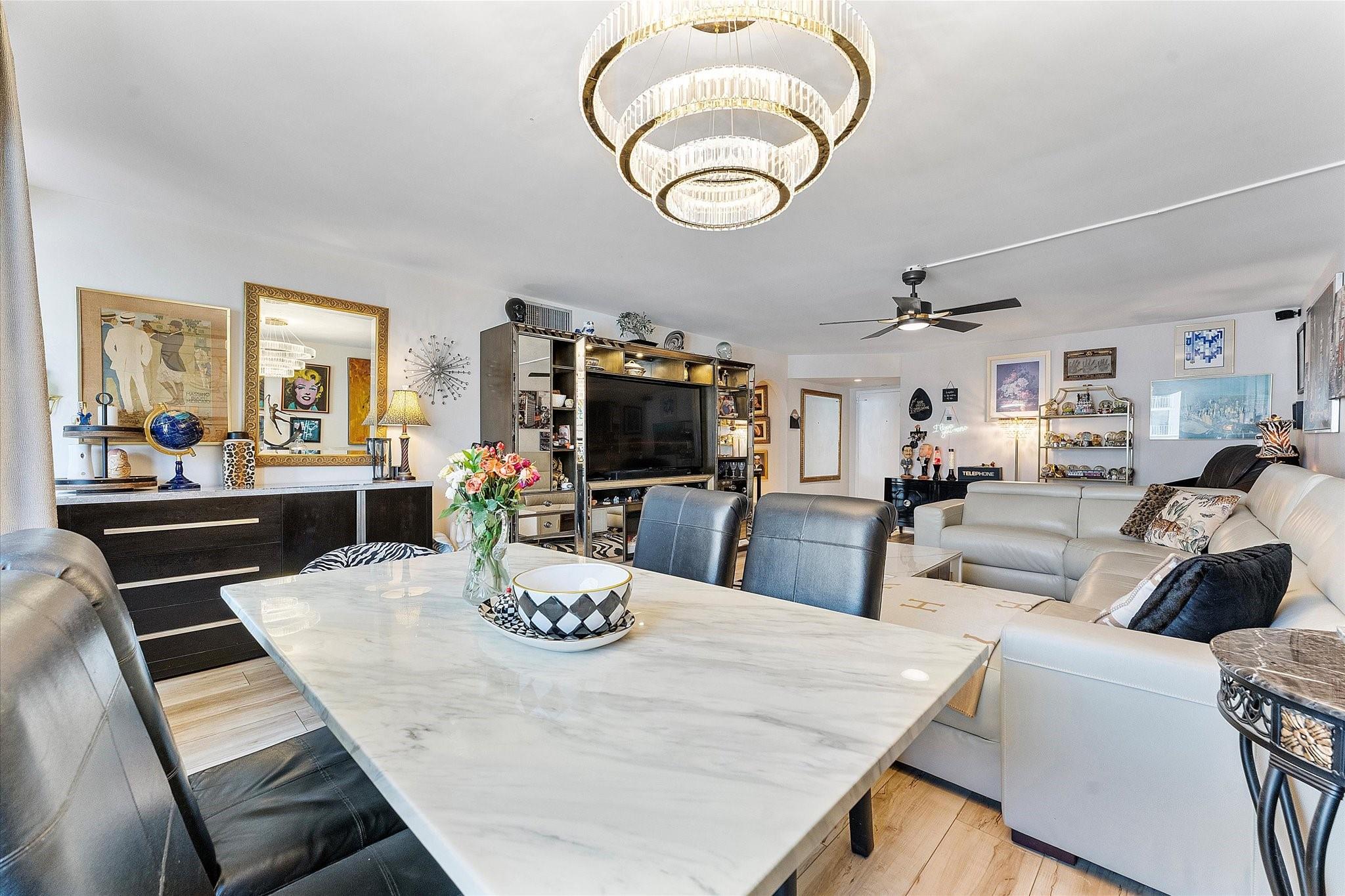 Wake up to breathtaking sunrises over the ocean from your balcony and wind down with stunning intracoastal sunsets in this beautifully upgraded, spacious 1,400 Sq Ft, 2 bed / 2 bath condo in the desirable Pompano Atlantis. Featuring brand-new luxury vinyl plank flooring, a Samsung Family Hub refrigerator, LG microwave, elegant crystal chandeliers, and high-end brass and crystal finishes throughout. The bathrooms boast designer touches, including a black ceramic sink and brass fixtures. The second bathroom features a relaxing jacuzzi tub, perfect for unwinding after a long day. Enjoy peace of mind with impact-resistant windows and doors. This home also features new smart ceiling fans.