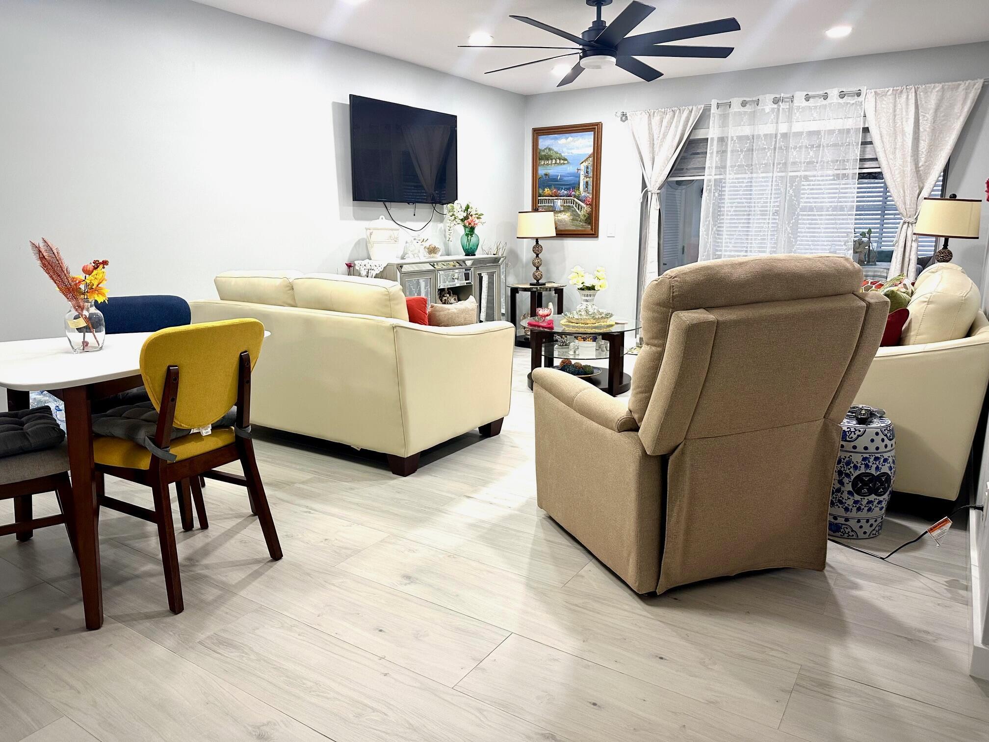 This stunning unit boasts an updated kitchen complete with stainless steel appliances. Every detail has been thoughtfully updated. Both bathrooms showcase modern ceiling-to-floor tile finishes. Enjoy energy-efficient LED recessed lighting throughout in the kitchen and living room to set the perfect mood. Additional upgrades include a 4 year old A/C unit and water heater, stylish Zebra blind window treatments. Impact-resistant windows have been installed in the kitchen, bedroom, and both bathrooms for added peace of mind. Step outside to a beautifully updated patio area with newly installed pavers. This immaculate unit is a must-see and won't be on the market for long!