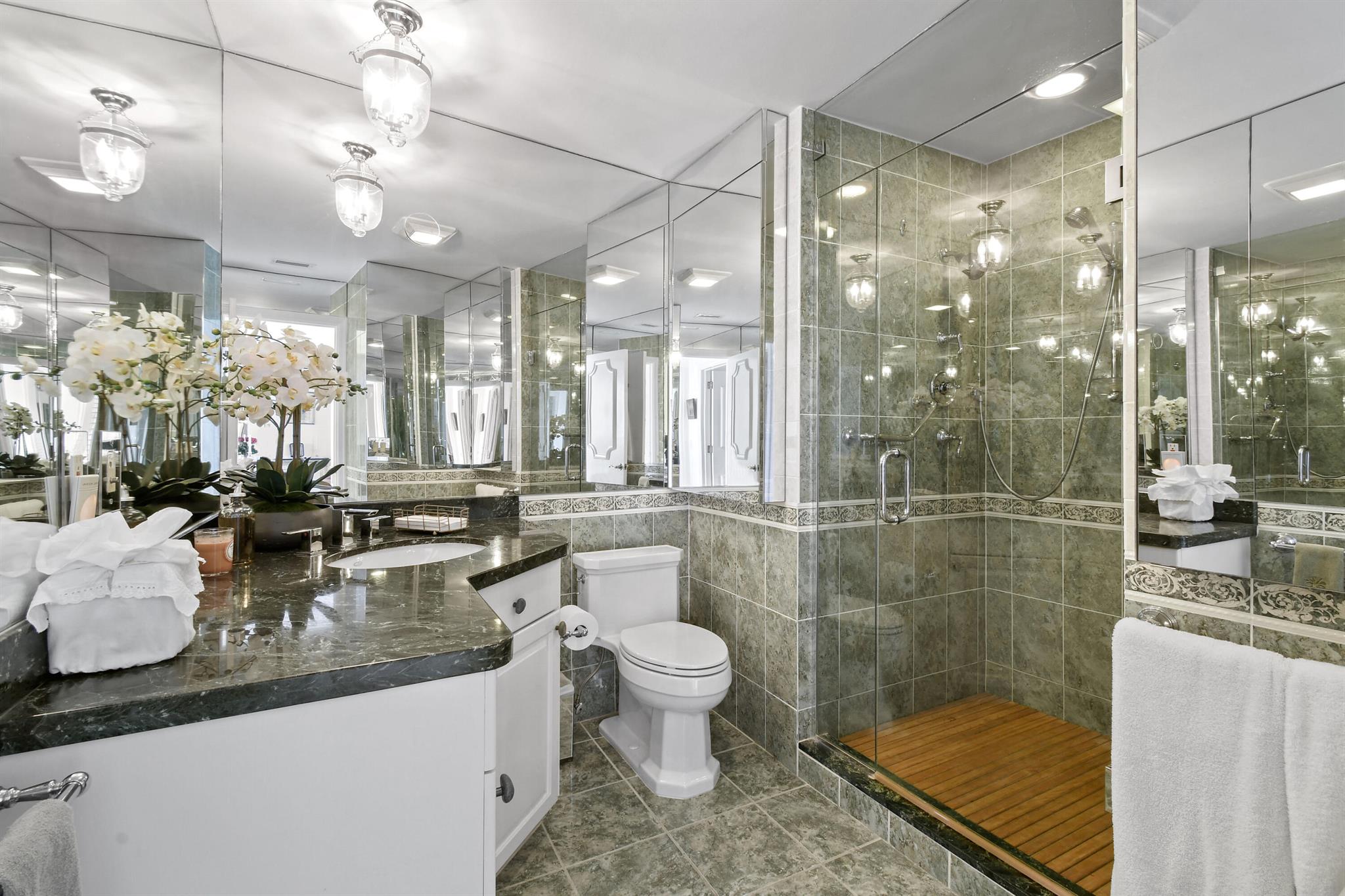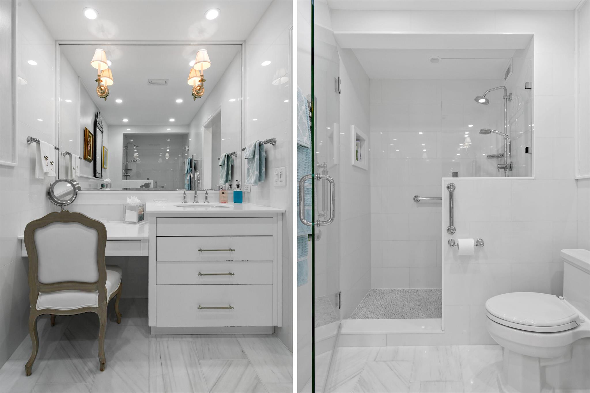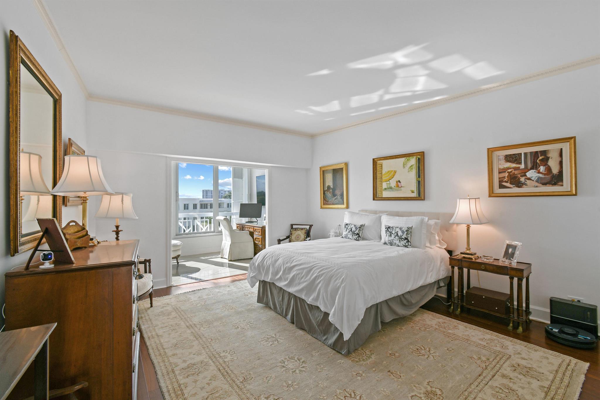 Corner fourth floor residence at 389 S Lake with water views! Pristine and renovated with high ceilings, gracious living spaces. Beautiful light filled condo with essentially 2 primary bedrooms. A full service, pet friendly building with full time manager, pool, 24 hour door person. This residence comes with the best covered parking space in the building.Chandelier in living area does not convey