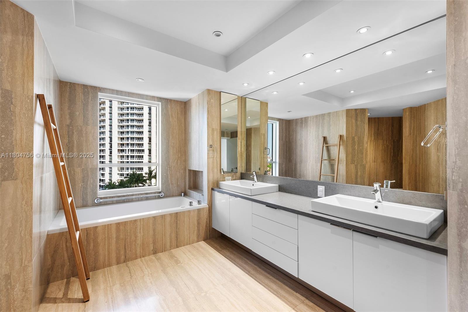 Located in the Atlantic III, this apartment offers breathtaking water views. It features 3 rooms - one currently used as an office, 2 full baths & 1 half bathroom. The master suite a private sanctuary with high-end electronic blinds and walk-in closet, with ample light and beautiful views. Polished porcelain floors run across the living spaces. The master bathroom, crafted from premium travertine, and the mosaic-tiled second bath add sophisticated touches. Residents enjoy world-class amenities such as a billiard room, private aerobics, a movie theater, valet service, 24-hour concierge, security, a library, and a fully equipped gym—perfect for a refined, convenient lifestyle. *Sale does not include the ceiling lamp in the dining room, mirror in powder room & ceiling lamp in breakfast area.