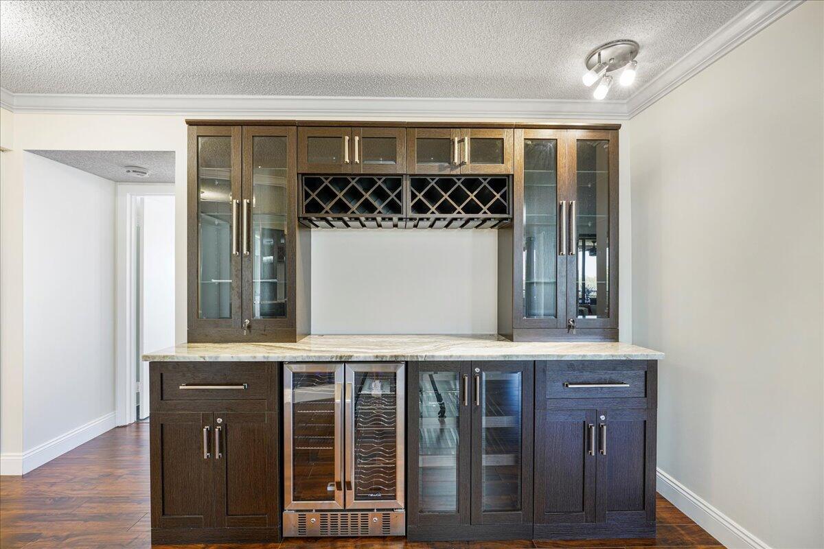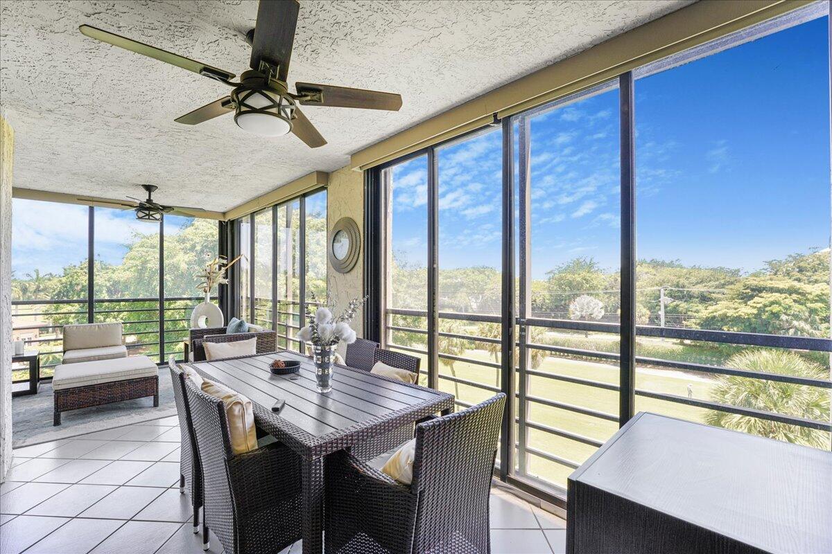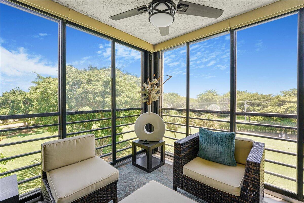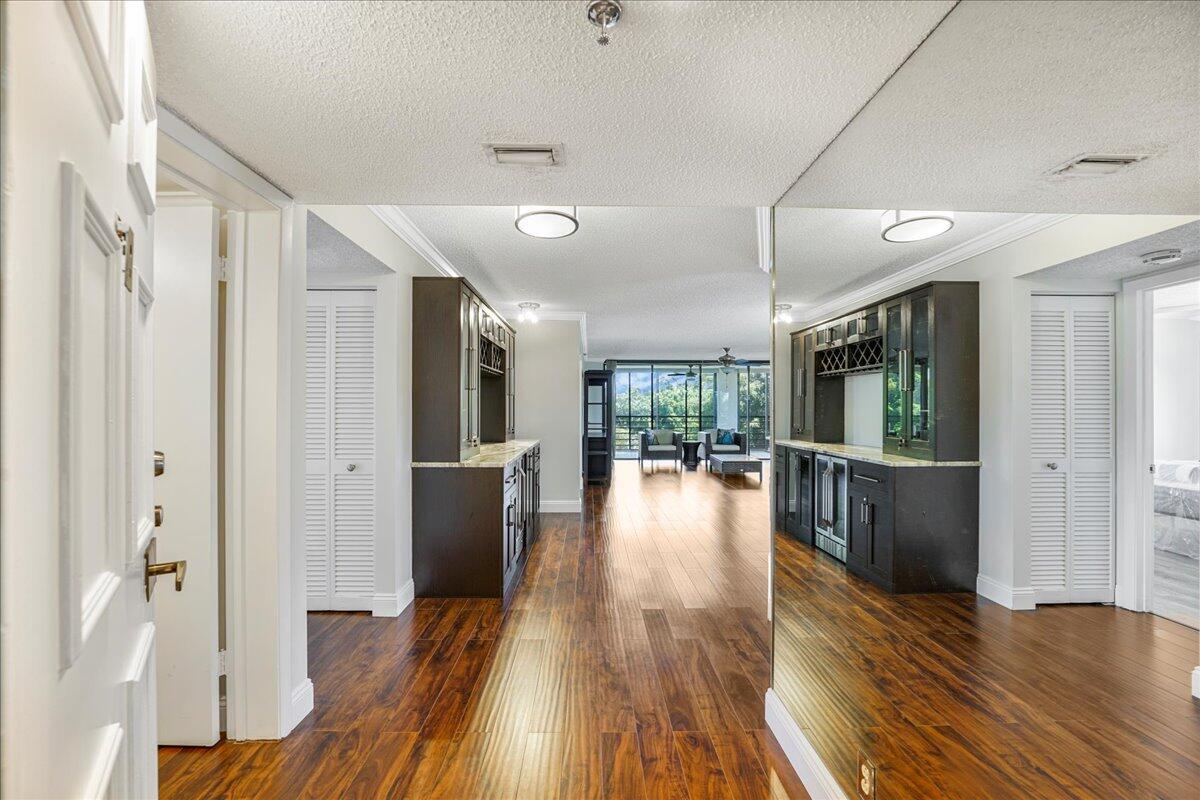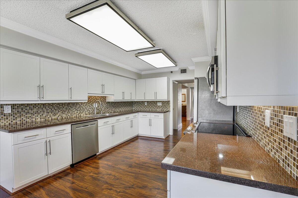 Freshly Painted, Laminate Floors Built-in Bar. Kitchen with white cabinets, granite counters, stainless steel appliances, and glass tile backsplash. Large, enclosed patio with Southeast exposure with electric sunshades. Bedrooms has crown molding. Newly updated 2nd & half bath. Large built-in closet.