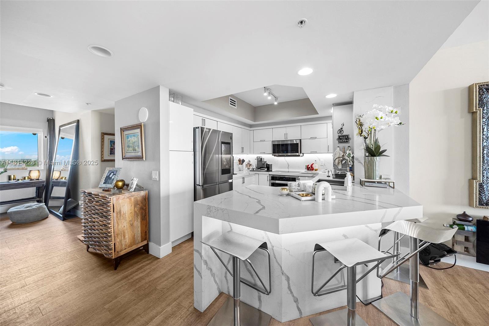 Just bring your toothbrush and settle into this newly upgraded and gorgeous unit featuring direct, unobstructed views of the Intracoastal Waterway and Atlantic Ocean. Perfectly positioned next to the exciting new planned community of Sole Mia, and east of Biscayne Blvd, this 2/2 + DEN home offers unbeatable convenience with everything you need just blocks away. Meticulously updated, the unit boasts stone kitchen countertops, custom built-ins, designer lighting, brand-new appliances, and much more. The motivated seller—a home services professional—ensures top-tier quality throughout. Plus, all special assessments will be paid by the seller at closing. Don’t miss this exceptional opportunity!