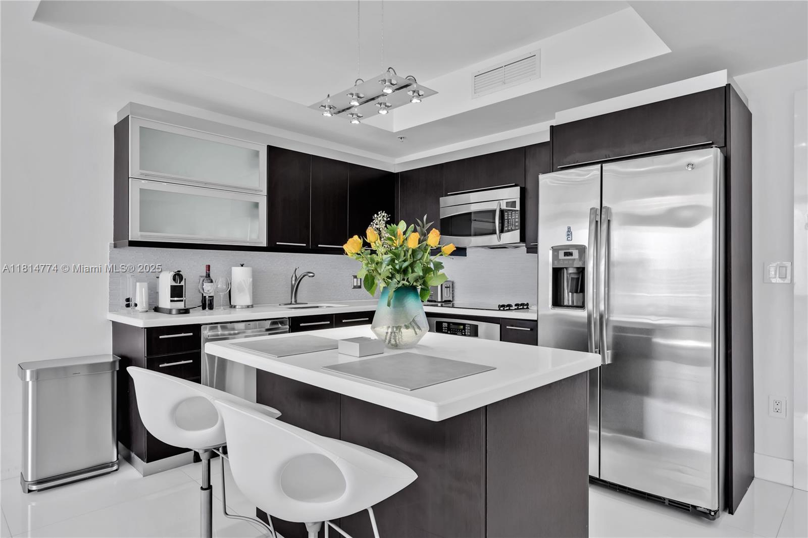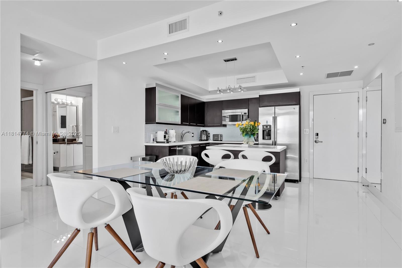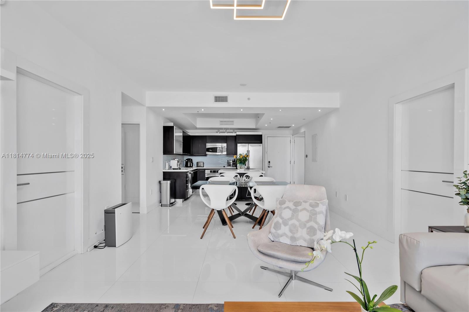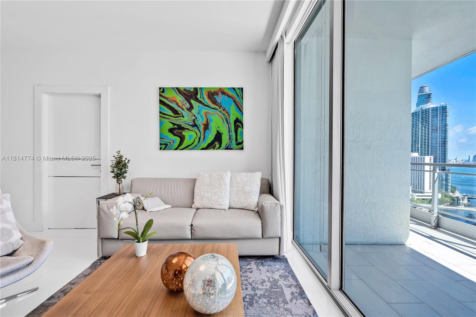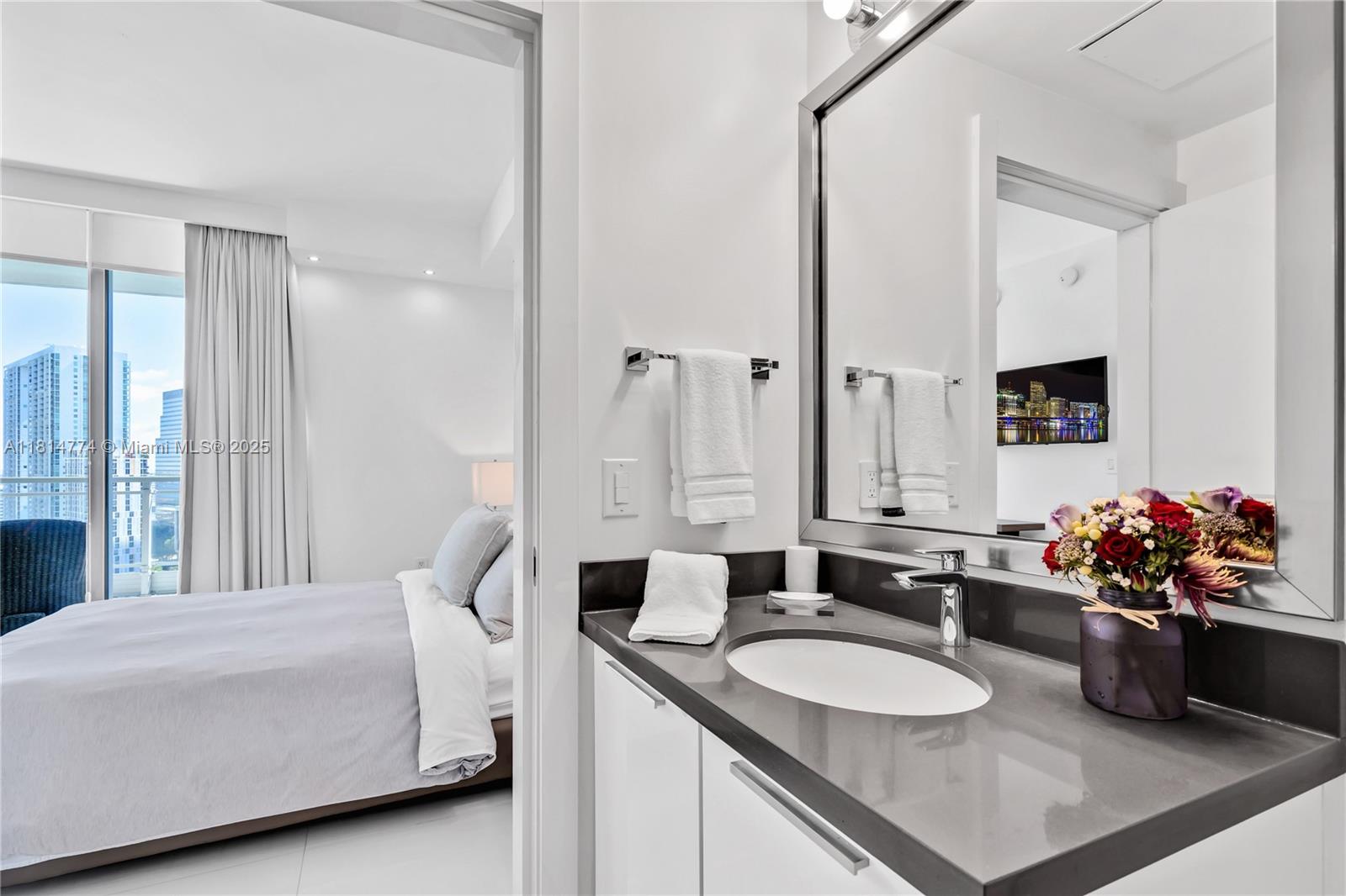 Unparalleled: high-floor unit at The Ivy, a gated Riverfront community with stunning Miami River, Brickell City Centre & skyline views. Spacious 2-bed, 2-bath with split floor plan, 32x32 porcelain tile, large terrace, custom doors, molding, recessed/LED lighting, floor-to-ceiling impact windows. The kitchen features glass tile backsplash & stainless-steel appliances. Renovated baths, California closets, blackout curtains, modern lights, Italian floating wall unit. Sold unfurnished. Includes tandem parking for 2 cars & 2 storage units. Resort amenities: infinity-edge & lap pools, spa, gym, BBQ, business center, playground, cable/internet, 24-hr security. Steps from BCC & expressways.