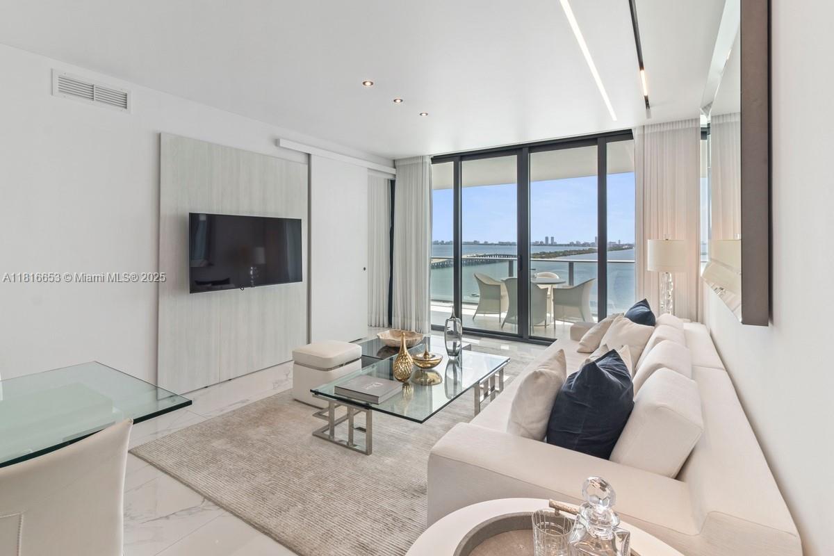 Spectacular 1 Bed + DEN / 1.5 Baths at One Paraiso with unobstructed bay and ocean views from a unique oversized balcony (approx. 250 SqFt) located in the tower’s bubble—offering one of the best 180° views. Only line with A/C unit outside the apartment, open kitchen with Italcraft cabinets, Sub-Zero & Wolf appliances, private elevator, panoramic windows, 9-ft ceilings. 5-star amenities: 3 pools, spa, gym, sauna, steam room, business center, theater, wine & cigar lounges, BBQ area, tennis courts, children’s room, boat dock, and direct access to Amara restaurant. 1 assigned covered parking space, plus valet. EV charging stations, bike storage. Pet-friendly. Only 6 residences per floor.