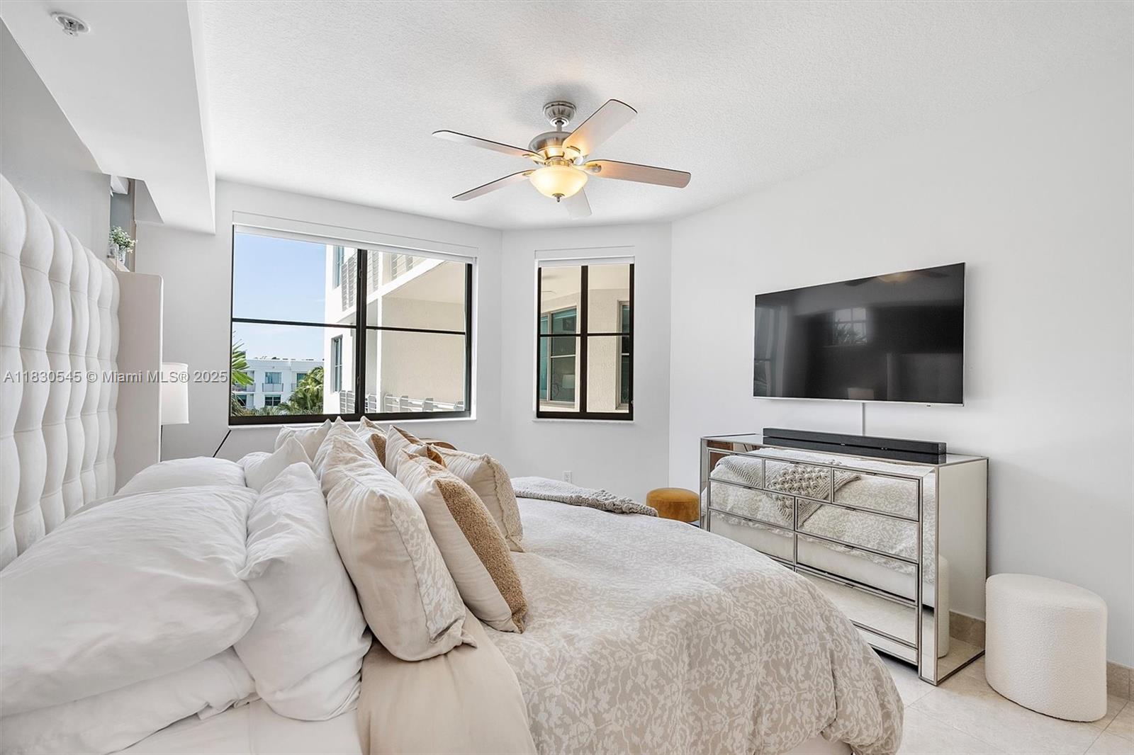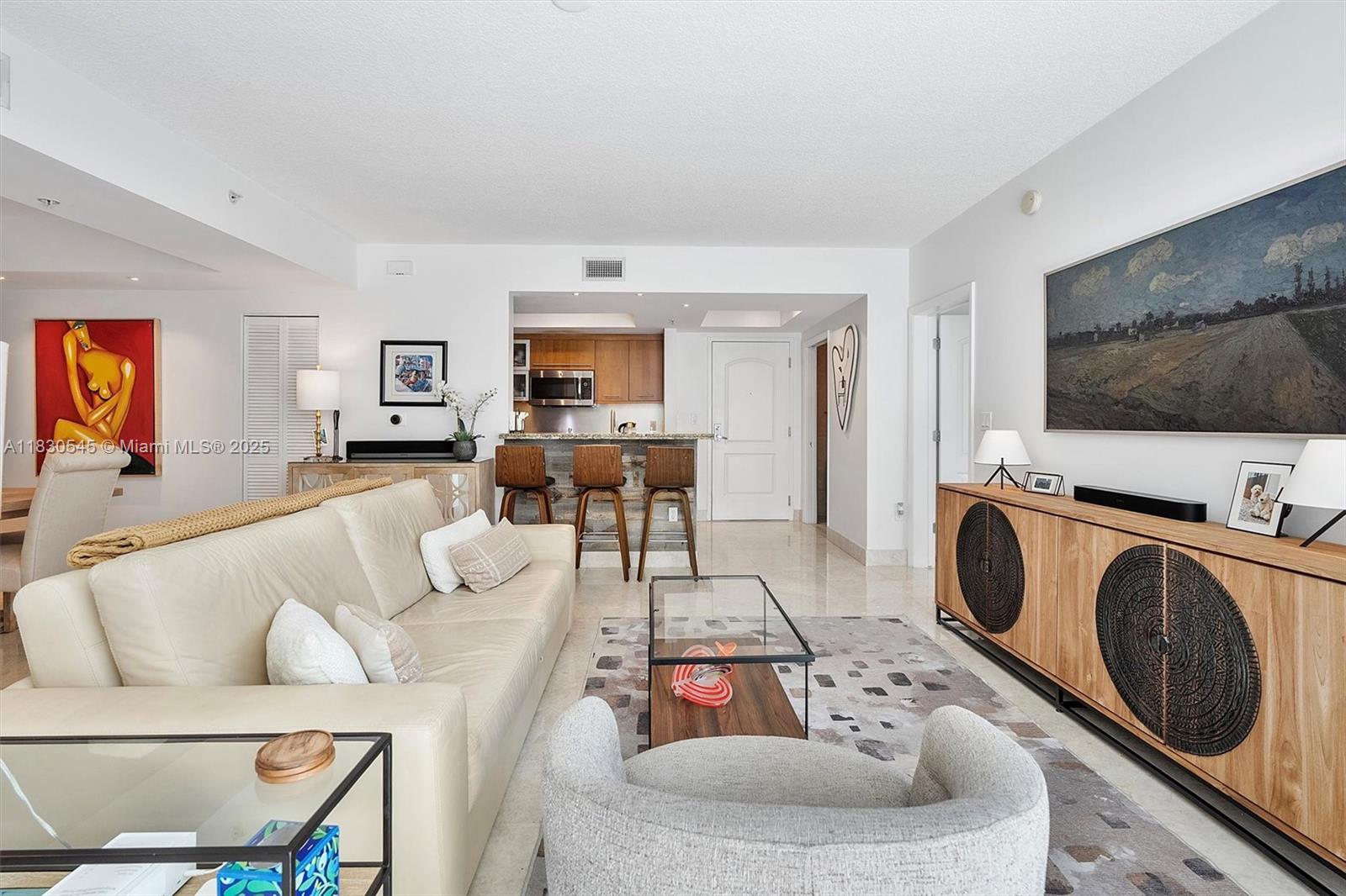 Experience sophisticated living in this elegant 2BR/2.5BA, 1,247 sqft residence in coveted South of Fifth. The thoughtfully designed split floor plan offers privacy with walk-in closets, a versatile dining/den area, and gallery-style lighting that enhances the spacious living area. The contemporary kitchen features abundant cabinetry, and a stylish barn-wood wrapped peninsula with seating for three. Enjoy a generous balcony overlooking the lush, serene tropical courtyard. The pet-friendly Cosmopolitan is a full-service building with resort-style amenities including pool, fitness center, and 24-hour security. Just steps from the beach, South Pointe Park, and world-class dining. Includes 2 covered parking spaces in tandem & private storage unit for secure, refined South of Fifth living.