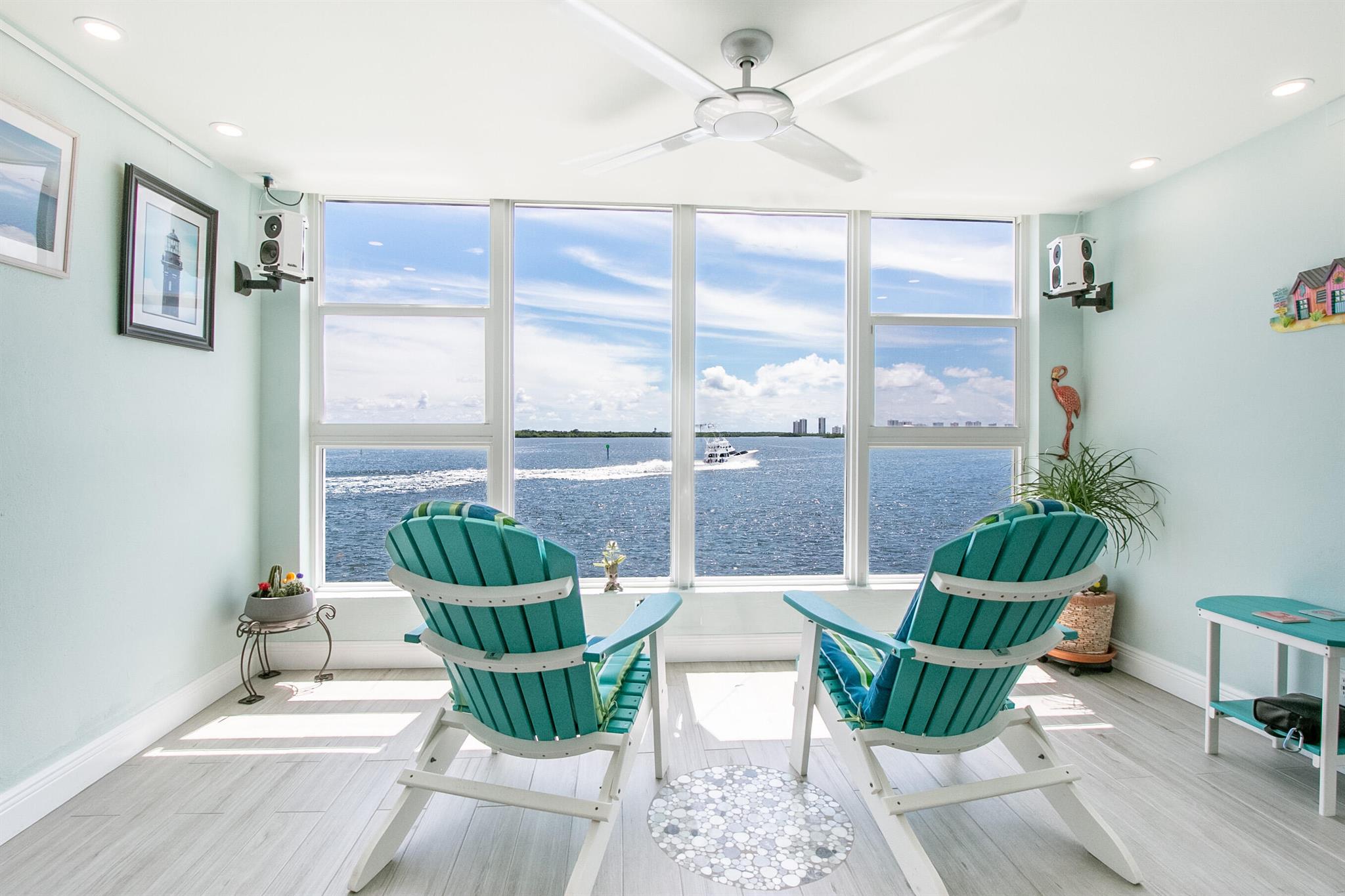 Beautifully updated unit with fabulous wide open intracoastal views. Age restricted community. New wood look tile flooring in living areas and high quality wood plank flooring in bedrooms, updated kitchen and bathrooms. Walk-in closet with slide out shelving. High hat lighting and top quality ceiling fans. Smart lights and thermostat can be programmed, voice activated or used manually. Reverse osmosis water treatment system. Hurricane resistant windows and front door. In addition to hurricane resistant glass, windows have added protection of electric roll down hurricane shutters. Shutters are so easy to use they can also be utilized for window shades. A/C unit is 2019. Condo association passed SIRS and milestone inspection. Association dues include water, use of 2 community docks, swimmin