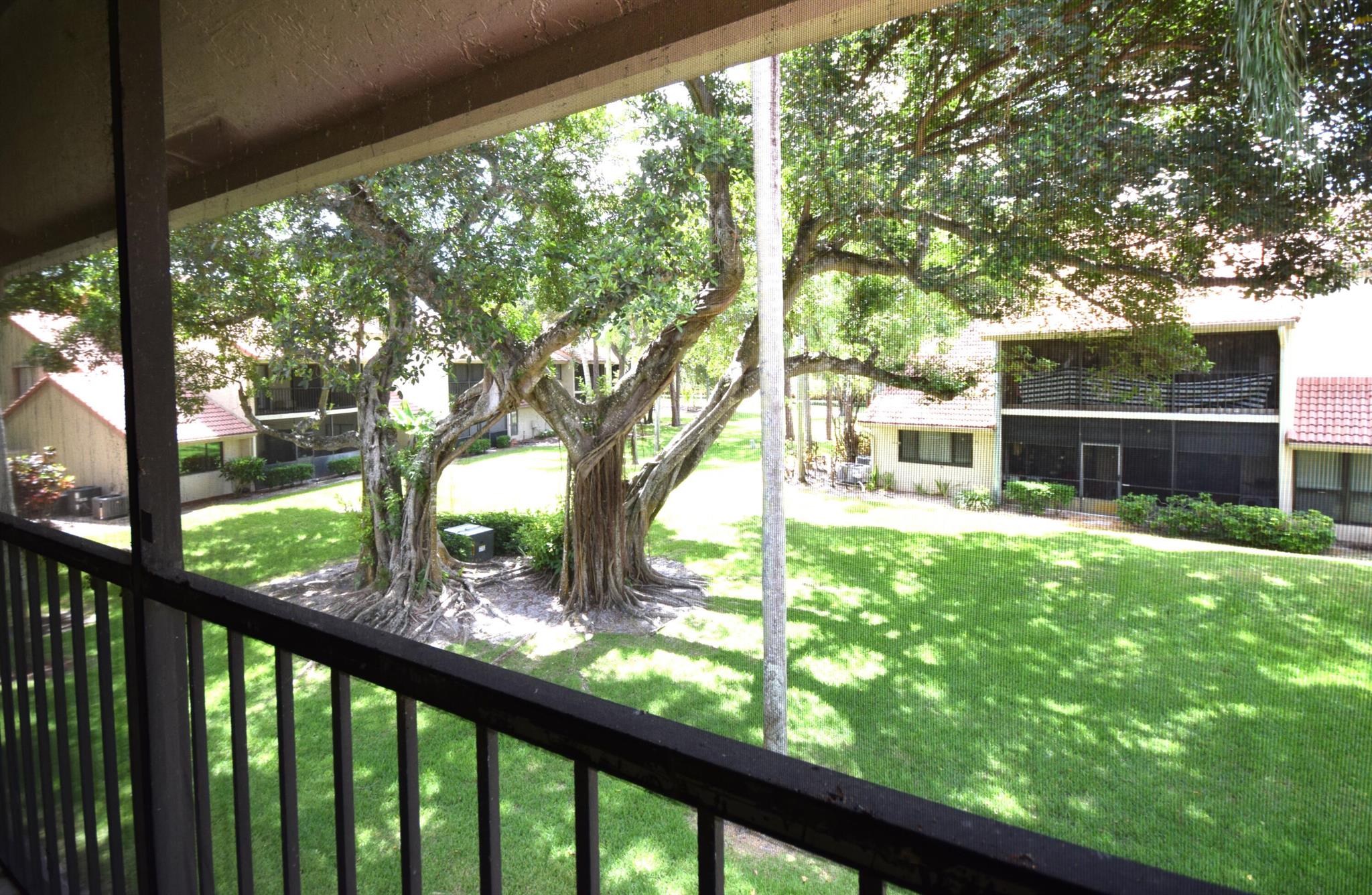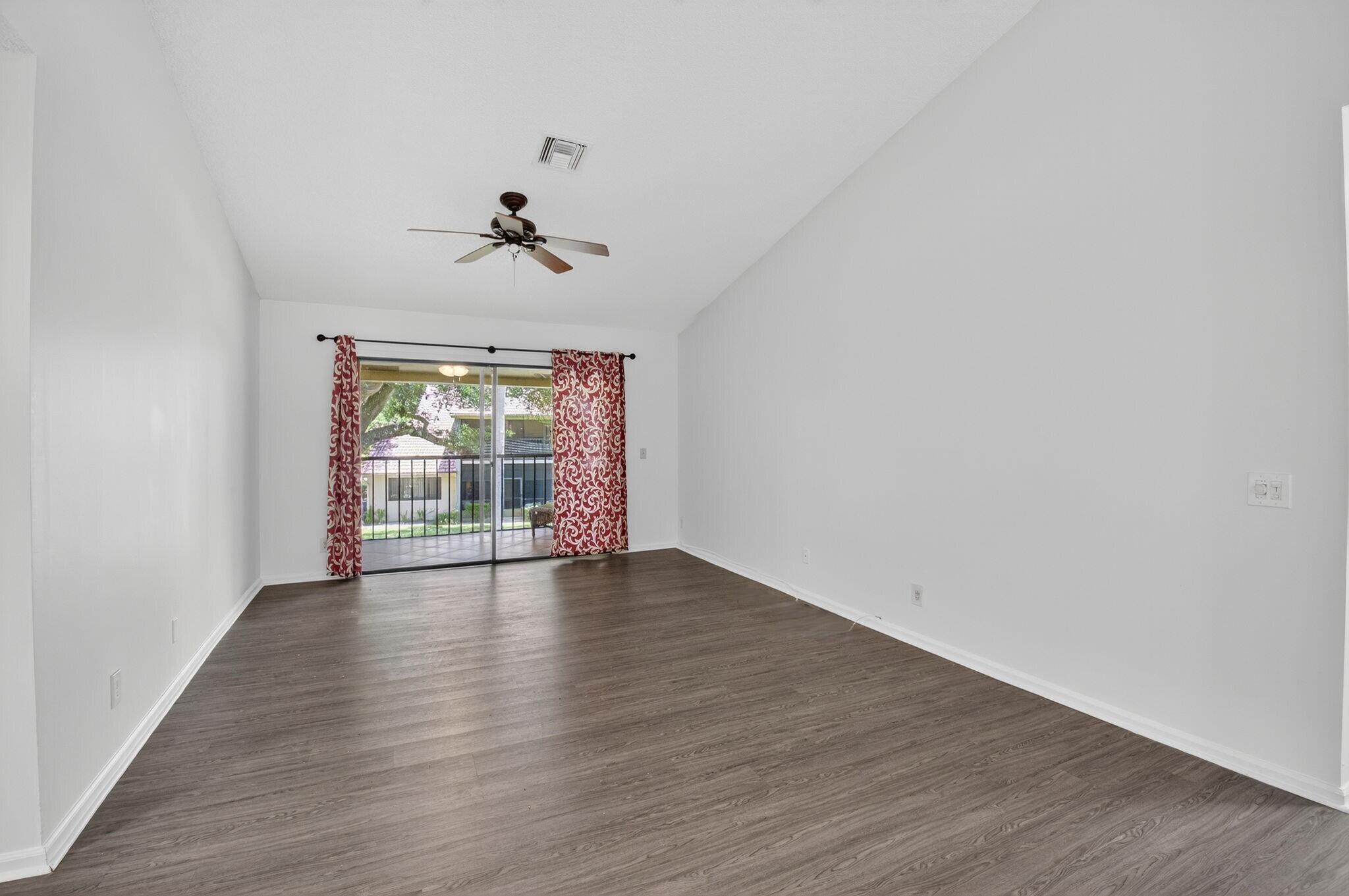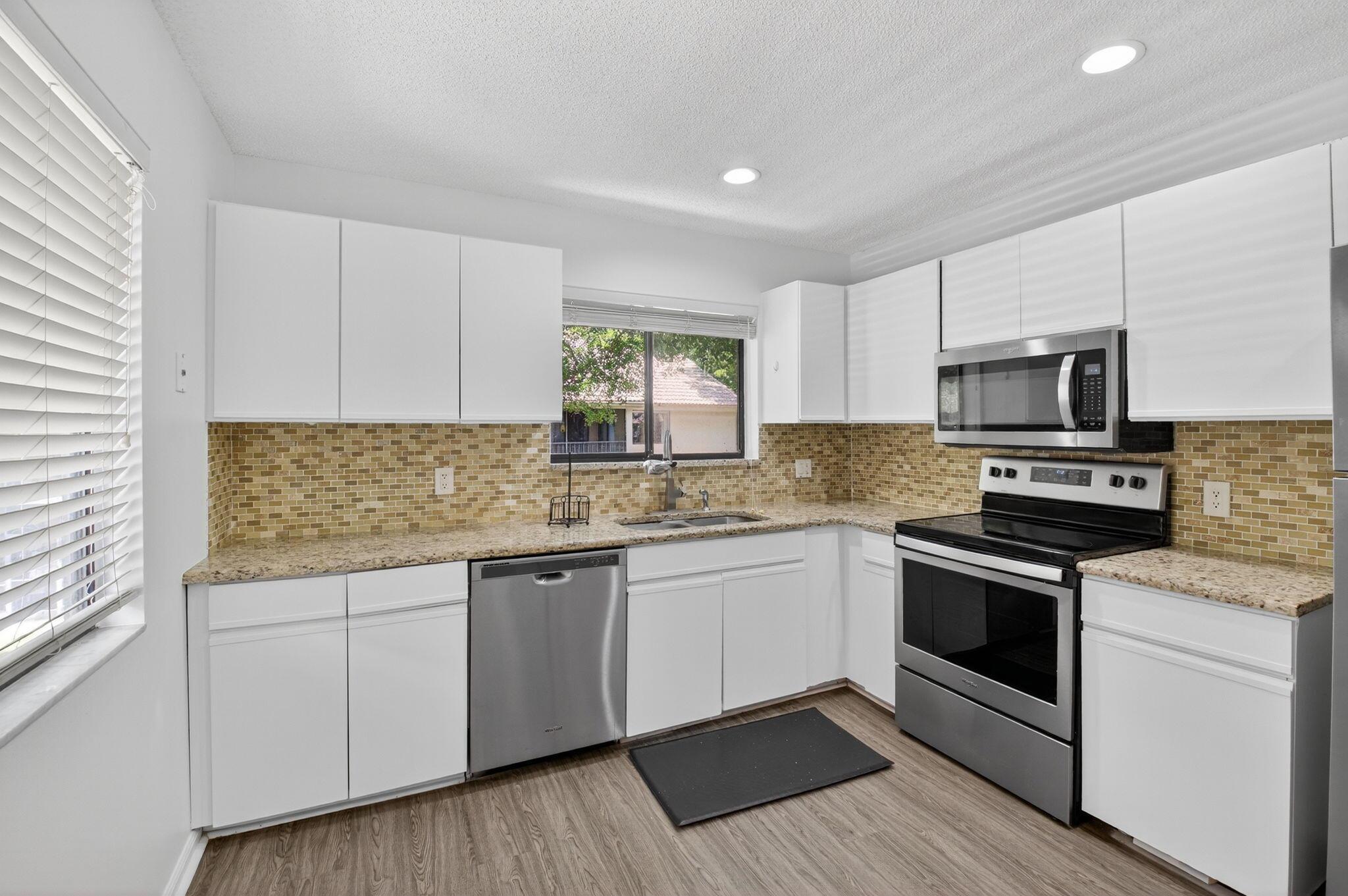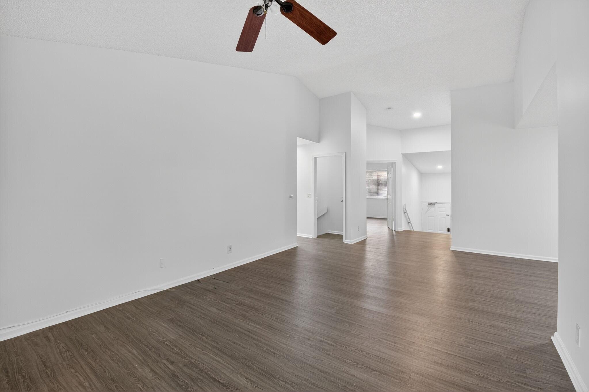 Tucked away on a quiet cul-de-sac in the all-ages Coach Houses of Town Place community, this spacious 3-bedroom, 2-bath home with a 1-car garage offers peace, privacy, and convenience. This is a highly desirable corner unit offering abundant natural light and a private front door entrance. The freshly painted interior features wood-look laminate flooring and vaulted ceilings, creating an open and airy feel throughout. Enjoy a large eat-in kitchen, separate dining area, and a comfortable living room - perfect for entertaining. Step out onto the expansive screened-in balcony and take in views of a lush green area shaded by a mature banyan tree. The stacked bedroom floor plan includes a primary suite with a walk-in closet and an ensuite bathroom featuring dual sinks and a sunken tub. Two