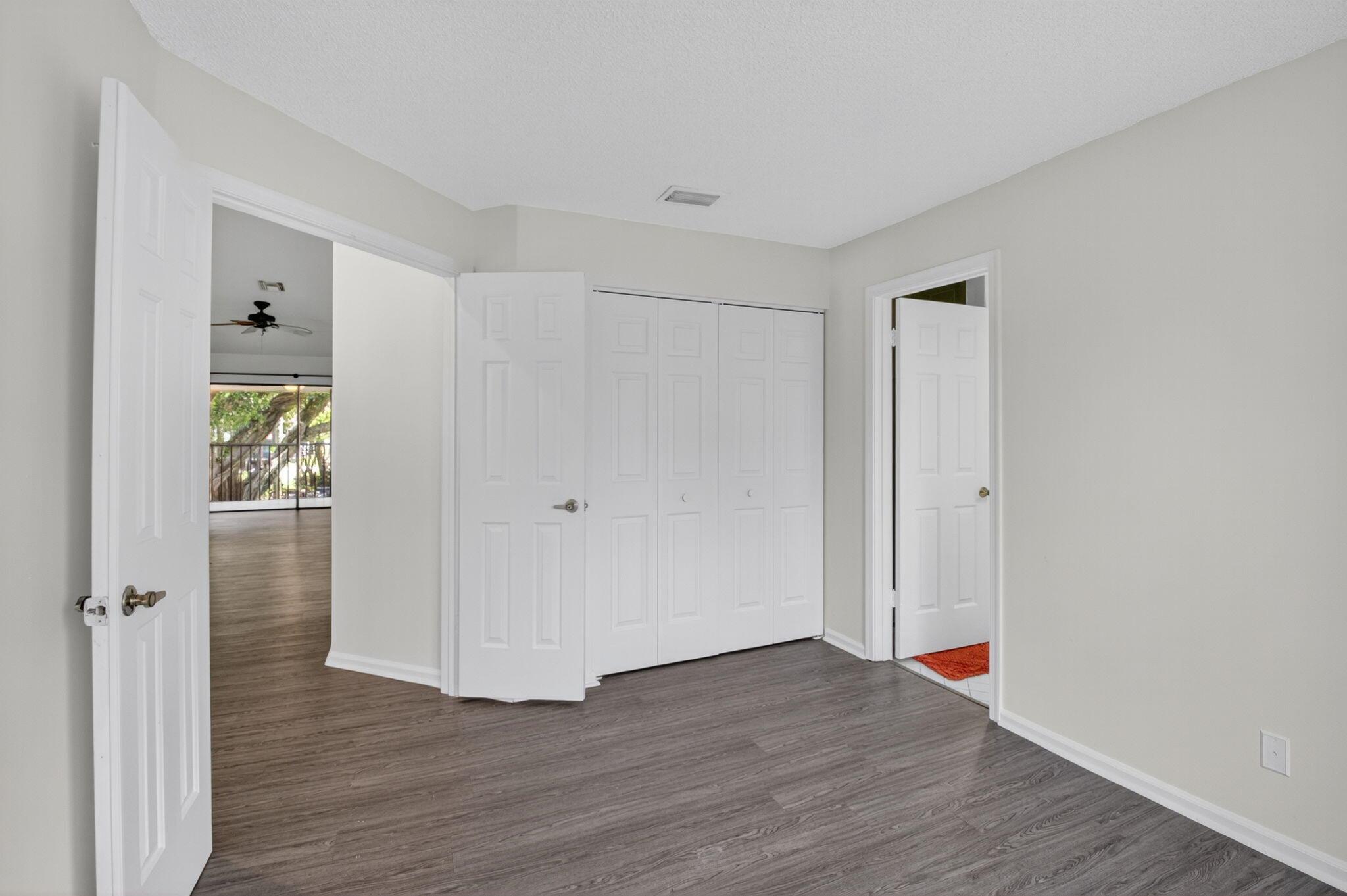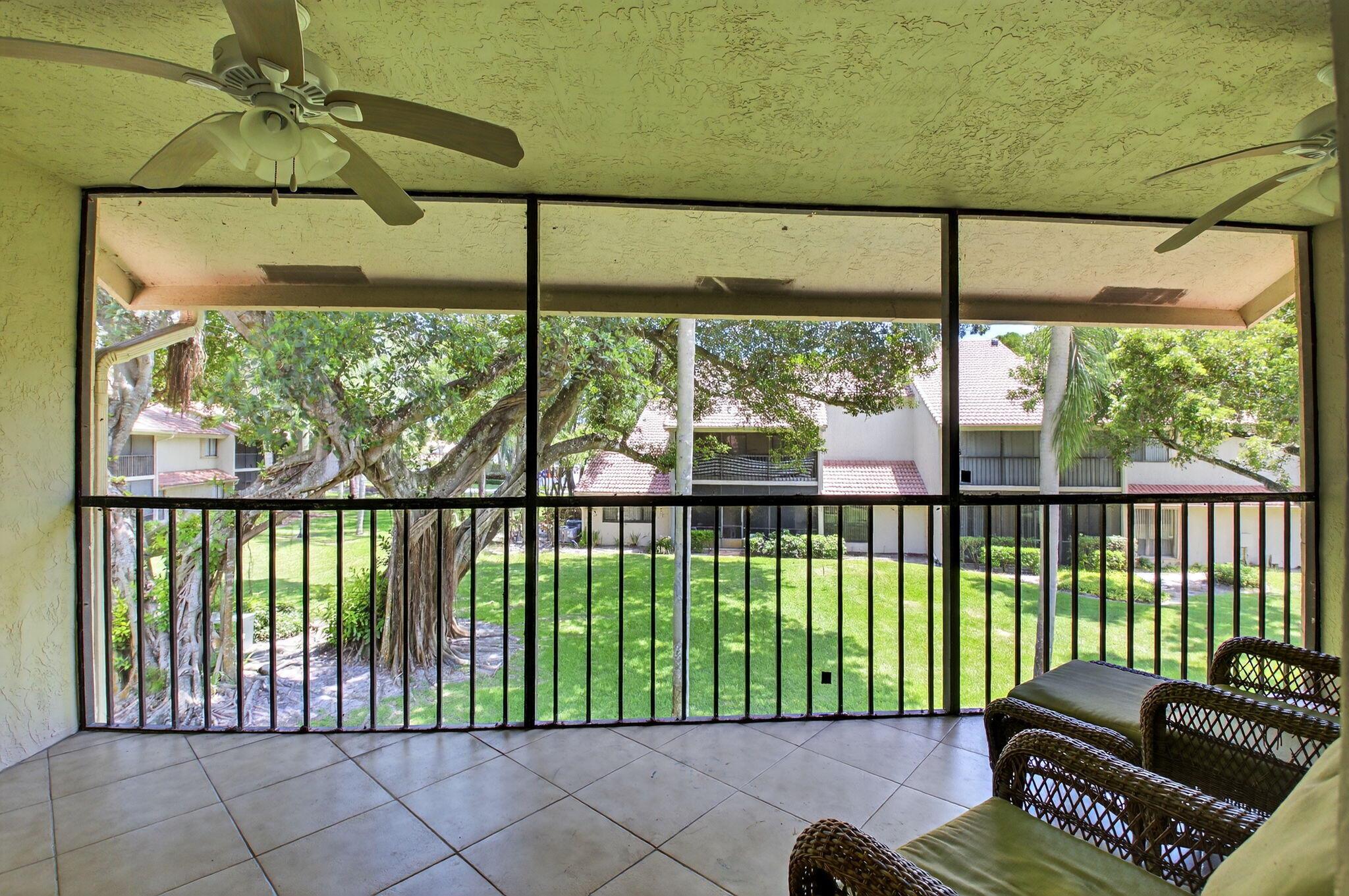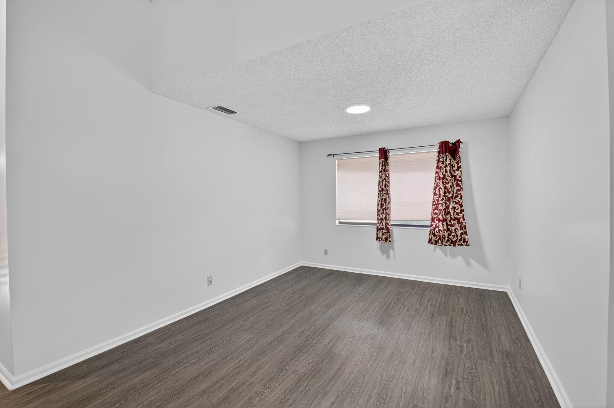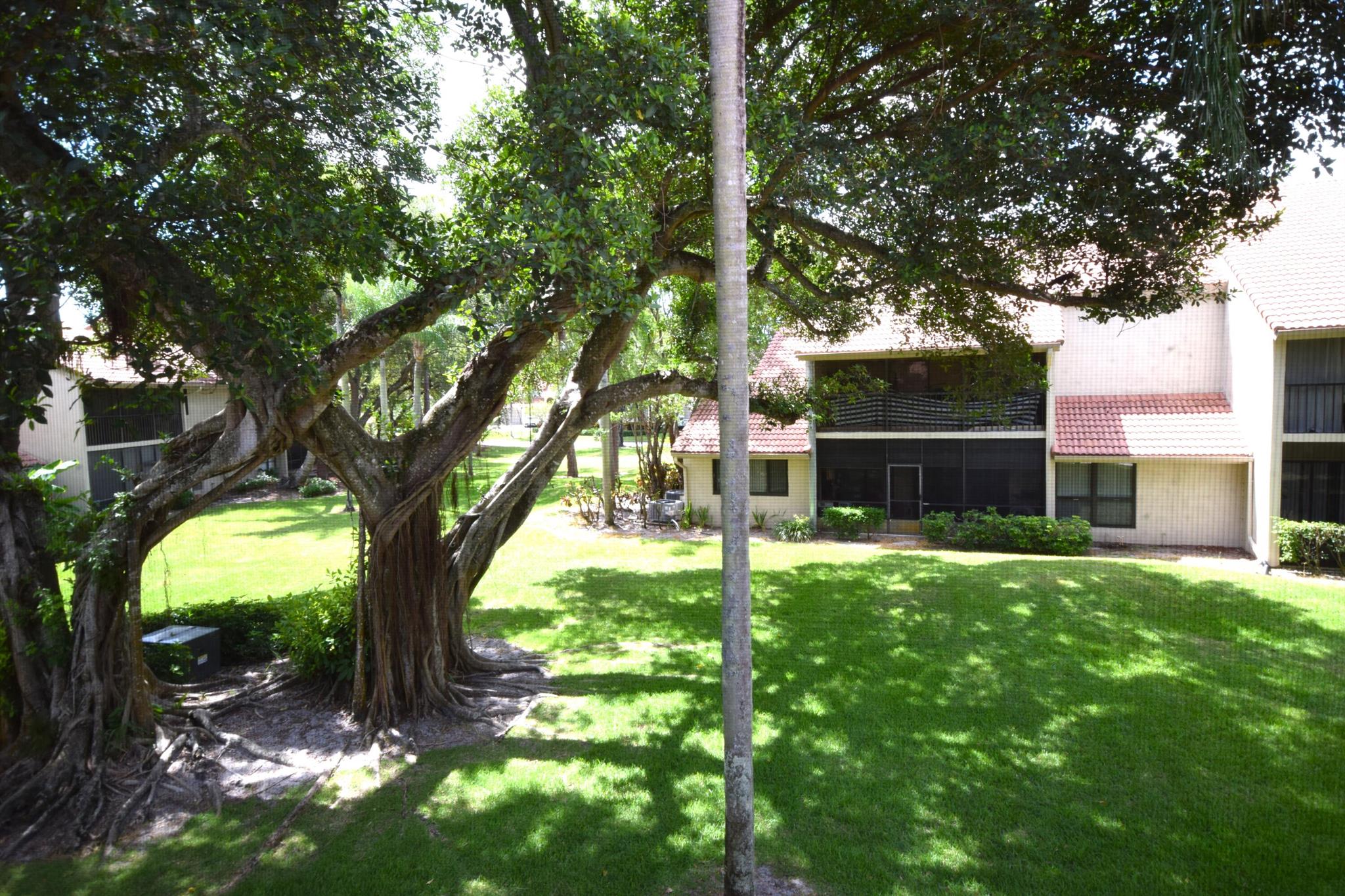 Tucked away on a quiet cul-de-sac in the all-ages Coach Houses of Town Place community, this spacious 3-bedroom, 2-bath home with a 1-car garage offers peace, privacy, and convenience. This is a highly desirable corner unit offering abundant natural light and a private front door entrance. The freshly painted interior features wood-look laminate flooring and vaulted ceilings, creating an open and airy feel throughout. Enjoy a large eat-in kitchen, separate dining area, and a comfortable living room - perfect for entertaining. Step out onto the expansive screened-in balcony and take in views of a lush green area shaded by a mature banyan tree. The stacked bedroom floor plan includes a primary suite with a walk-in closet and an ensuite bathroom featuring dual sinks and a sunken tub. Two