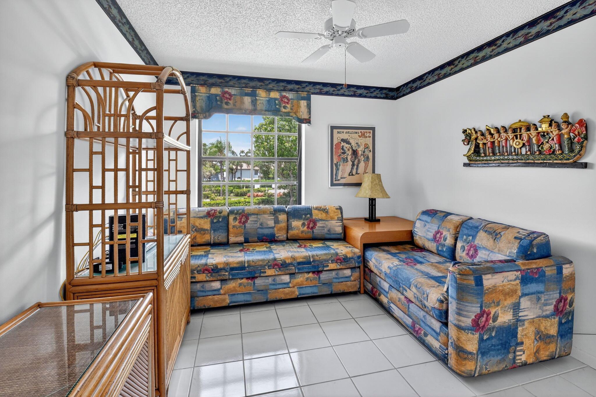 This two bedroom plus den, two full bath condo offers care-free, resort-style living. It is just a short walk from the vibrant 20,000 square foot clubhouse and an array of exceptional amenities. Access your upstairs living space using your private staircase or exclusive elevator--perfect for accessibility and ease of entry. The open, split floor plan ensures privacy and flow, with soaring ceilings creating an airy, inviting ambiance throughout. The spacious eat-in kitchen has abundant storage and a generous pantry for all your essentials. The master suite features a custom-fitted walk-in closet and a large bathroom complete with dual sinks, a vanity, and both a handicap accessible shower and a regular walk-in shower--designed to cater to every need.