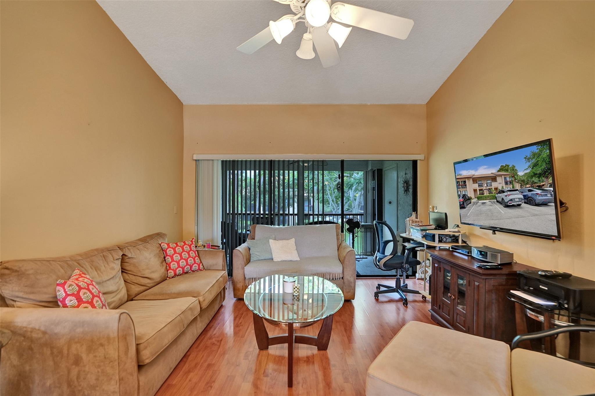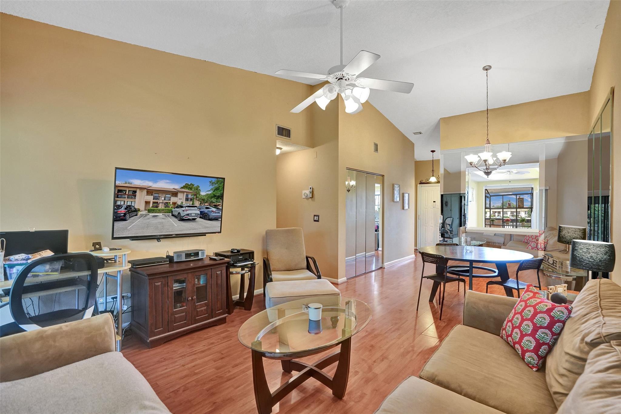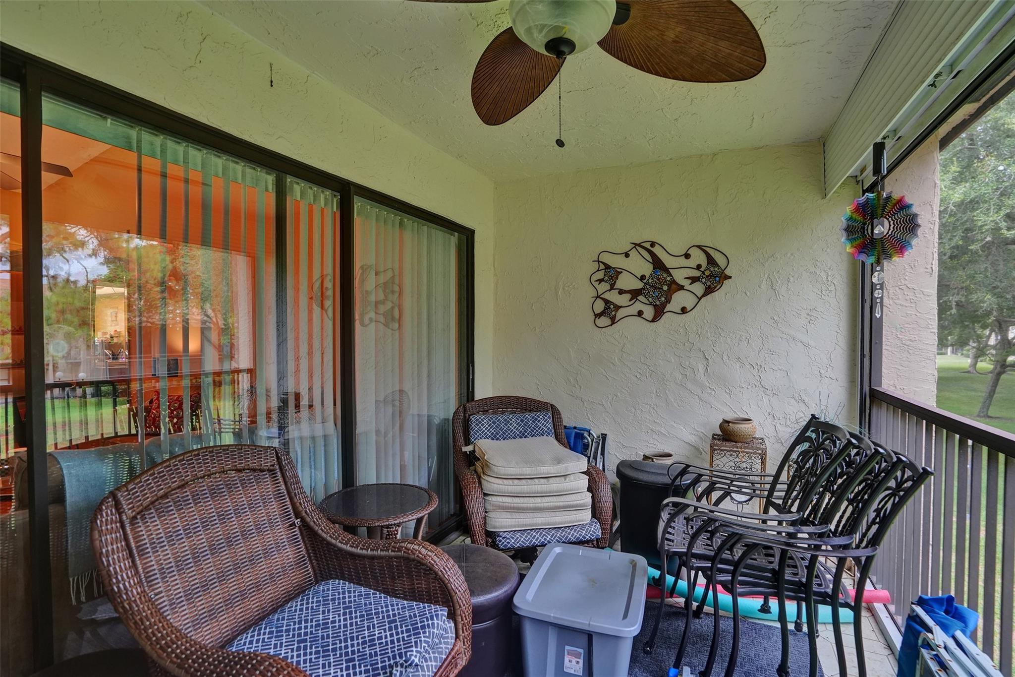 2 Bed & 2 Bath corner unit on 2nd floor w/volume ceilings. Laminate floors in main areas & carpet in bedrooms. Bright kitchen w/white appliances & atrium window. Large primary bedroom w/walk-in closet, separate vanity, & shower-only bath, plus screened balcony. Spacious 2nd bedroom. Large screened patio overlooking garden views. New washer, dryer & water heater. A/C replaced 2010. One pet allowed (under 25 pounds) & service animals welcome. No rentals allowed during first year of ownership. Building has 2024 roof, no special assessments, recently passed 40-year inspection, & association has full reserves. Amenities include large pool, hot tub, covered BBQ & seating areas, paddle ball, shuffleboard, clubhouse w/full kitchen & fitness center. Guard-gated at night w/patrol. 3% convention loan