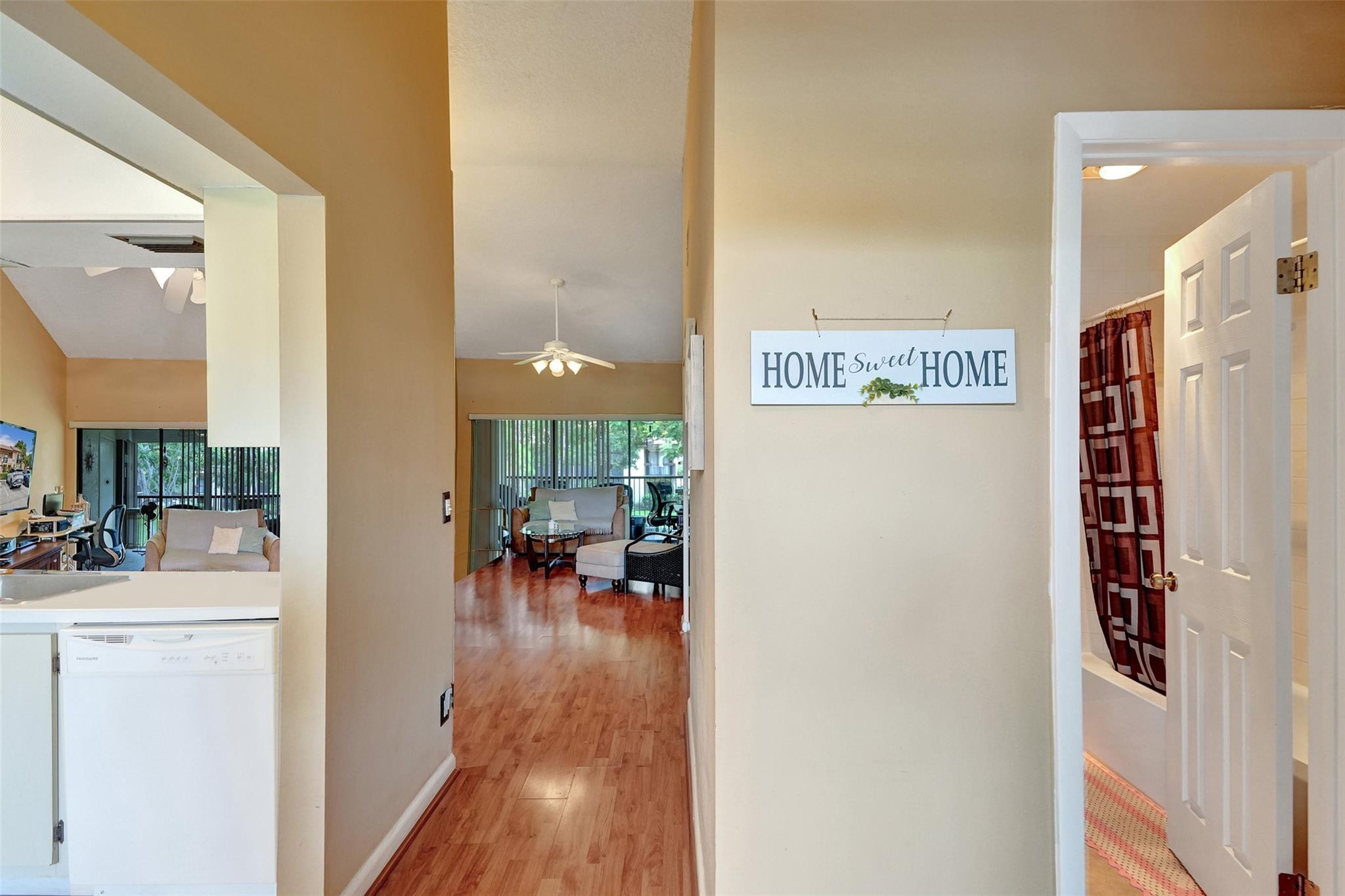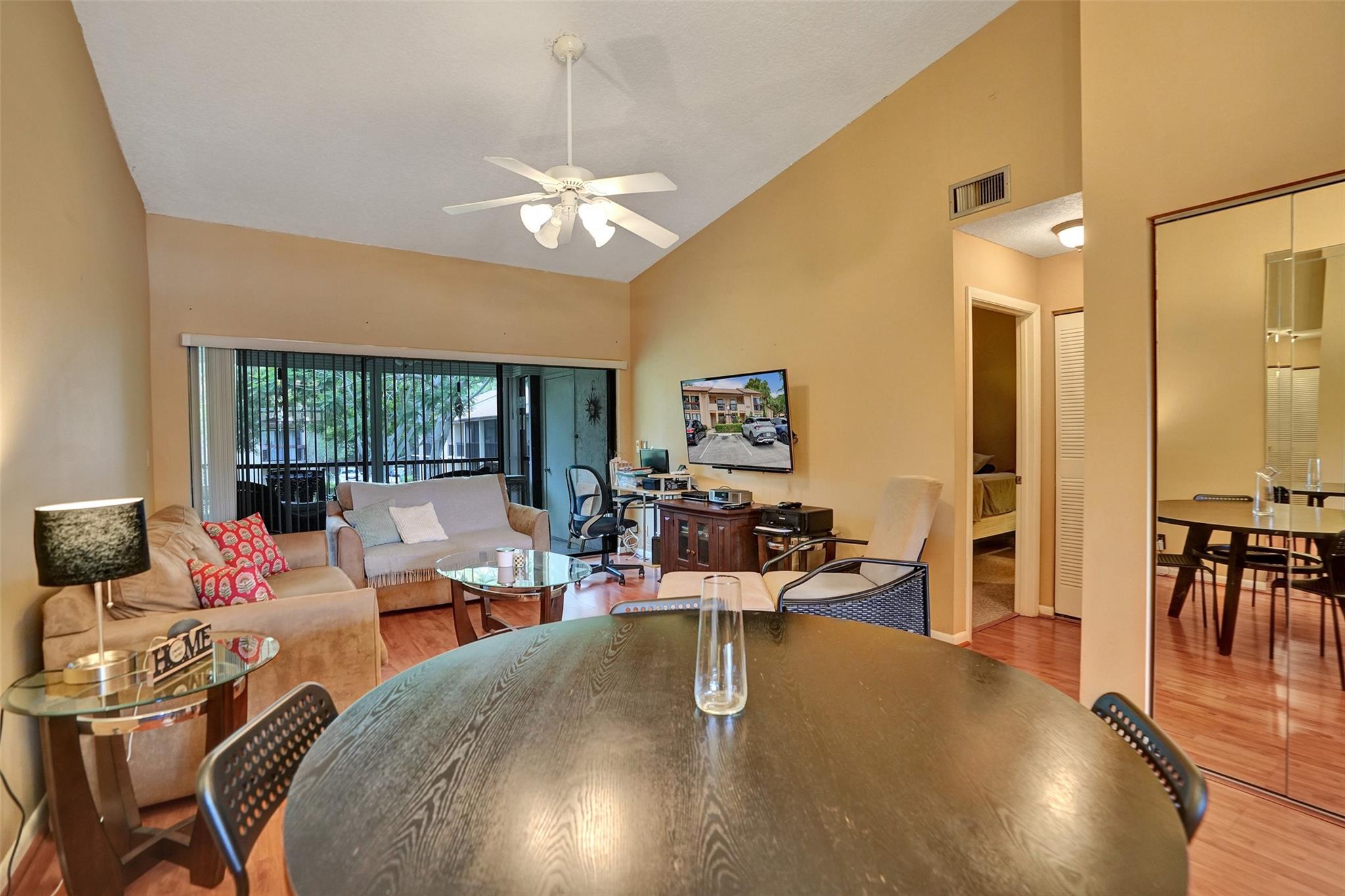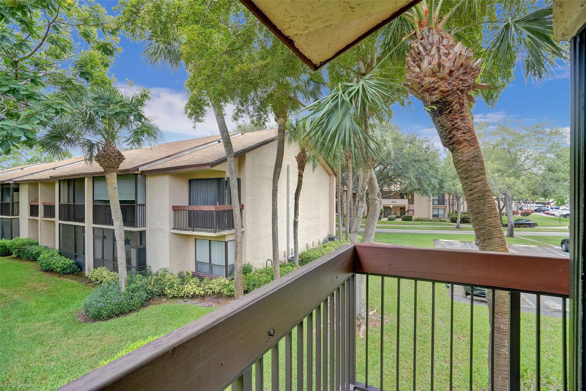 2 Bed & 2 Bath corner unit on 2nd floor w/volume ceilings. Laminate floors in main areas & carpet in bedrooms. Bright kitchen w/white appliances & atrium window. Large primary bedroom w/walk-in closet, separate vanity, & shower-only bath, plus screened balcony. Spacious 2nd bedroom. Large screened patio overlooking garden views. New washer, dryer & water heater. A/C replaced 2010. One pet allowed (under 25 pounds) & service animals welcome. No rentals allowed during first year of ownership. Building has 2024 roof, no special assessments, recently passed 40-year inspection, & association has full reserves. Amenities include large pool, hot tub, covered BBQ & seating areas, paddle ball, shuffleboard, clubhouse w/full kitchen & fitness center. Guard-gated at night w/patrol. 3% convention loan
