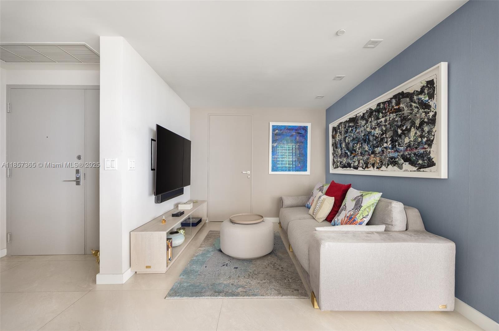 This upscale corner residence at Aria On The Bay combines luxury, comfort, and breathtaking views of the bay and Miami skyline. Featuring 3 bedrooms, a den, and 4 bathrooms, the unit offers both style and functionality. Two private elevators open to a private foyer, ensuring exclusive access and convenience. The spacious living area is enhanced by floor-to-ceiling windows, a custom drop ceiling, smart home, porcelain flooring, integrated speakers in every room and a bespoke bar area, all beautifully furnished with custom pieces by MORADA. Step out onto the expansive wrap-around terrace to enjoy panoramic city and water views. The unit features numerous high-end features. *Furniture available for separate purchase.