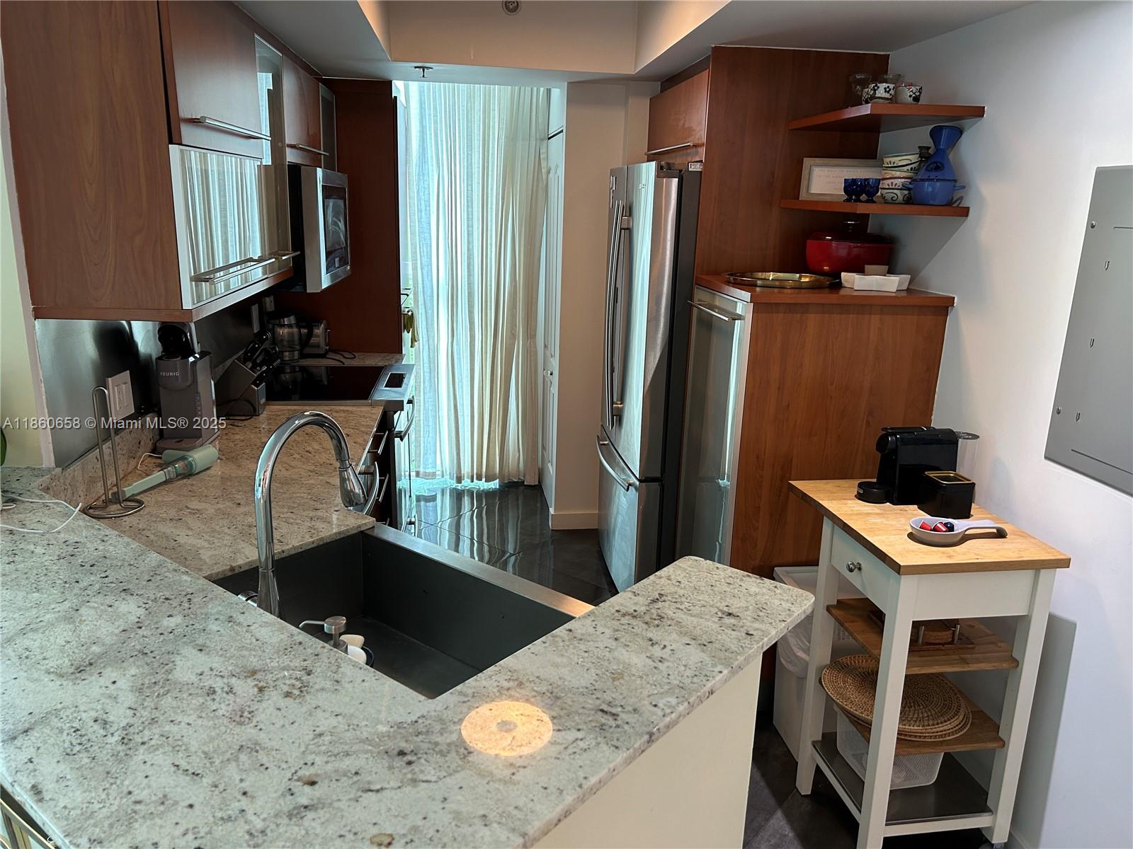 Best and most quiet line in bldg, facing tree-lined Meridian Av in the coveted South of Fifth neighborhood in Miami Beach. Move-in ready and full of natural light. 2bed/2bath 4th floor corner unit with large covered balcony with tranquil tree-top views. Beautiful open floor plan; marble floors, open kitchen with elegant granite countertops, Italian fixtures and Stainless Steal appliances. Modern vanities and cabinets in Bathrooms, great closet space, newer A/C, washer and dryer, custom made curtains and blackouts. Unit also includes one storage space. Full service bldg with 24/7 security, heated pool w/jacuzzi, fitness center, clubroom. Walk 2 blocks to beach, in heart of SOFI surrounded by restaurants, walking distance to the beach, Marina and South Pointe Park.