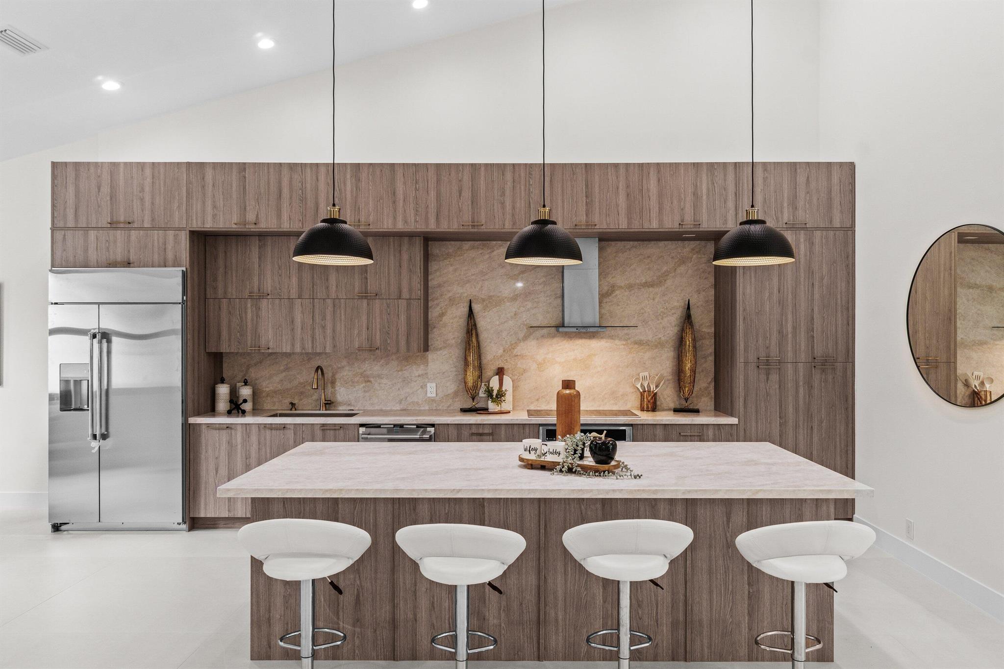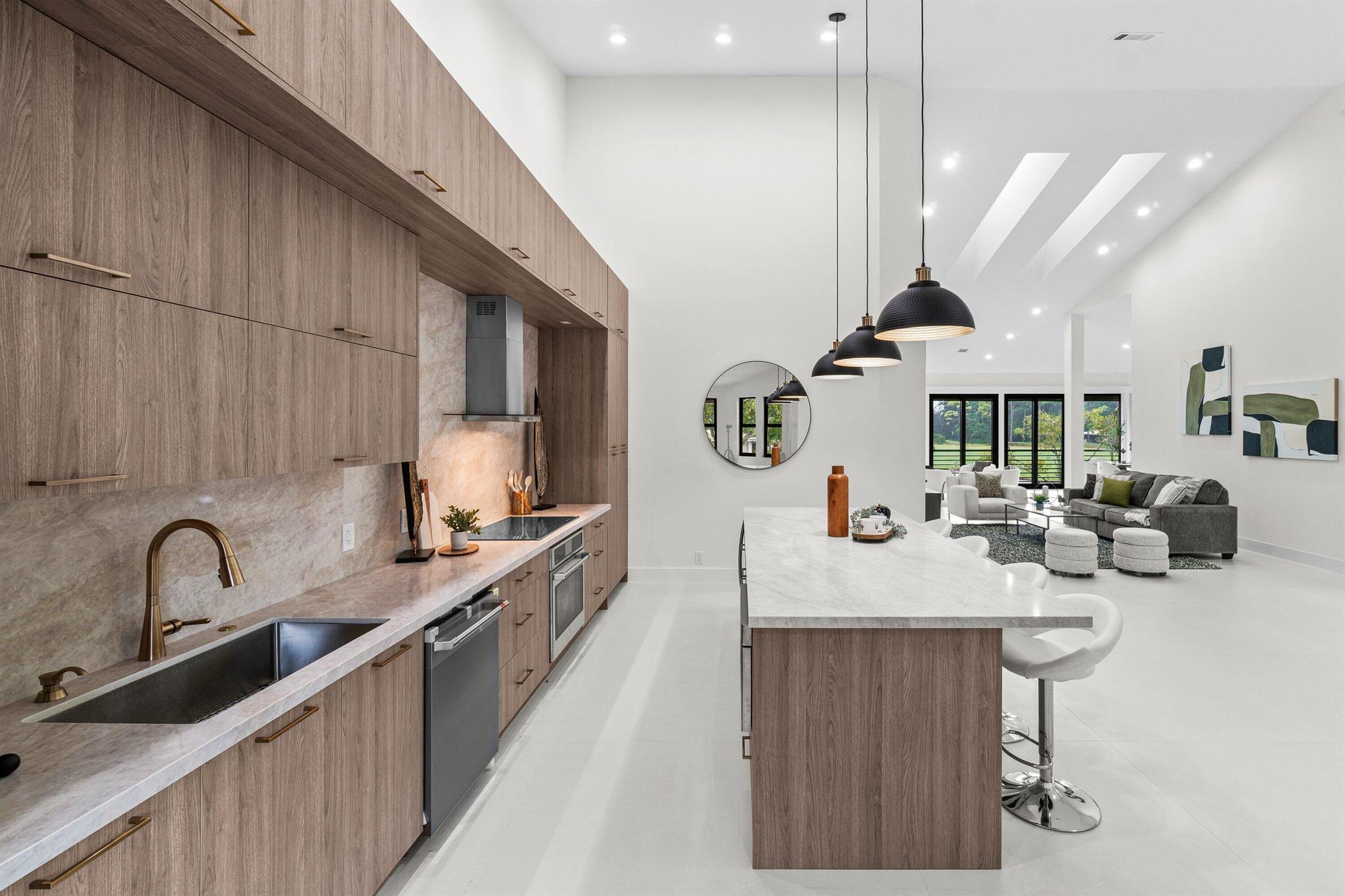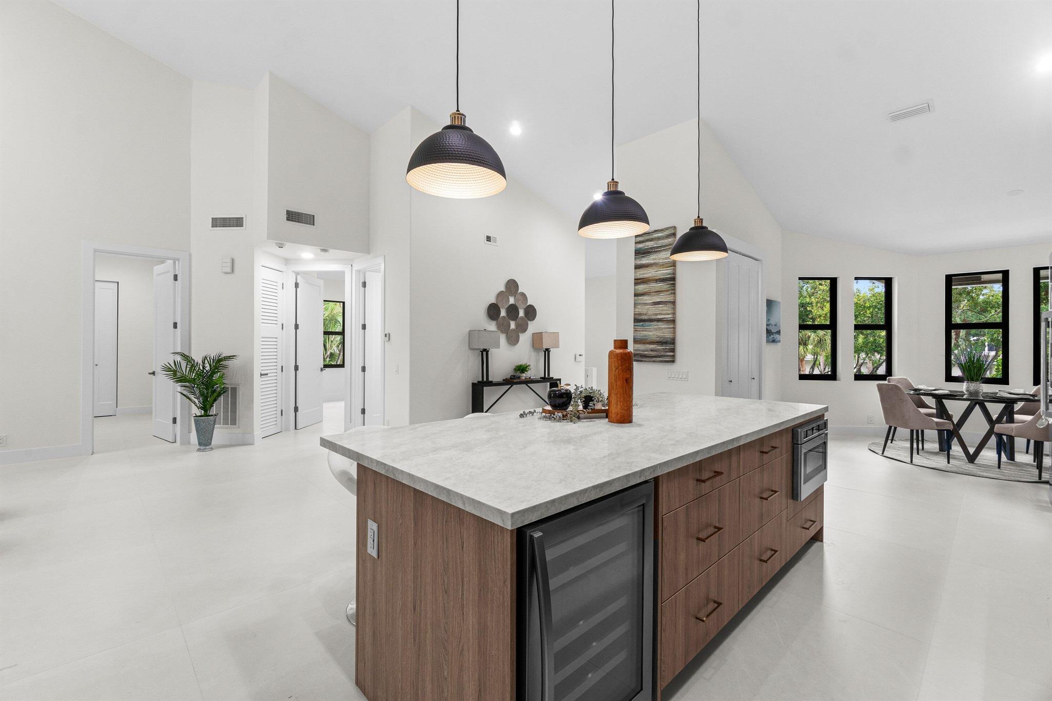 With a spectacular picture-perfect view of the lake and golf course, this fully renovated second-floor condo was just completed. The residence features 3 bedrooms, 2.5 bathrooms, and a custom designer chef's kitchen with Cafe appliances, abundant cabinet and storage space, and a wine cooler. High-end finishes include 48'' x 48'' porcelain tile flooring, impact windows and doors, LED lighting, and backlit and front-lit mirrors in the bathrooms. The home also offers the convenience of a private interior elevator, LG washer and dryer, 2024 roof, and a 2017 AC unit.