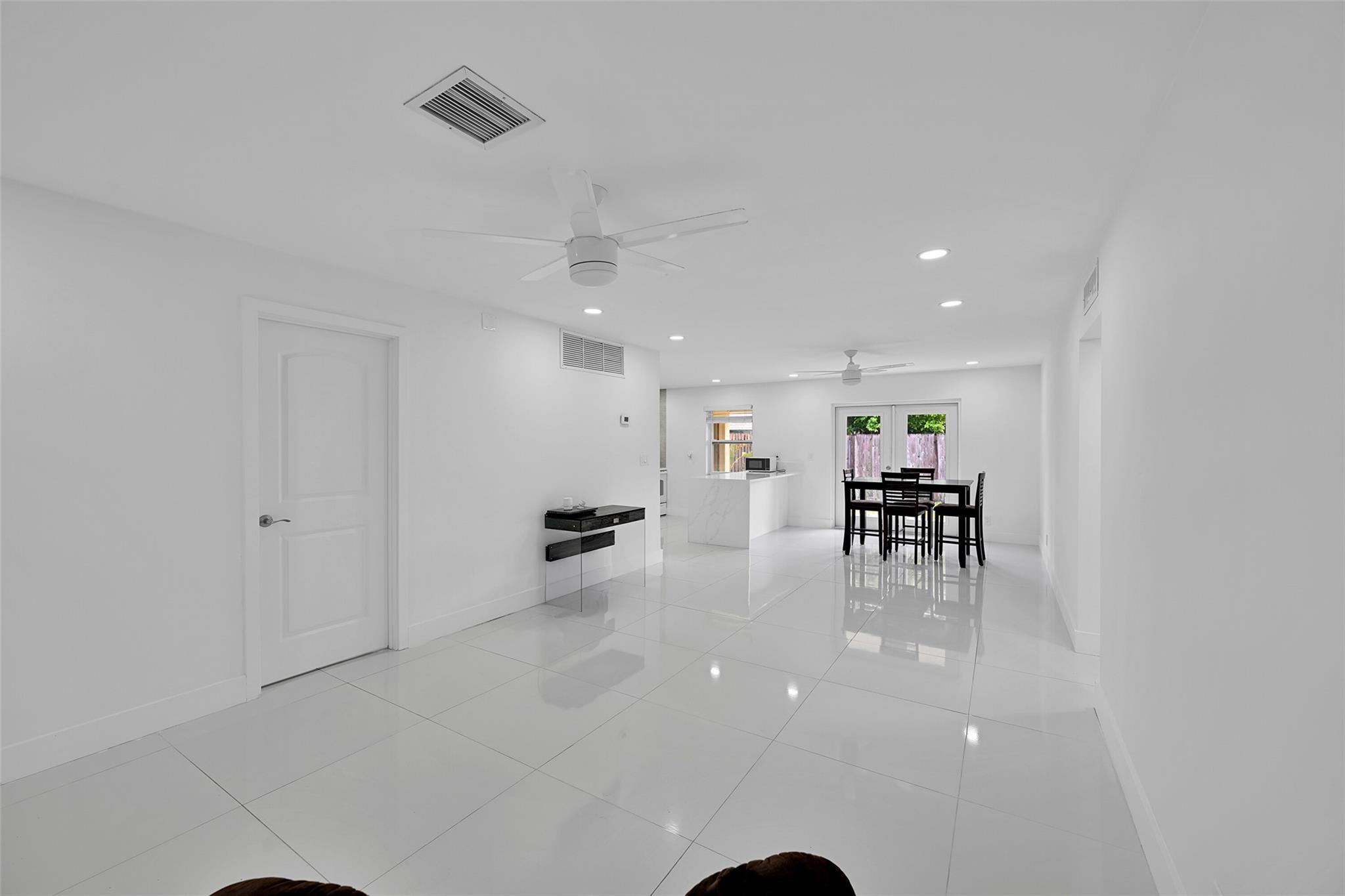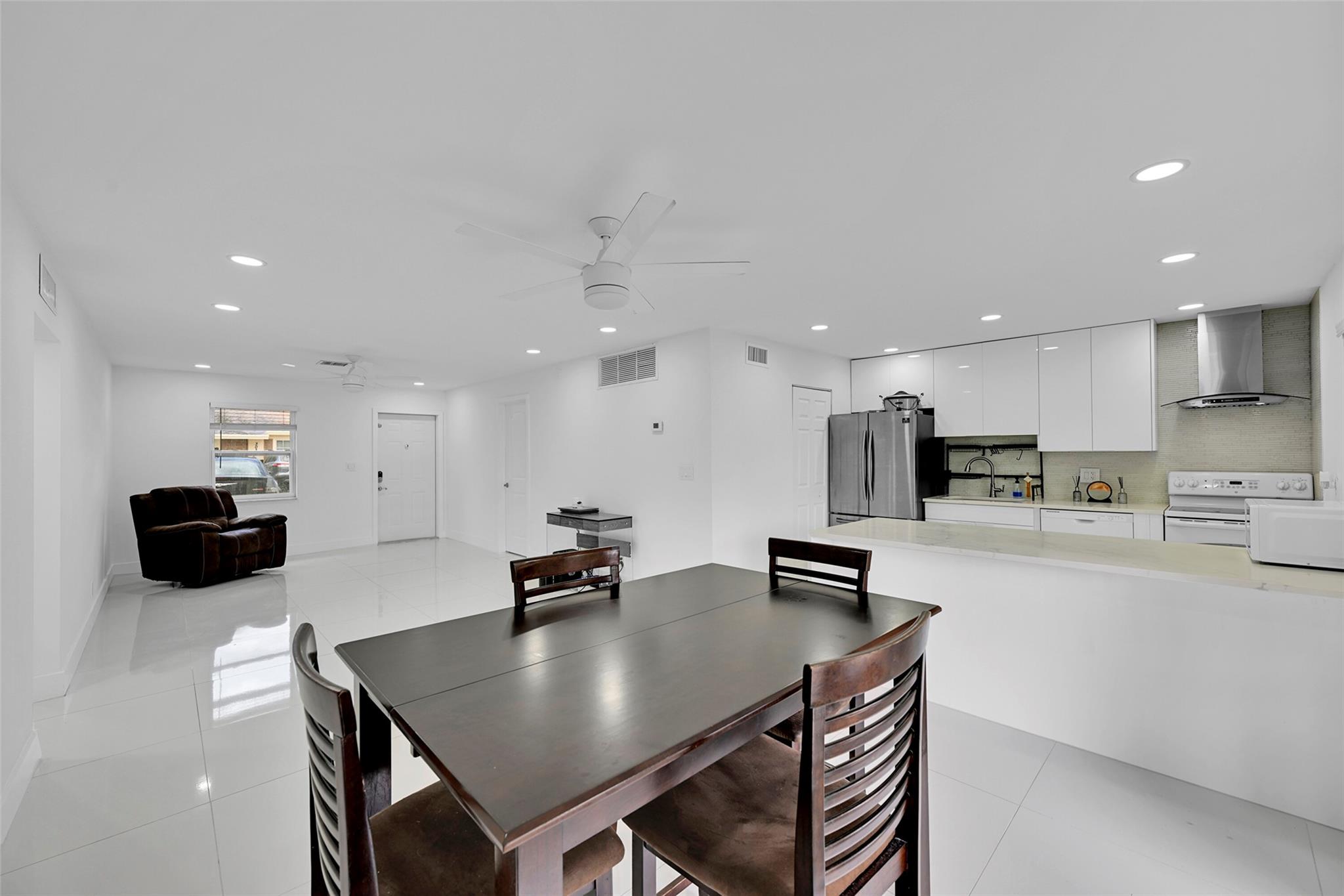 Corner unit villa featuring all impact windows and doors. Inside, you will be stunned to see all the upgrades. Porcelain tile floors, recessed lighting, and a beautifully remodeled kitchen with quartz countertops, sleek handle-less cabinetry, and a walk-in pantry. The whole property was just painted. A full-size washer and dryer, a brand-new water heater, and a 2016 A/C . Dimmer lighting throughout adds an elegant touch. Step outside to your private fenced backyard—perfect for entertaining or relaxing. The property offers two dedicated front parking spaces along with ample guest parking. FHA and VA financing allowed! Don’t miss your chance—this gem will sell fast! Association fees will decrees in 2026 to 579 per month