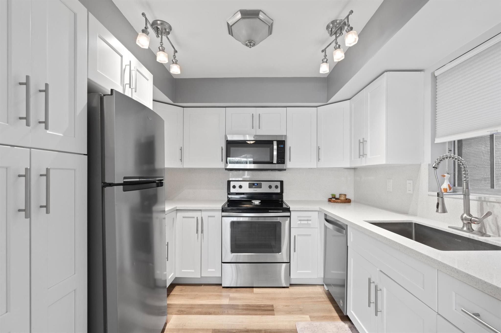 Step into modern elegance with this fully renovated 2-bedroom, 2-bath condo located in the beautifully maintained City of Atlantis. With a new roof installed in 2025 and low HOA fees, this second-floor unit offers both peace of mind and exceptional value. Inside, you'll find contemporary living at its finest, featuring a stunning kitchen with white quartz countertops, shaker-style cabinets, sleek hardware, and stainless steel appliances. Synchronized wood flooring flows seamlessly throughout the main living areas and bedrooms, creating a warm and cohesive aesthetic.The expansive primary suite includes a remodeled bath and its own private balcony--perfect for relaxing in style. Enjoy spacious outdoor living with an oversized screened-in patio that overlooks lush, mature foliage, offering