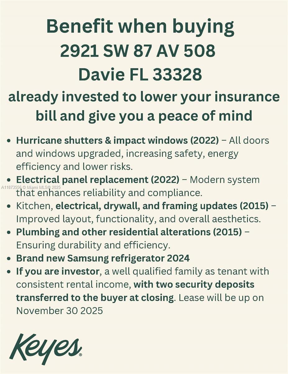 One-of-a-kind! Beautiful 2-bed/2.5-bath 2nd floor CORNER Unit condo in Harvest, w/ Samsung appliances, washer/dryer in unit, wood & ceramic floors (no carpet), breakfast area w/storage. Renovated baths, master & living room w/water views. Updates: hurricane shutters all openings (2022), brand new electrical panel, thankless water heater (2022), new Samsung fridge (2024), plumbing & structural (2015), all w/permits. Quiet community w/pool, tennis, clubhouse, water included, near NSU, FAU, Whole Foods, Starbucks, dining, well located. Assigned parking, guest spaces; 24-hr notice, pet on premises, 2 sec.deposits transfer to buyer at closing. miss this chance! New roof approved without new assessment!