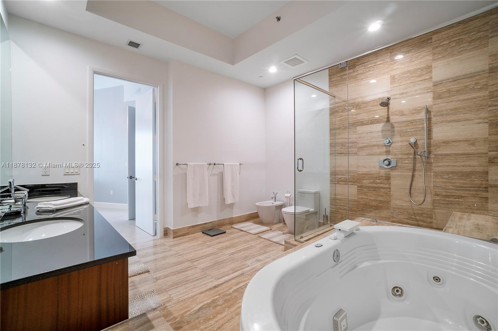 • Интерьер:BreakfastBar, Bidet, ClosetCabinetry, DualSinks, EntranceFoyer, HighCeilings, JettedTub, LivingDiningRoom, SplitBedrooms, SeparateShower, WalkInClosets
