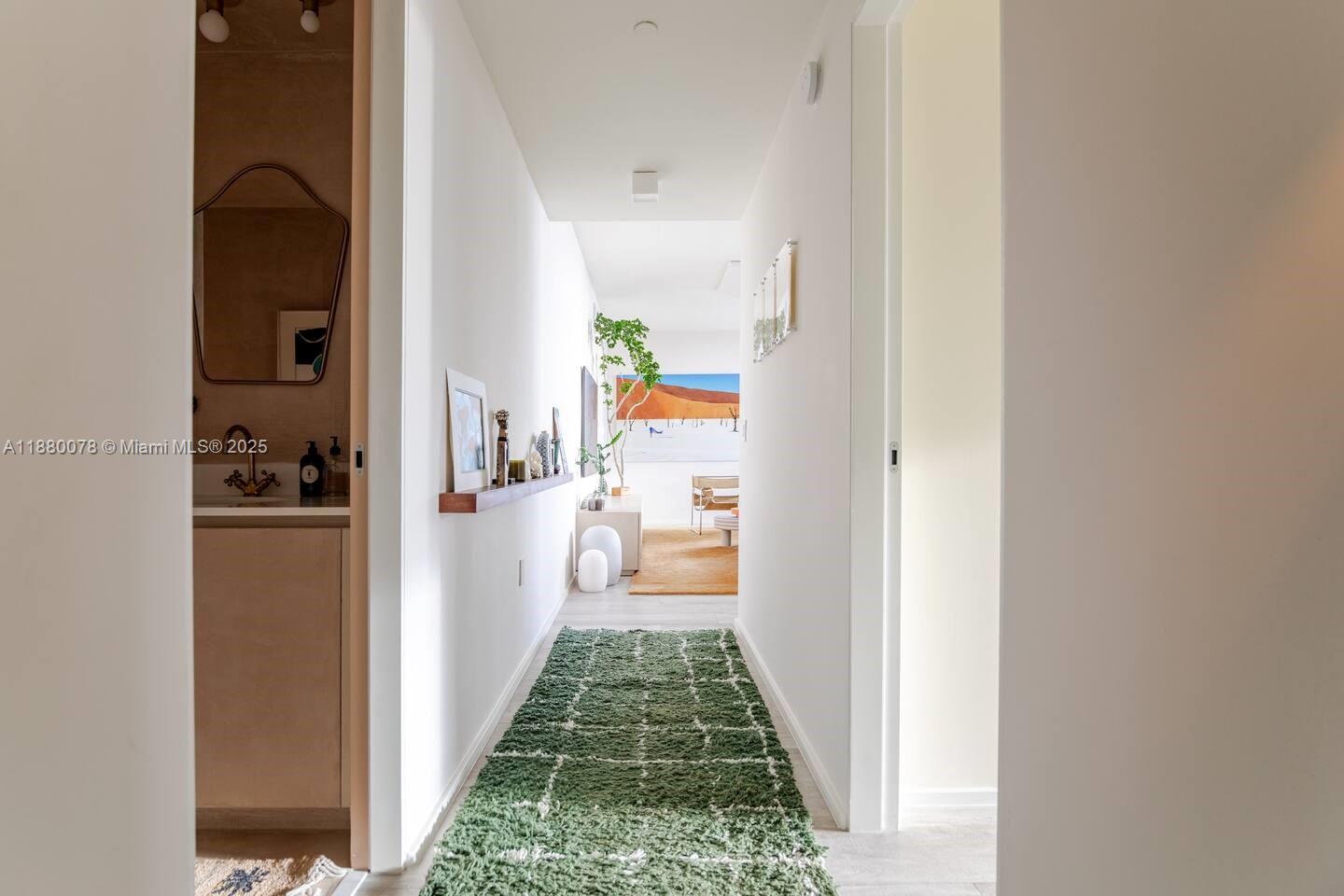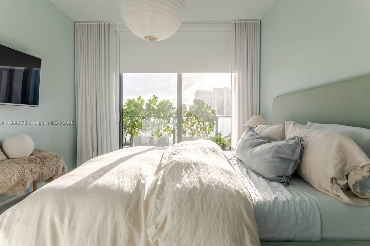 One-of-a-Kind Corner Unit with water views at Hyde Midtown. Unobstructed Biscayne Bay views in this fully renovated high-floor 3 bed / 4 bath 1,435 sq ft—floor-to-ceiling windows, corner unit at Hyde Midtown. Custom designer finishes with Italian Mireri Monticelli lighting, polished nickel and brass bathroom fixtures, built-out California Closets, and new doors. Each bath is finished in sleek microcement. The open-concept kitchen and living space with custom cabinetry, a burlwood-topped island, and direct access to your oversized balcony with bistro seating, lounge chairs, and travertine shelving, perfect for indoor/outdoor living. The main suite offers two closets, a spa-inspired bath, dual vanities, & an oversized shower. Comes with 2 deeded parking spots & a private storage unit.