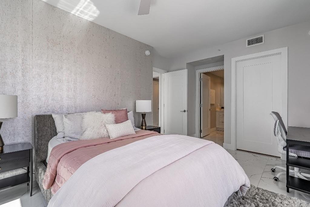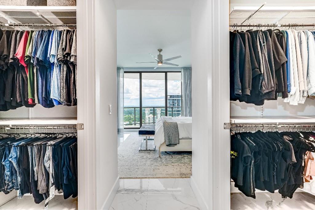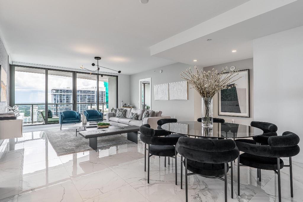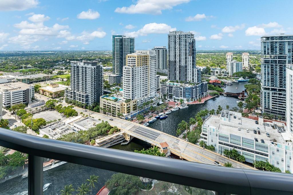 Sophisticated 30th floor residence in the premier 100 Las Olas tower, offering exceptional river, city, and skyline views from every room. This 2-bedroom + den, 3-bath layout is one of the building’s most desirable floor plans, featuring 9’ floor-to-ceiling windows and an expansive 550 sq ft wraparound terrace. Interior upgrades include porcelain tile flooring, quartz countertops, motorized blinds, custom closets, designer lighting, and built-ins. The flexible den functions as an office or optional 3rd bedroom. Two premium side-by-side EV-ready parking spaces included. Enjoy full-service luxury living with high-end amenities and immediate access to the dining, shopping, and energy of Las Olas.