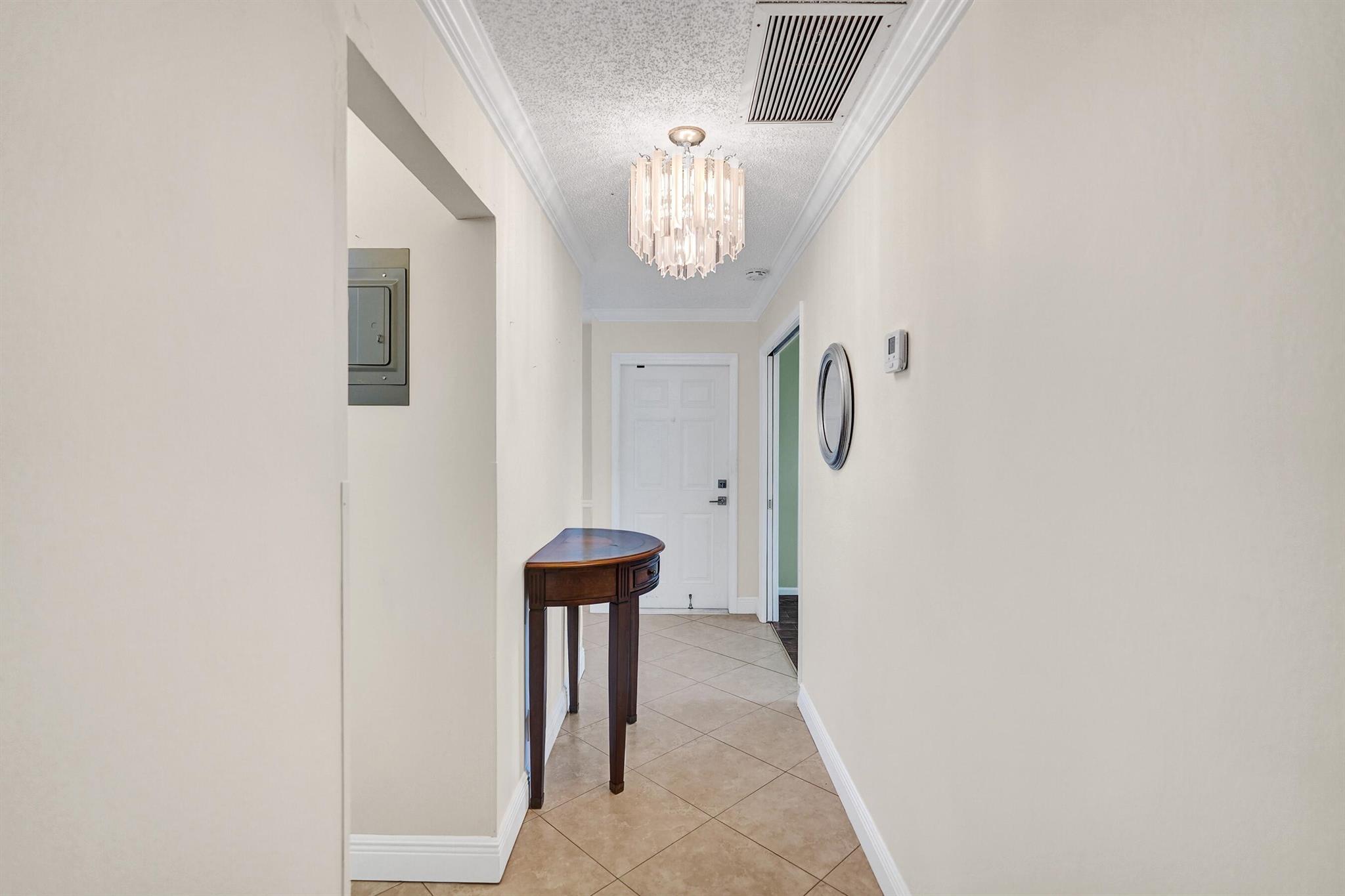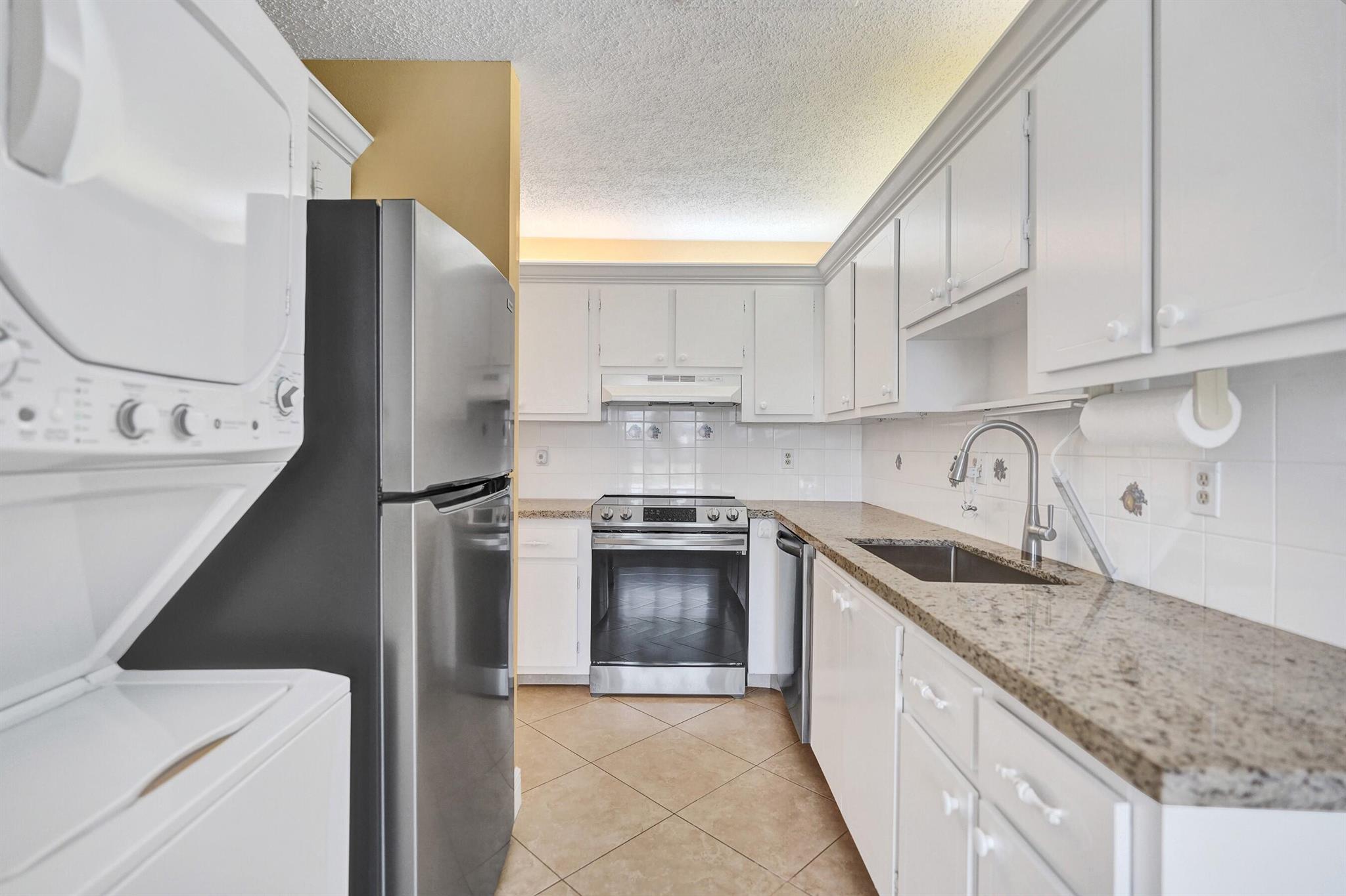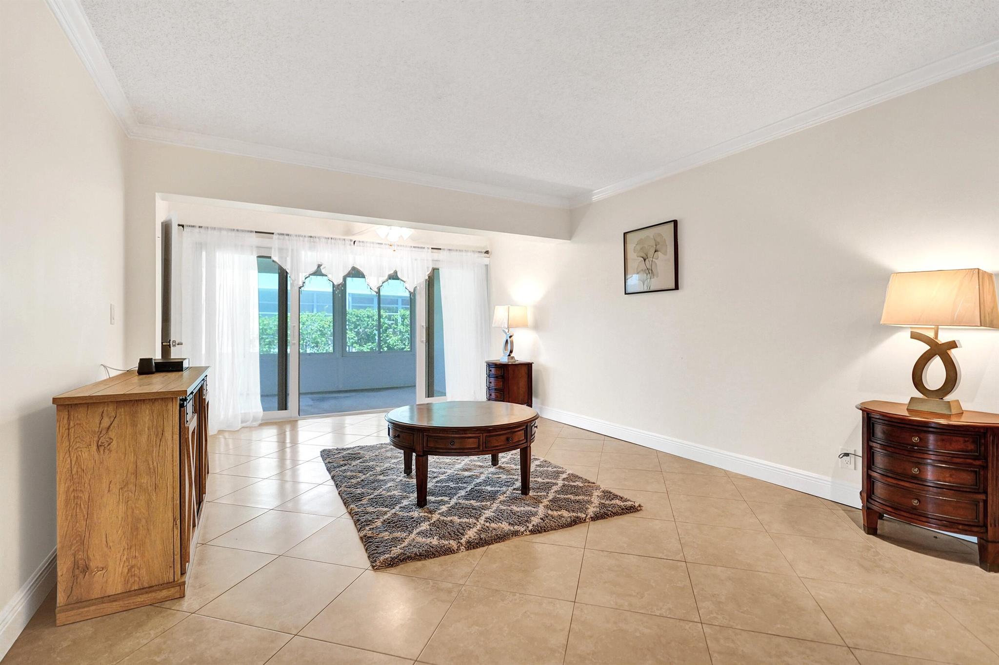 PINES OF DELRAY. Rarely available 1st floor corner with 3 distinct outdoor patios! This 2 - bedroom -2 bath residence spans an impressive 1167 sqft under air that's protected by ALL 2022 installed impact glass windows and impact sliding doors. There's sliding door access onto the 2022-built 16 x 10 screened patio with 4 sets of 58'' tall slider windows. Plus there's the 15 x 10 open patio and the 13 x 8 under roof patio. The interior also boasts 17.5 x 17.5 ceramic tile in main living areas and PERGO laminate planks in master bedroom. This is complemented by contemporary wall colors, mostly 5.6'' baseboards, crown molding and tract lighting in the living room/dining area. The ''smooth ceiling'' kitchen boasts a granite countertop, tile backsplash, 9'' deep s/s sink and 2022/23 appliances