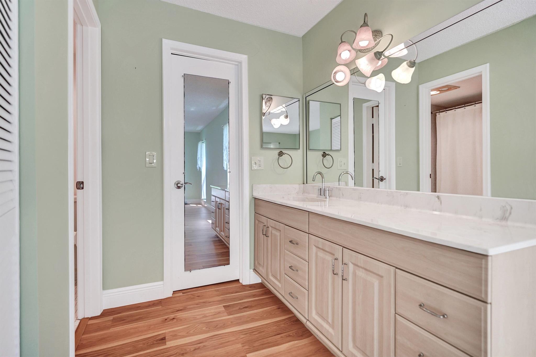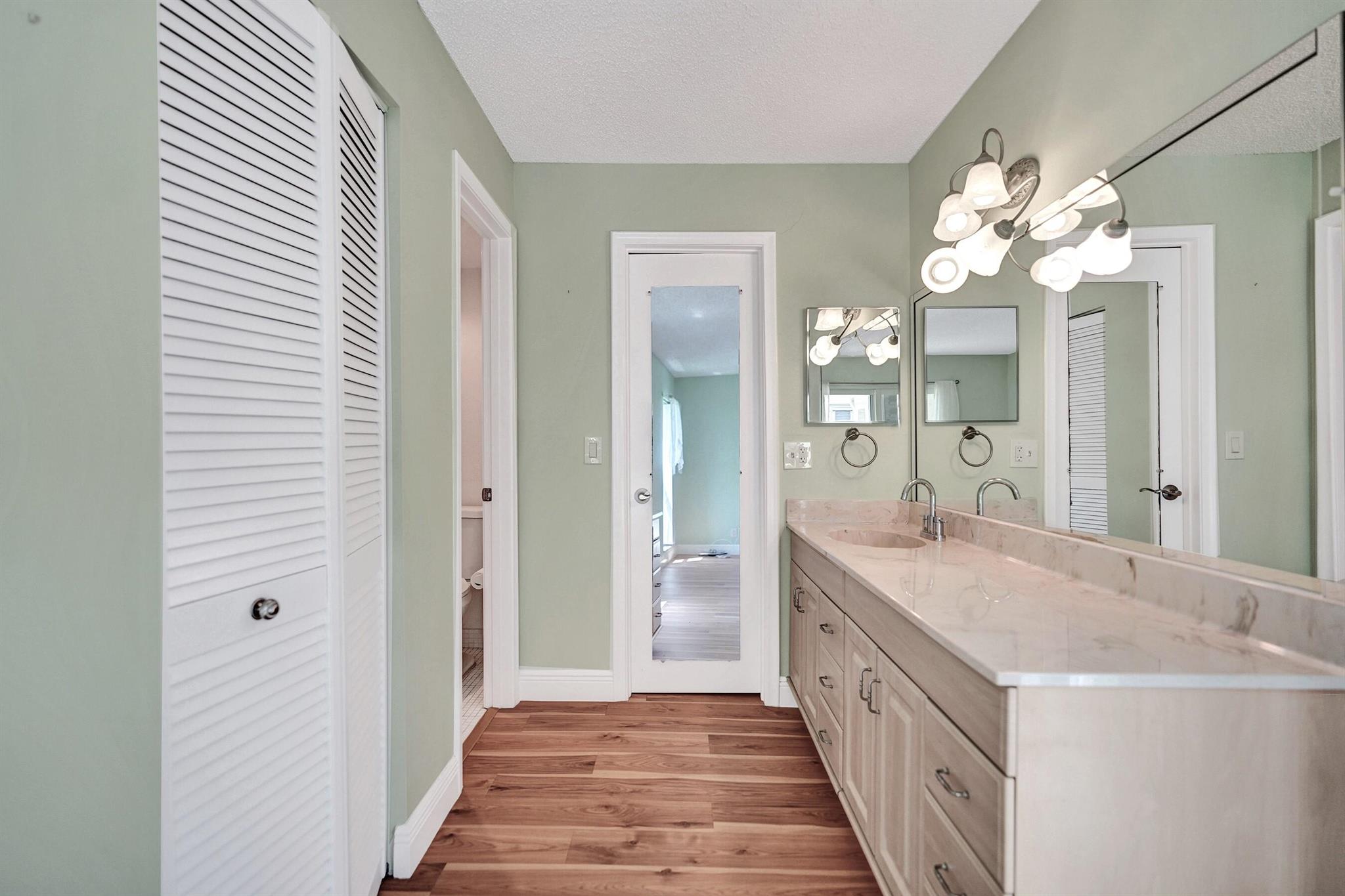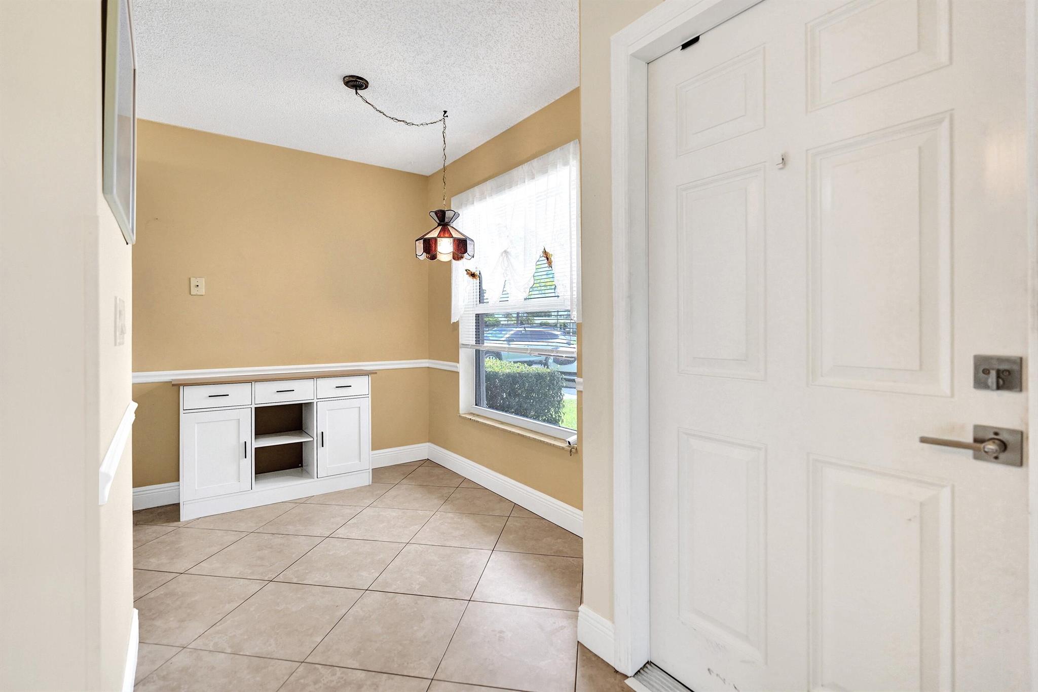 PINES OF DELRAY. Rarely available 1st floor corner with 3 distinct outdoor patios! This 2 - bedroom -2 bath residence spans an impressive 1167 sqft under air that's protected by ALL 2022 installed impact glass windows and impact sliding doors. There's sliding door access onto the 2022-built 16 x 10 screened patio with 4 sets of 58'' tall slider windows. Plus there's the 15 x 10 open patio and the 13 x 8 under roof patio. The interior also boasts 17.5 x 17.5 ceramic tile in main living areas and PERGO laminate planks in master bedroom. This is complemented by contemporary wall colors, mostly 5.6'' baseboards, crown molding and tract lighting in the living room/dining area. The ''smooth ceiling'' kitchen boasts a granite countertop, tile backsplash, 9'' deep s/s sink and 2022/23 appliances